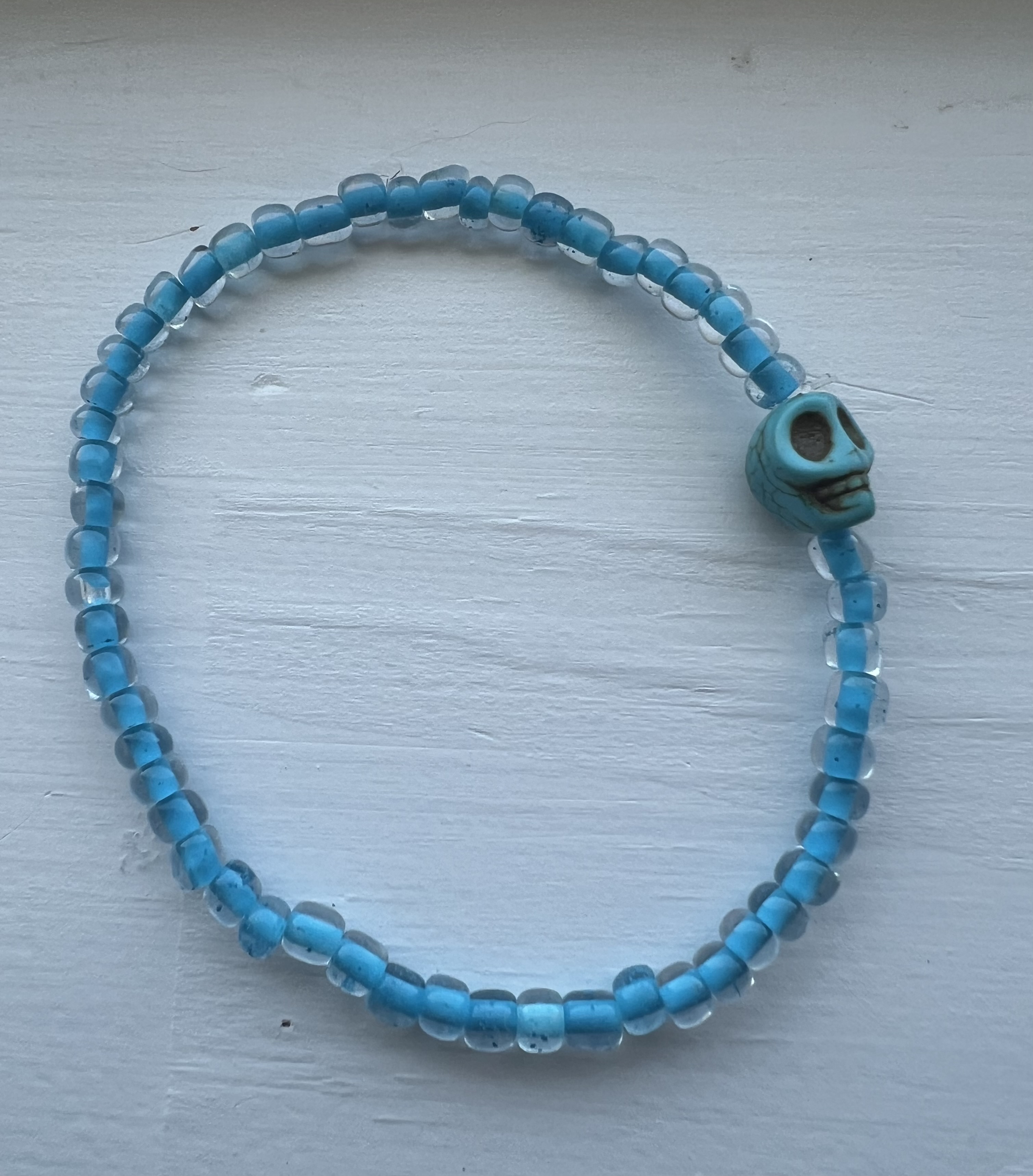 Hand-strung with glossy turquoise glass beads and accented by a carved turquoise skull, this bracelet blends cool ocean tones with a playful hint of mystery. Its lightweight, stretchy design makes it easy to slip on and perfect for everyday wear — whether you’re stacking it with other favorites or letting it stand alone as a statement piece.