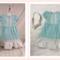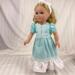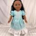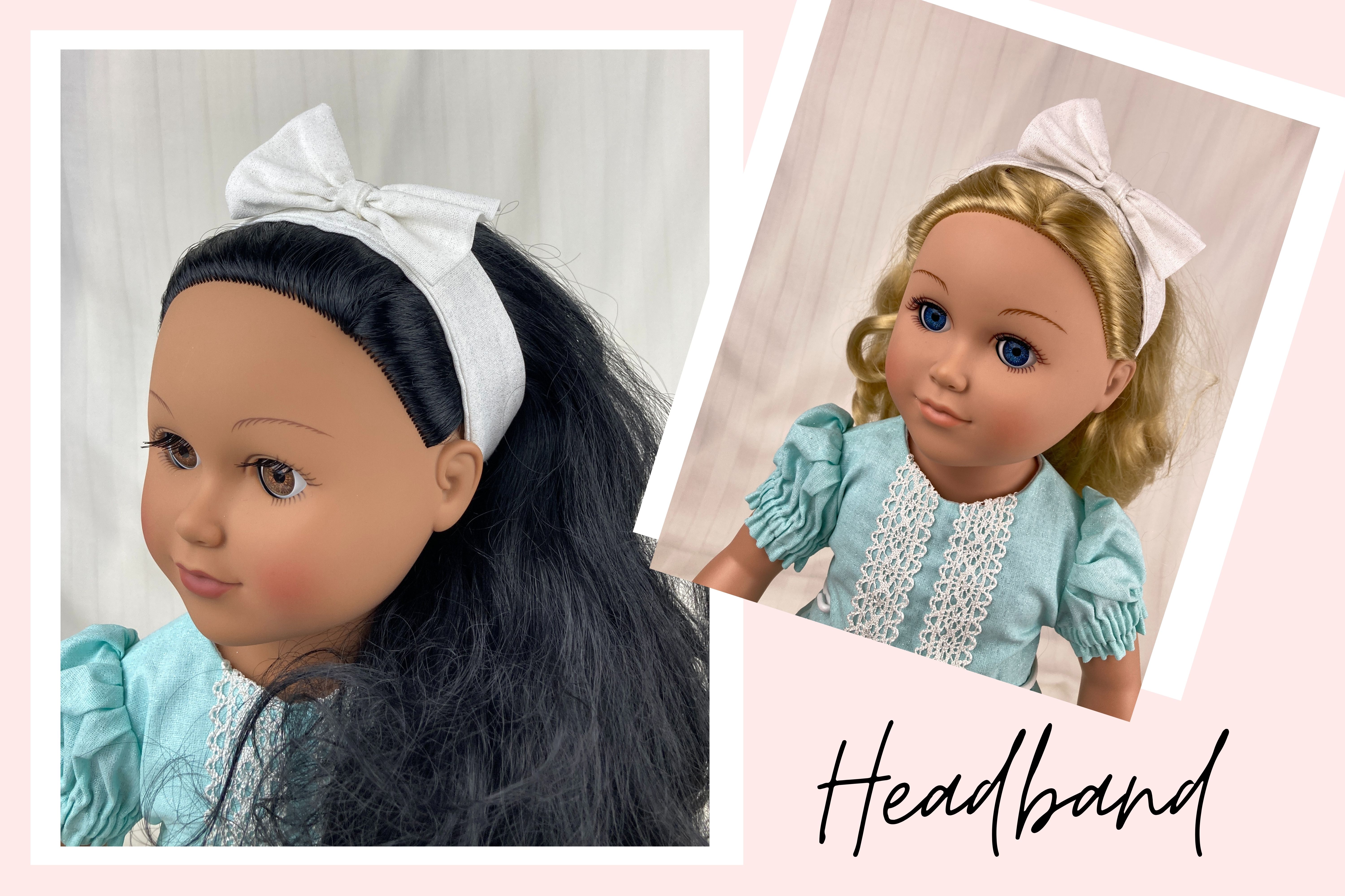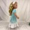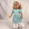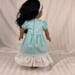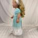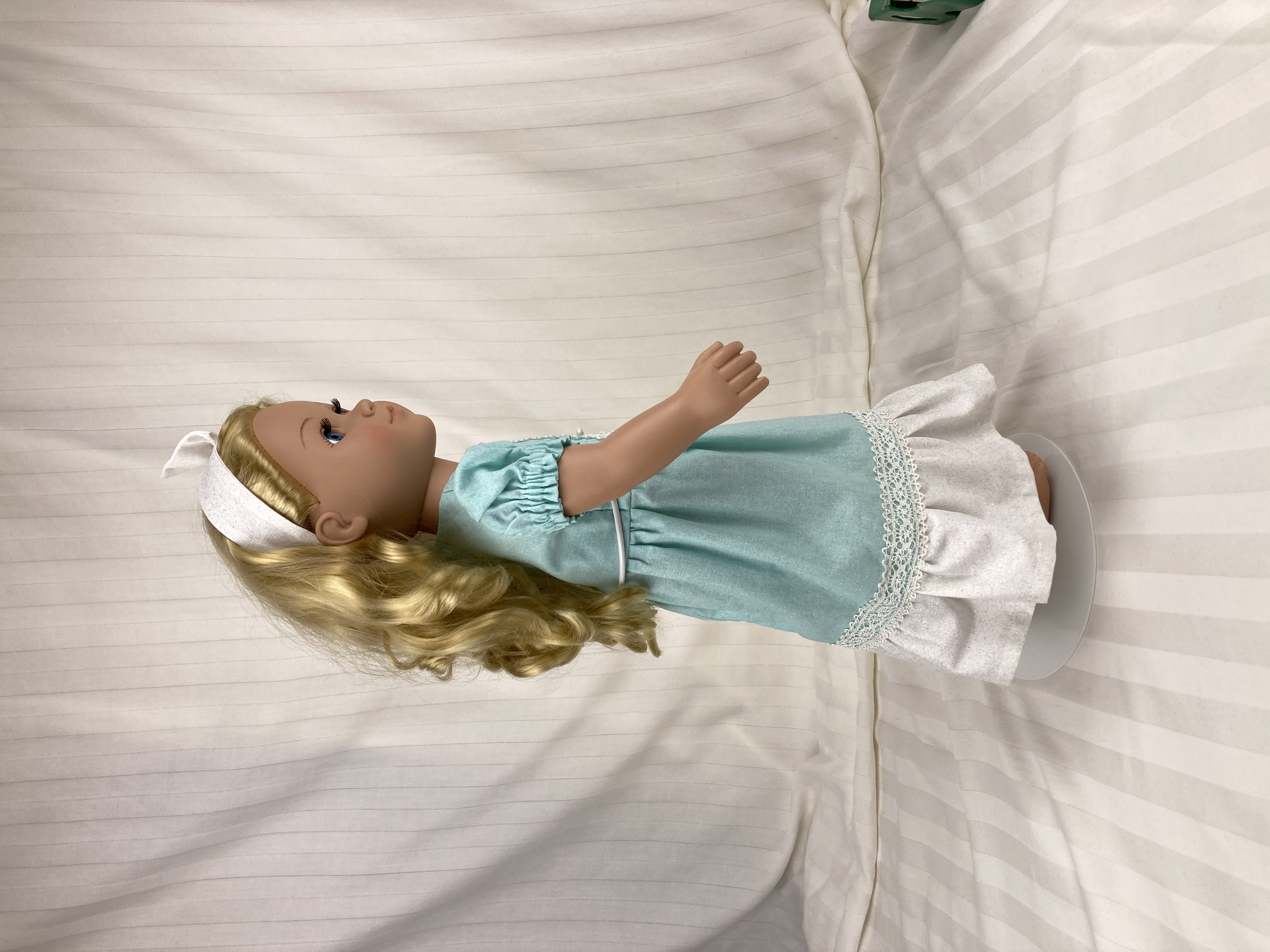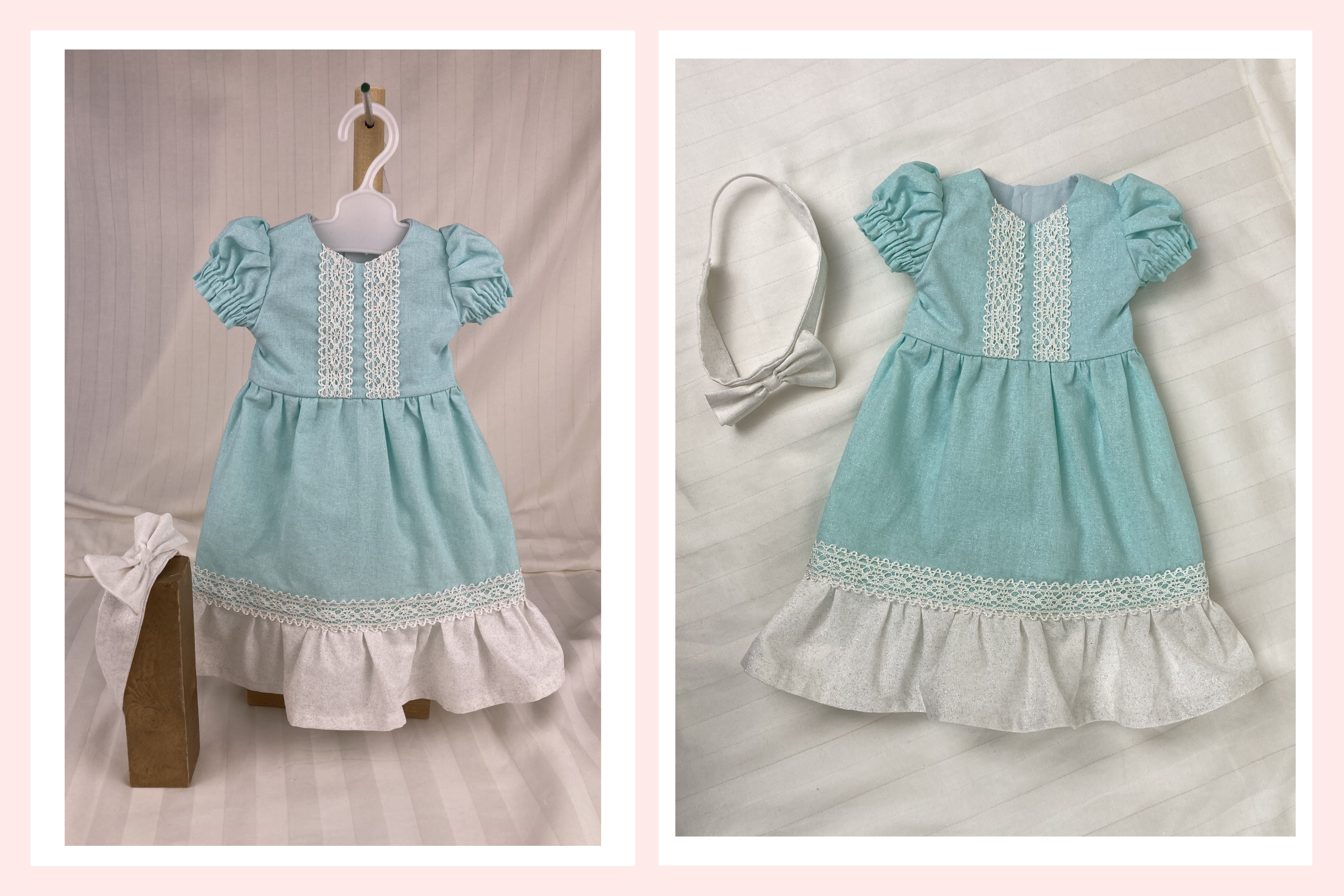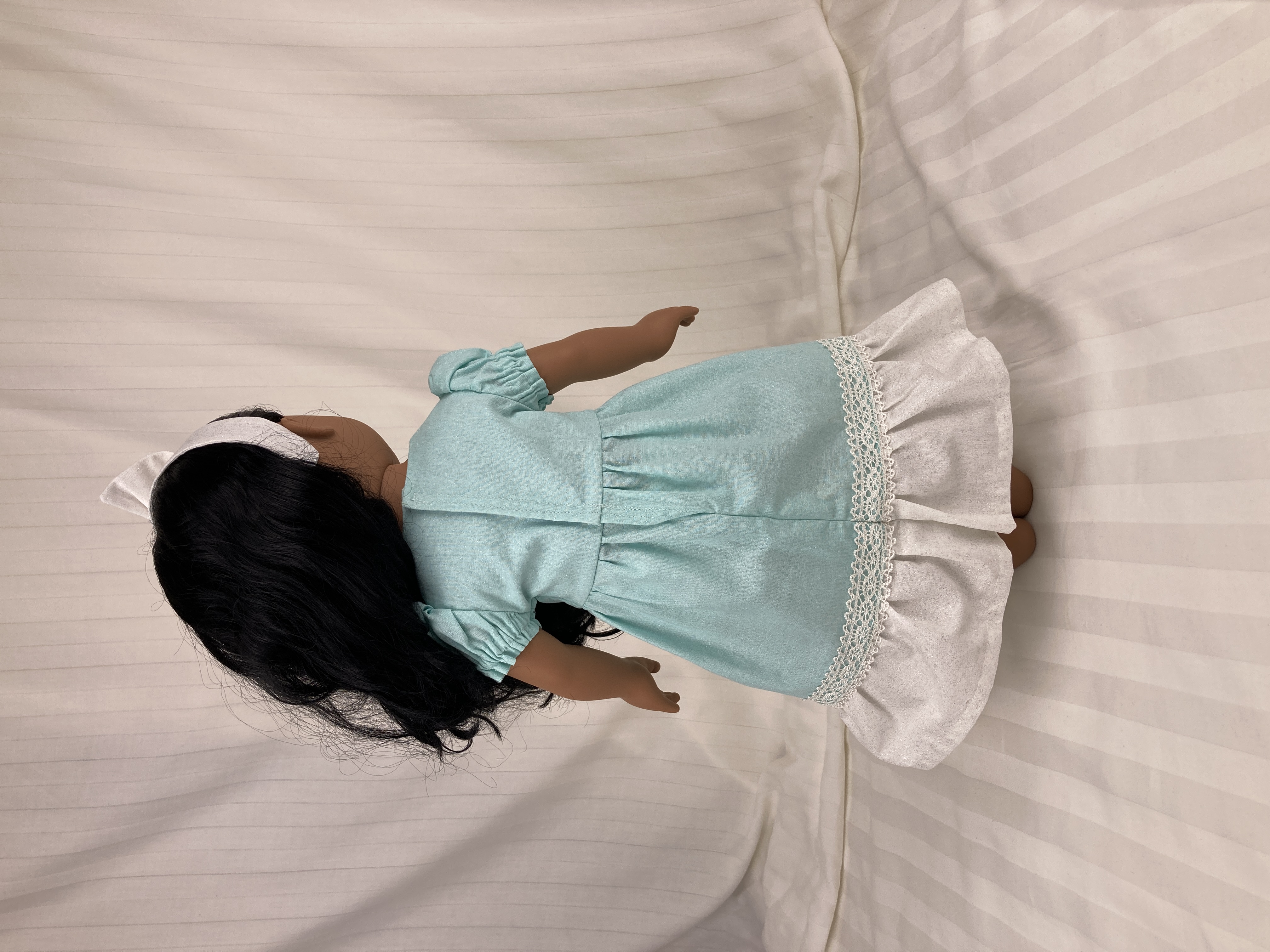 If you are dreaming for a snow fairy princess dress then look no further! This gorgeous dress for 18inch dolls is made from sparkly aqua blue cotton fabric. The back has a hook and loop closure. The short sleeves are puffed and white frosty looking lace flow down the front bodice to the waistline. The skirt is gathered and falls almost to the ground. A two plus inch ruffle along the bottom, in an icy white sparkle cotton fabric, adds charm and elegance. The headband is made from the same sparkly white fabric as the ruffle and features a nice sized bow.