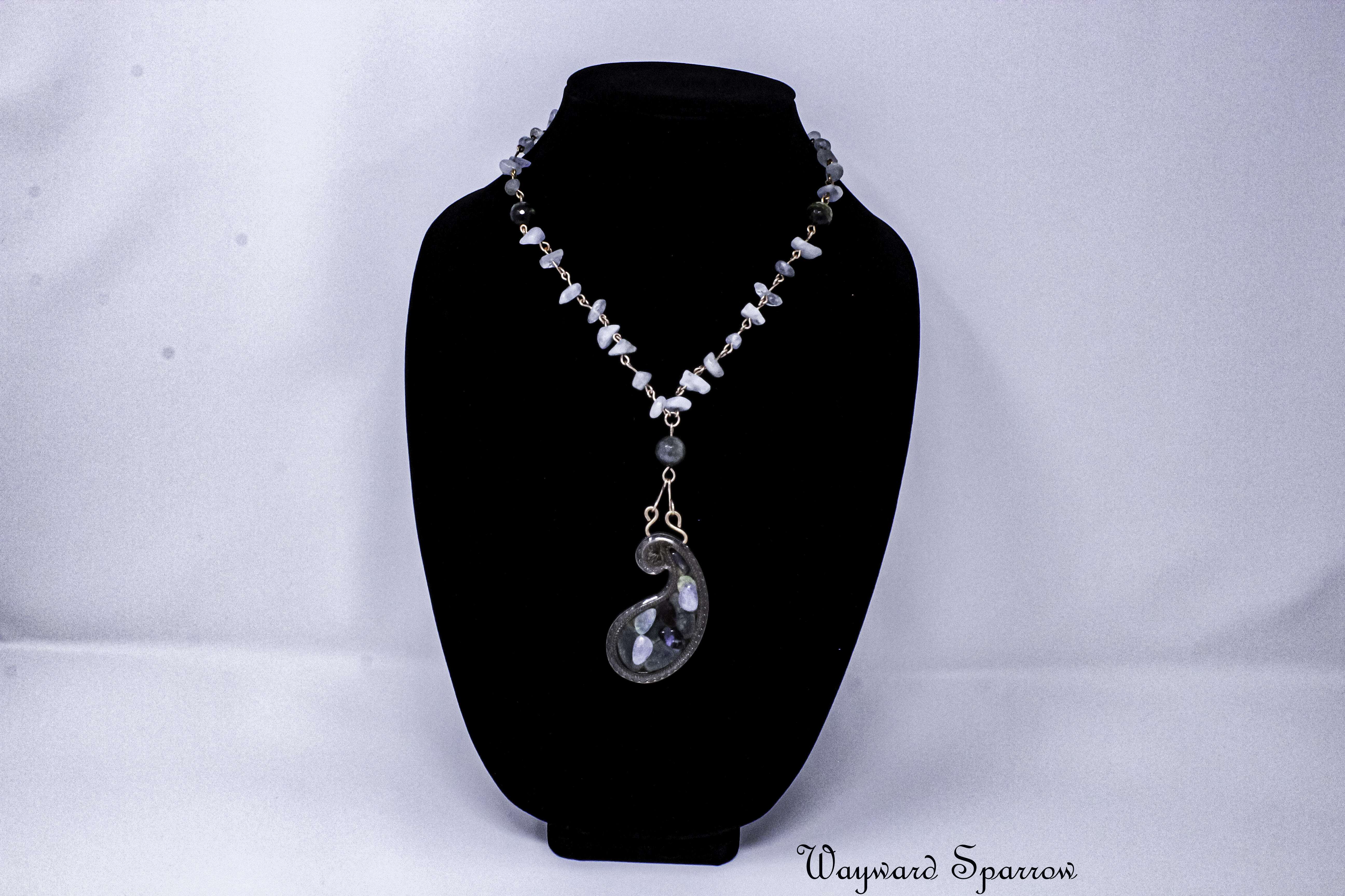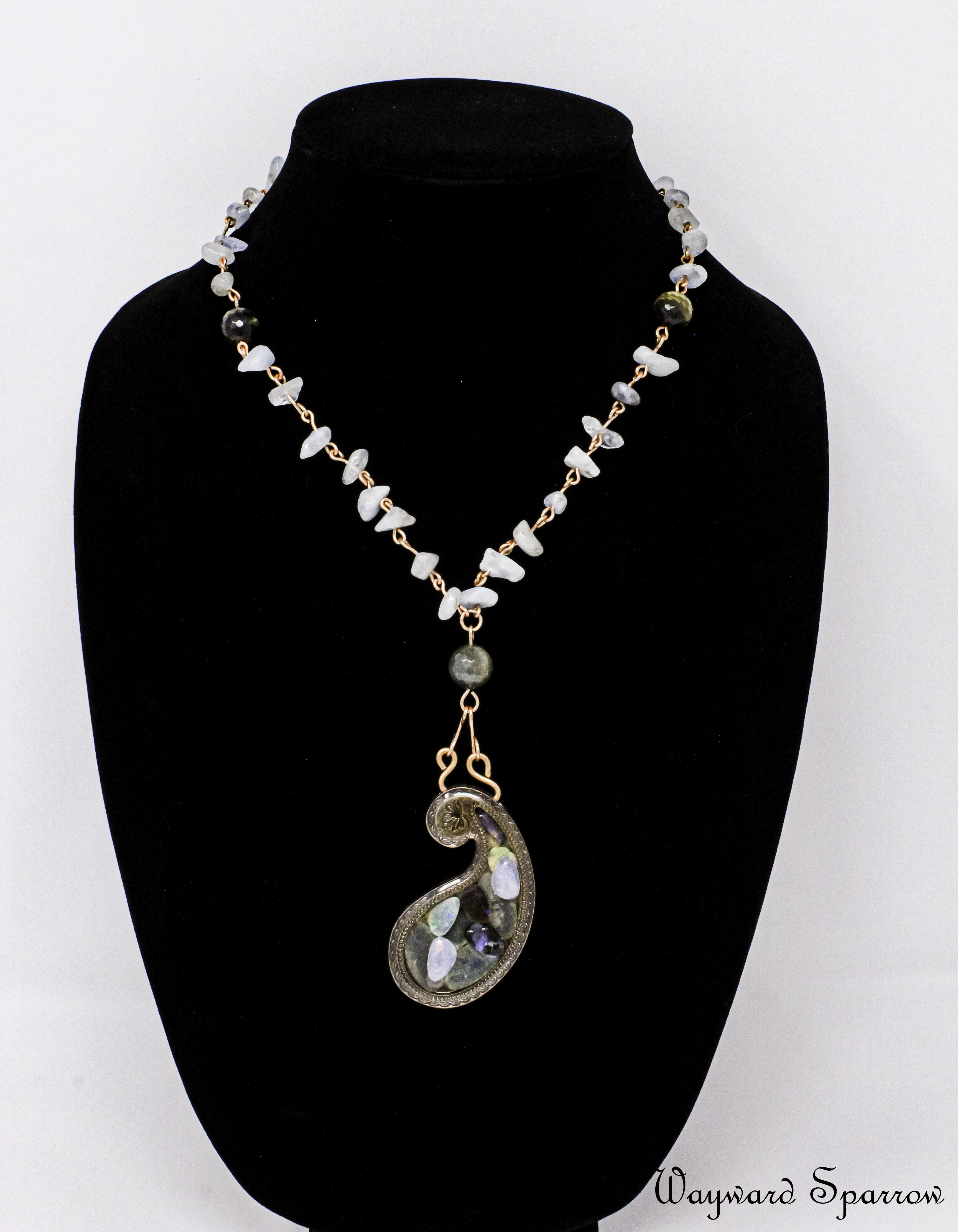 Beautiful aquamarine and blue tiger eye copper linked together to showcase a paisley pendant with resin set opals. A unique and one-of-a-kind statement necklace.
