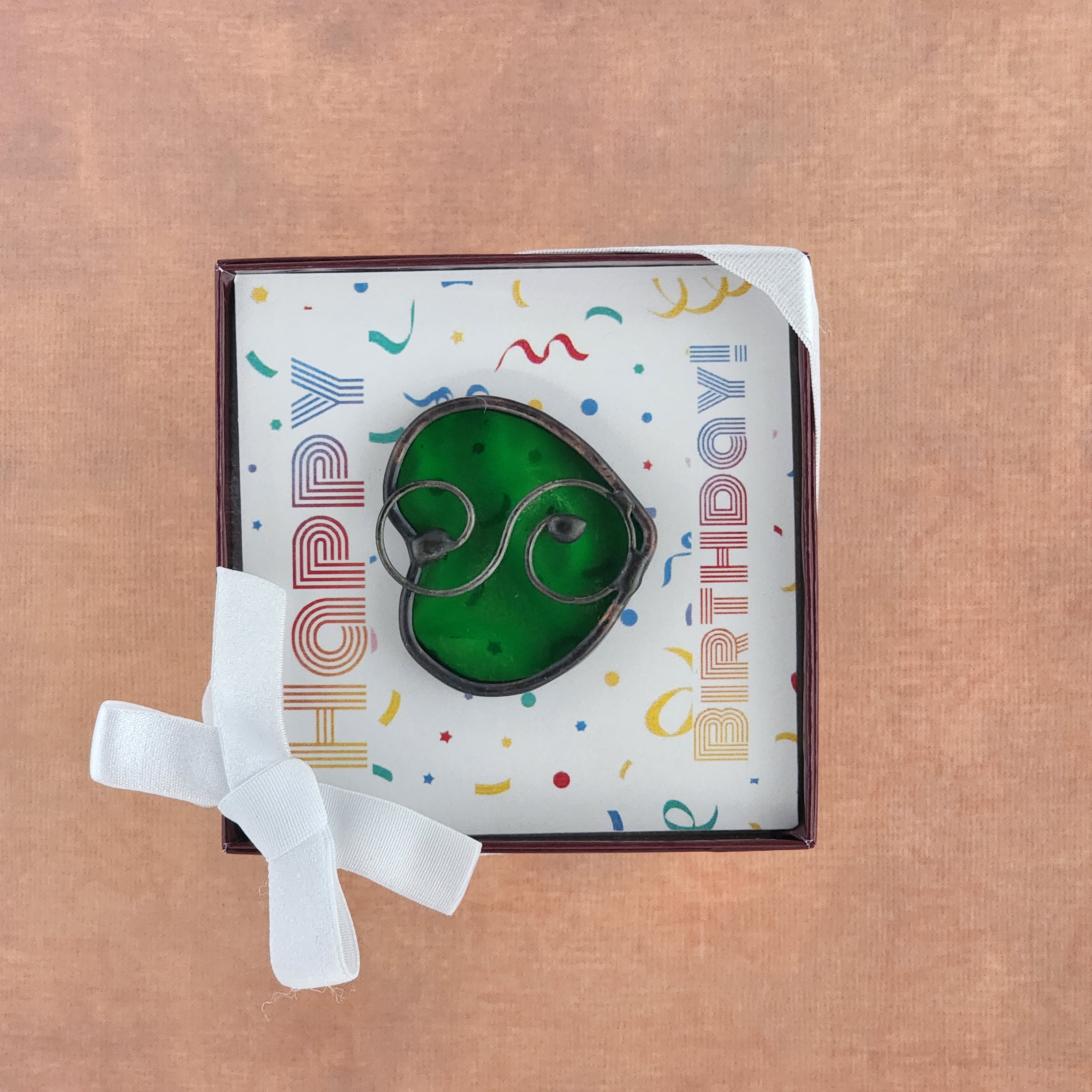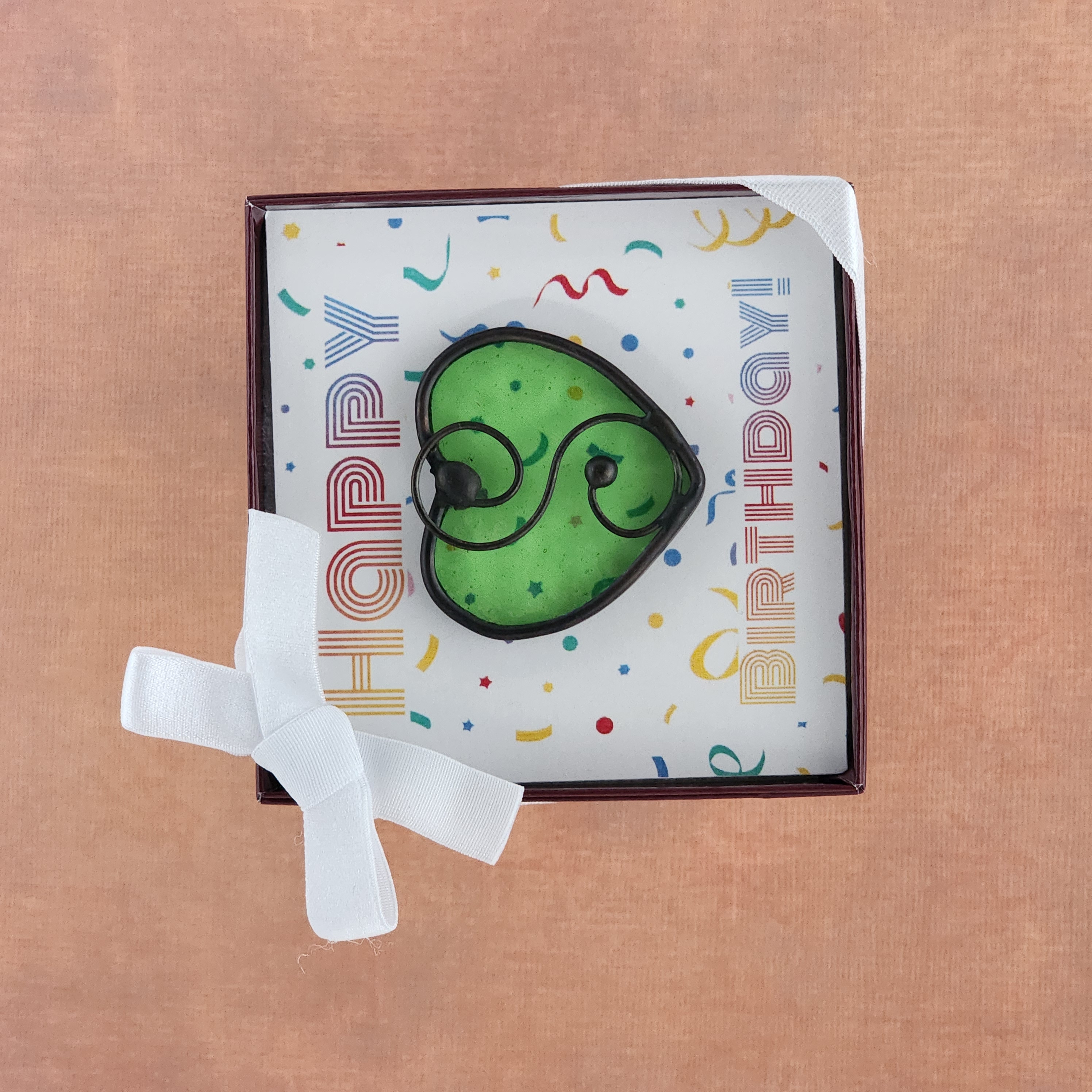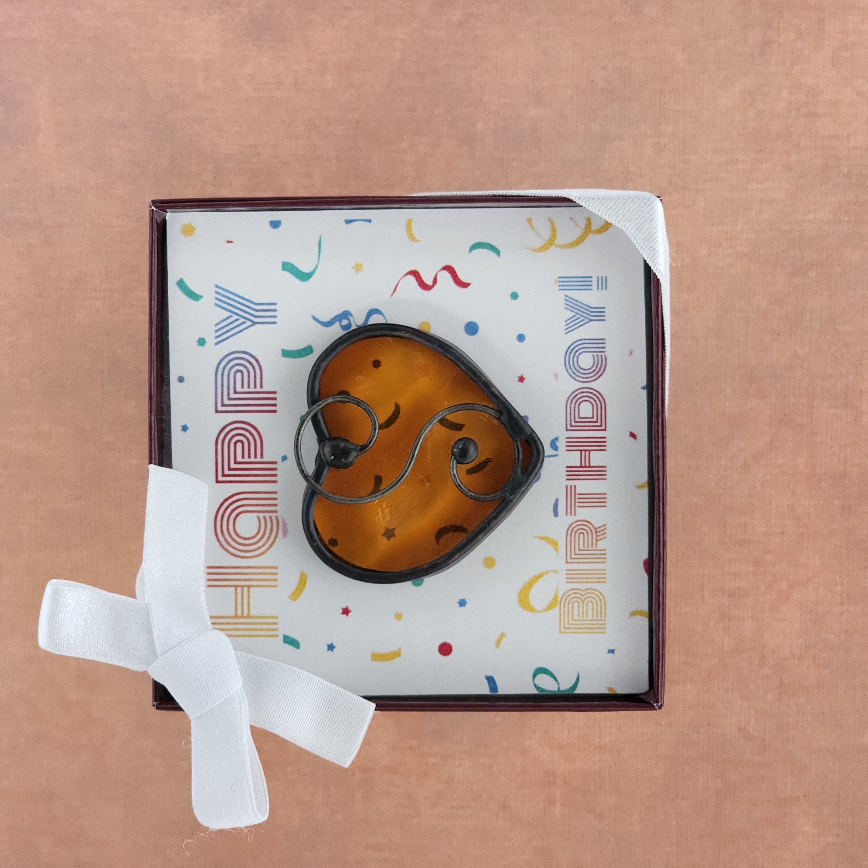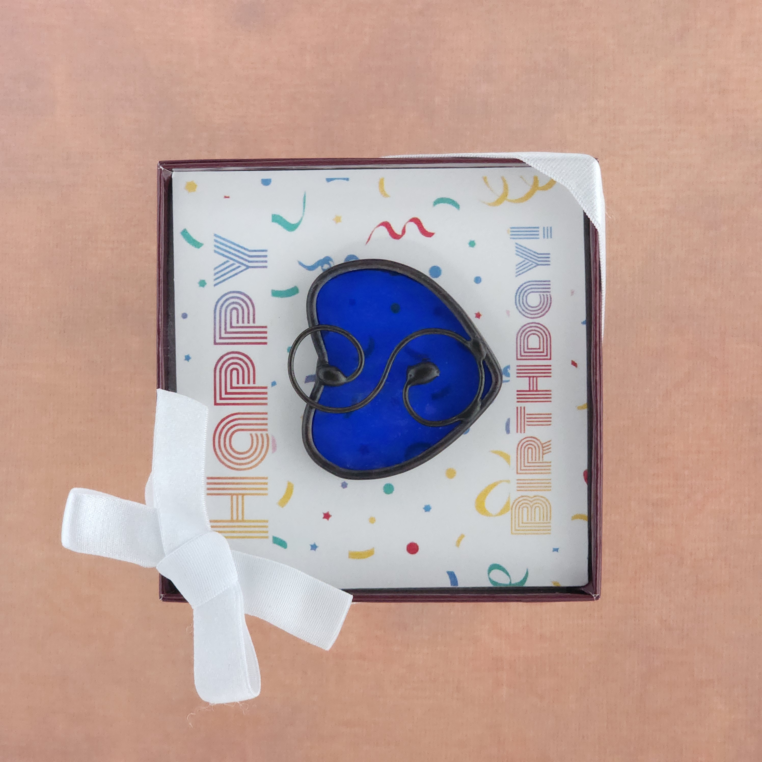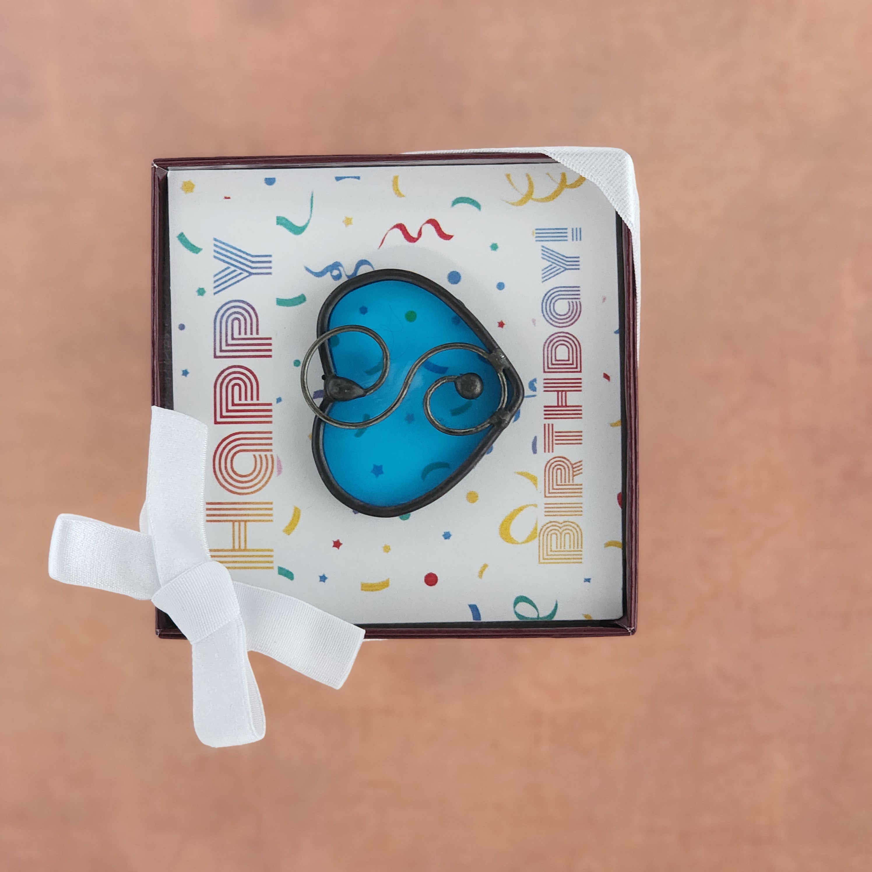 Send your love and best birthday wishes message with a handcrafted suncatcher. A stained glass heart in an aquamarine colored glass is a thoughtful and unique March birthday gift.