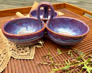 Ceramic Triple Dipper Snack Caddy, Ceramic Bowls with handle