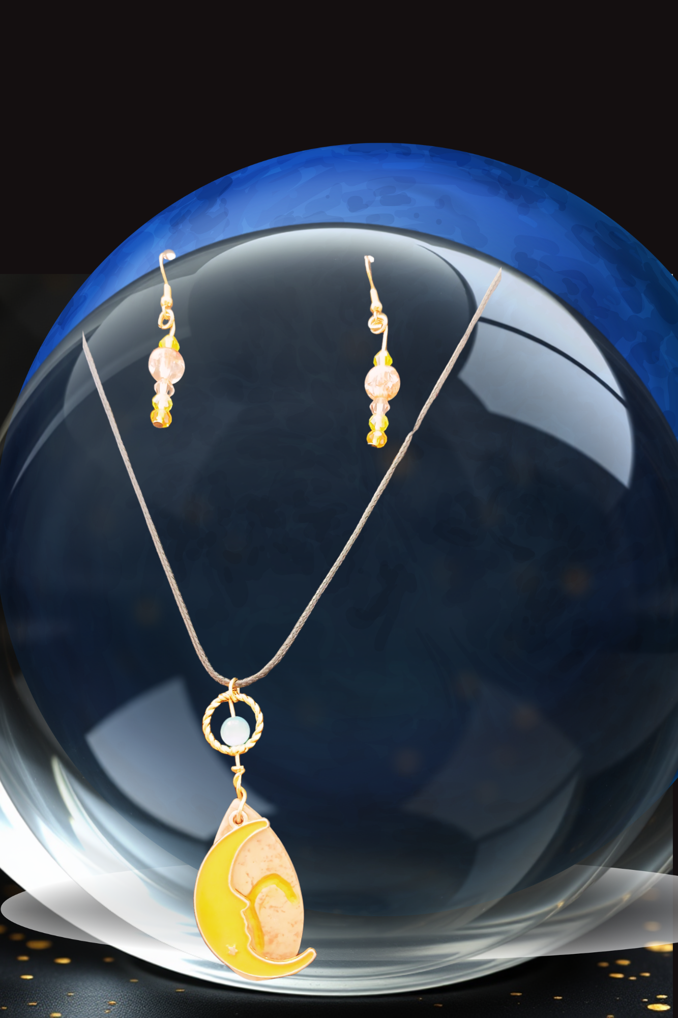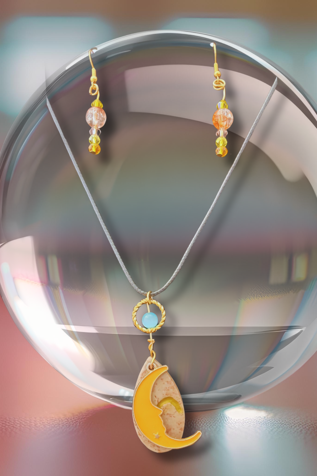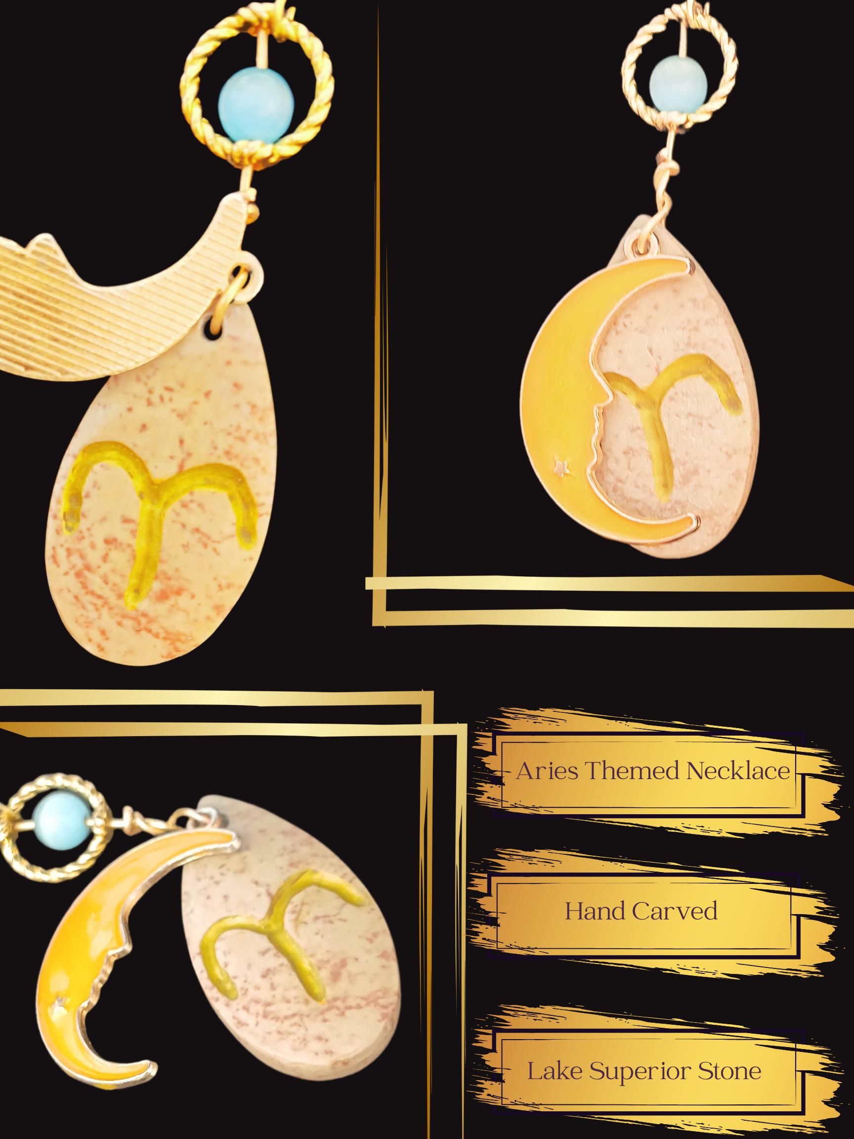 Celebrate bold Aries energy with this handcrafted jewelry set featuring a one-of-a-kind stone necklace and matching earrings. This natural stone was hand-collected from Lake Superior and carved with the Aries symbol. Paired with a golden crescent moon charm and soothing sky-blue accent beads.