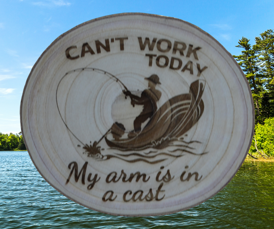 Introducing the perfect gift for any fishing enthusiast: an 8-inch live edge basswood round featuring a humorous laser-engraved design. This rustic wall decor piece is crafted from quality basswood, retaining its natural live edge for an authentic, outdoorsy feel. The centerpiece of this delightful decoration is the playful message, “I Can't Work Today, My Arm is in a Cast,” accompanied by a whimsical fisherman illustration. With a sturdy picture hanger attached, it's easy to display in a home, cabin, or office. Whether you're looking to add a touch of humor to your own space or searching for a clever gift for a fishing aficionado, this unique piece is sure to bring a smile to anyone's face.