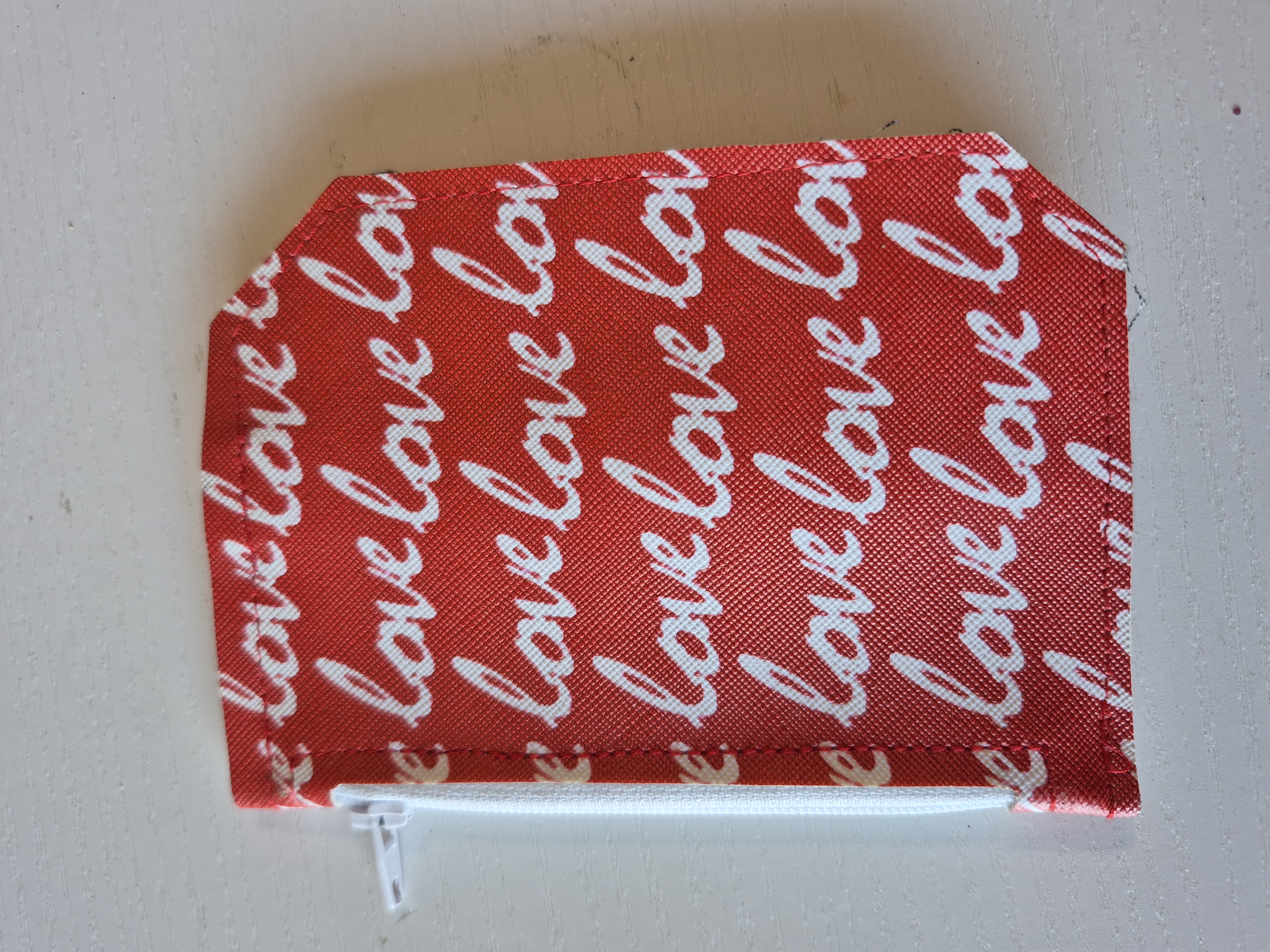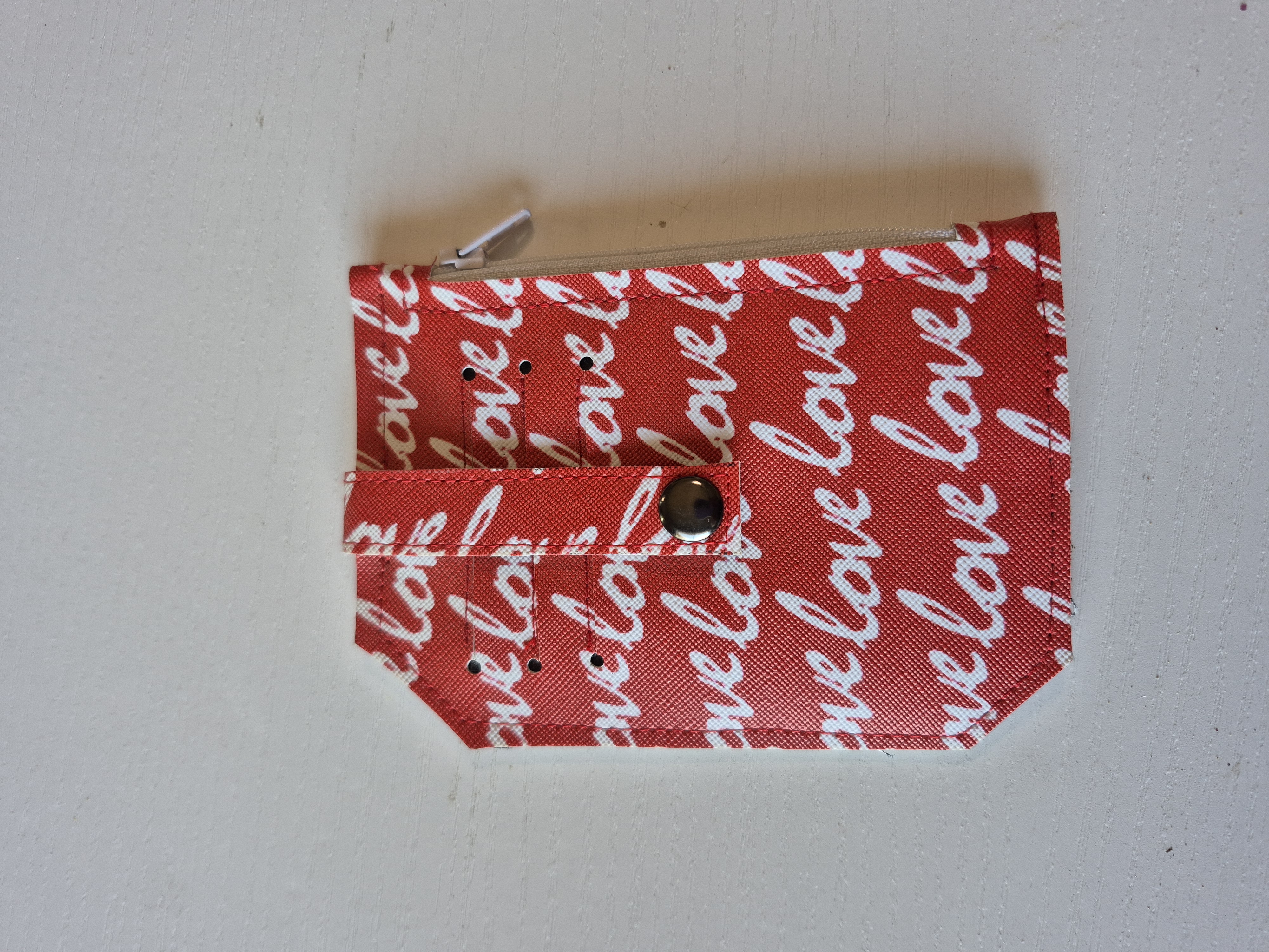Handcrafted card holder, with 3 card slots, word love printed all over the vinyl, zipper pouch with black fabric inside. made in smoke free home pet friendly.