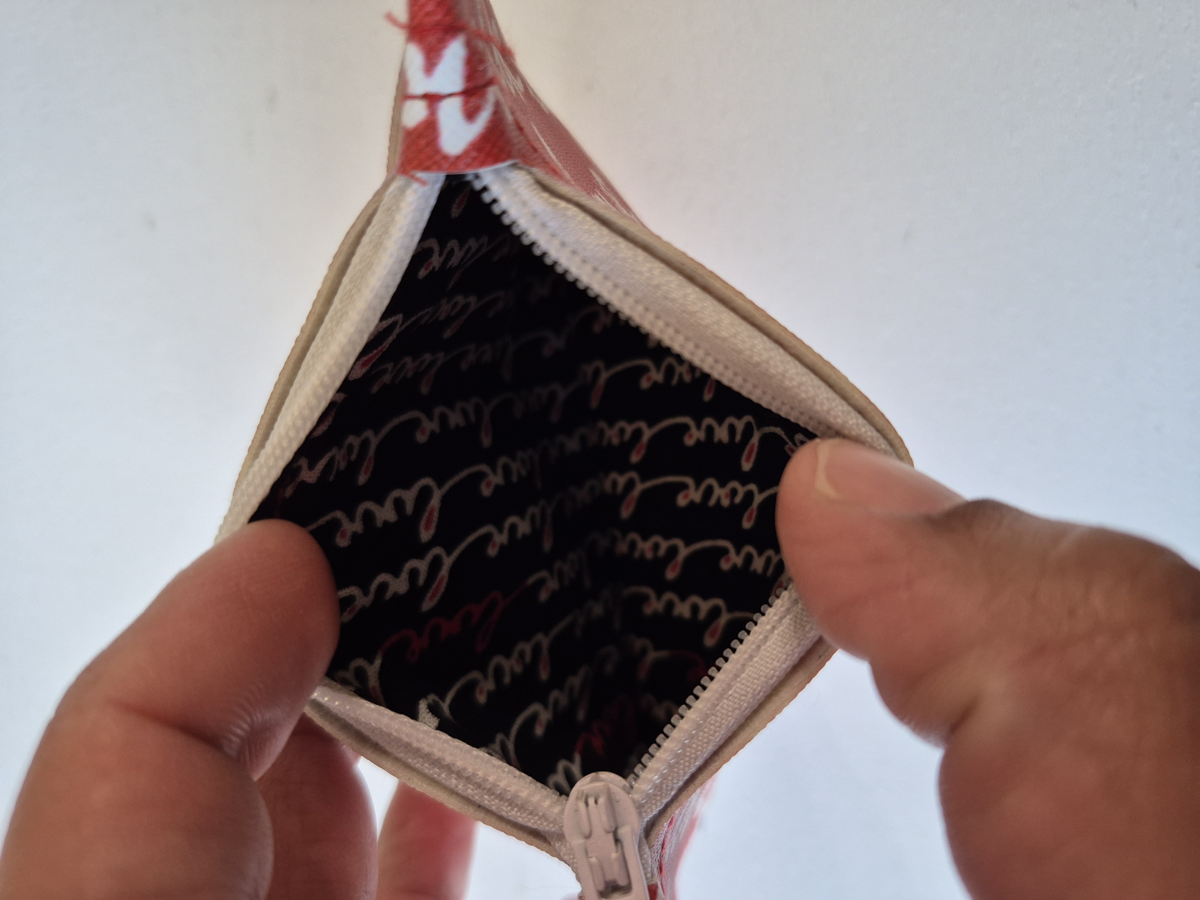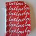 Artisan mini wallet: red pouch with white "Love" wording, 3 card slots, raw edge