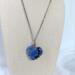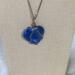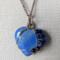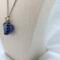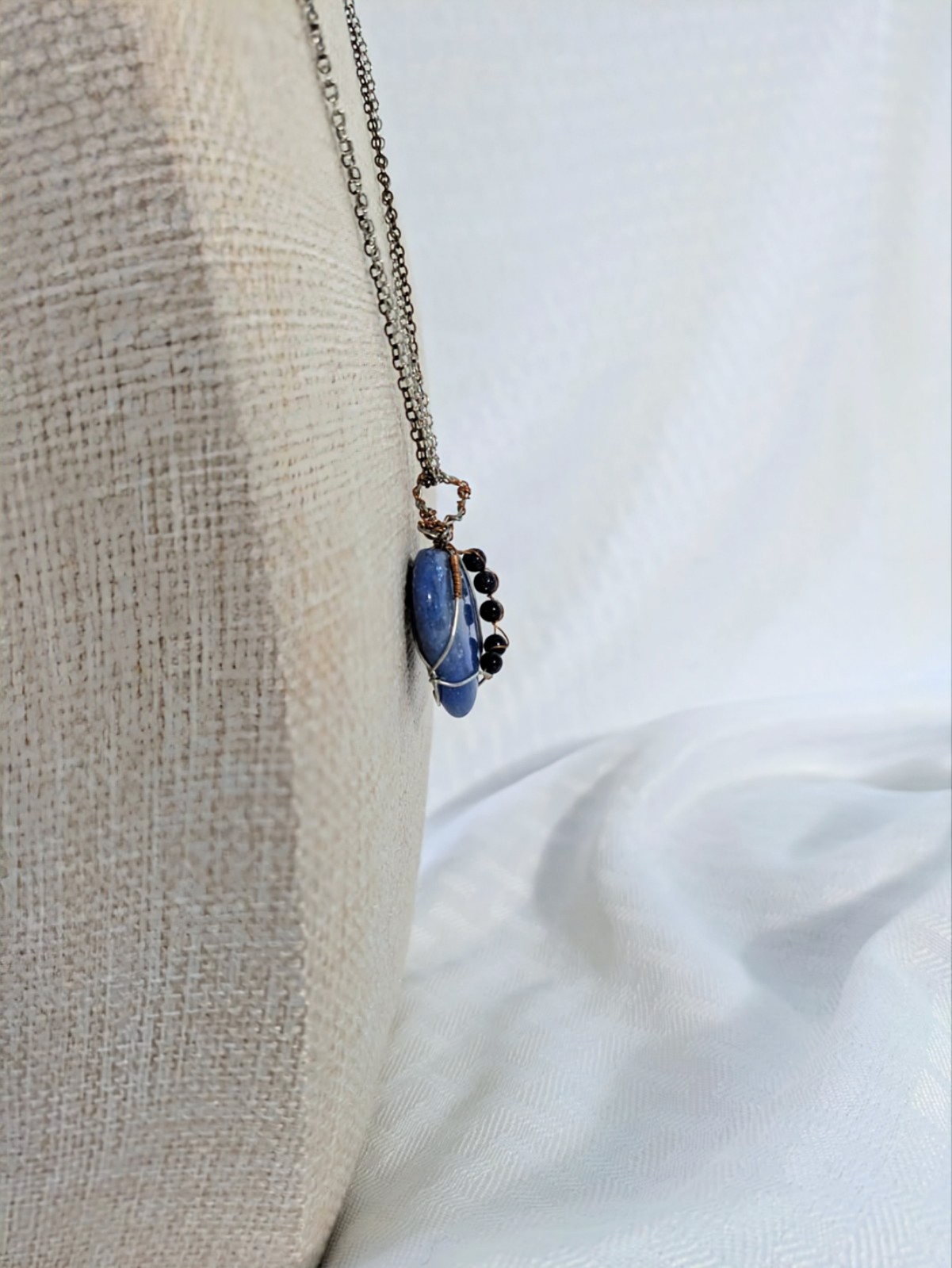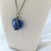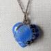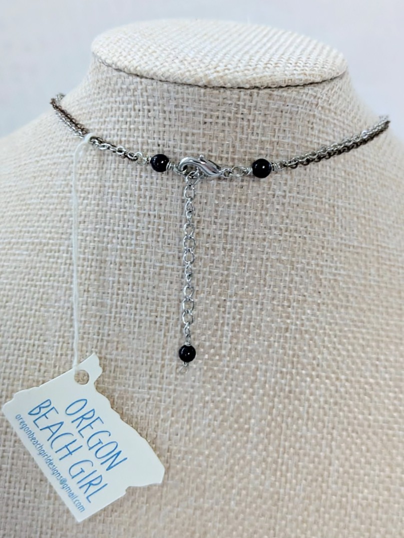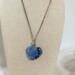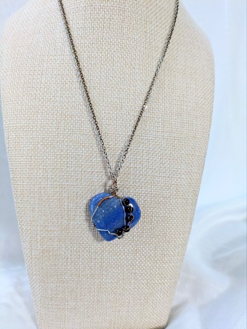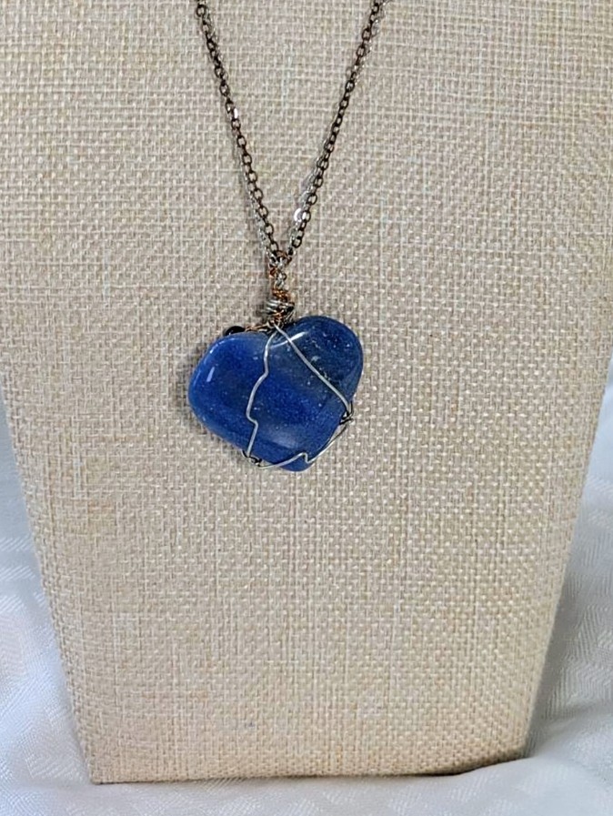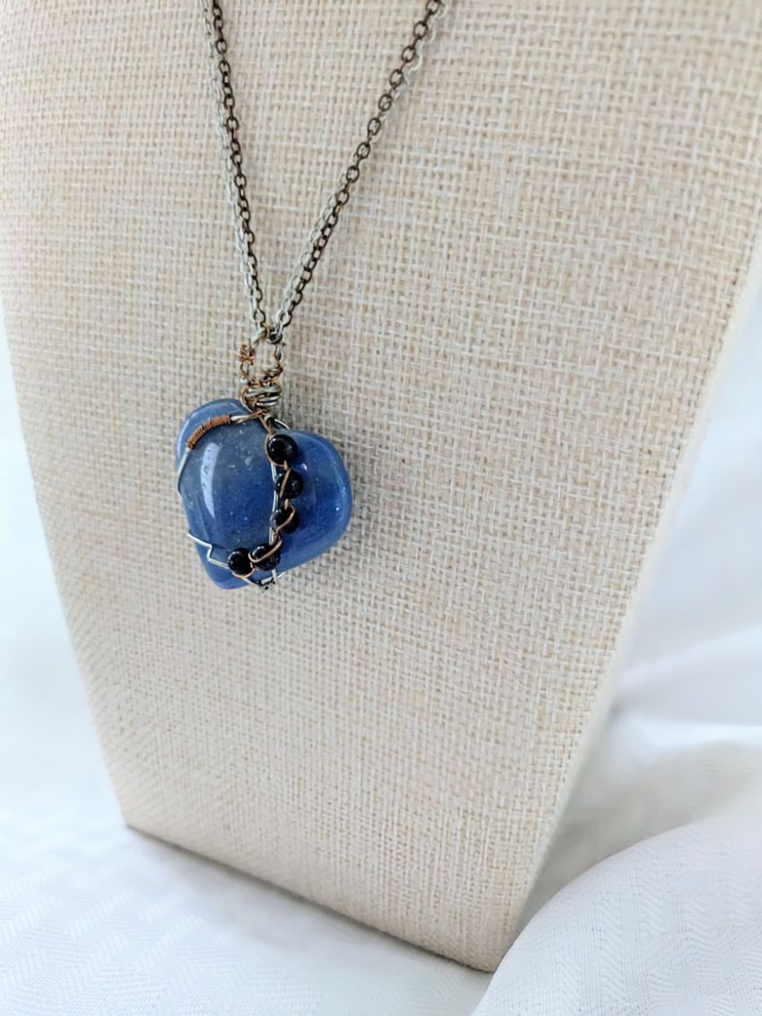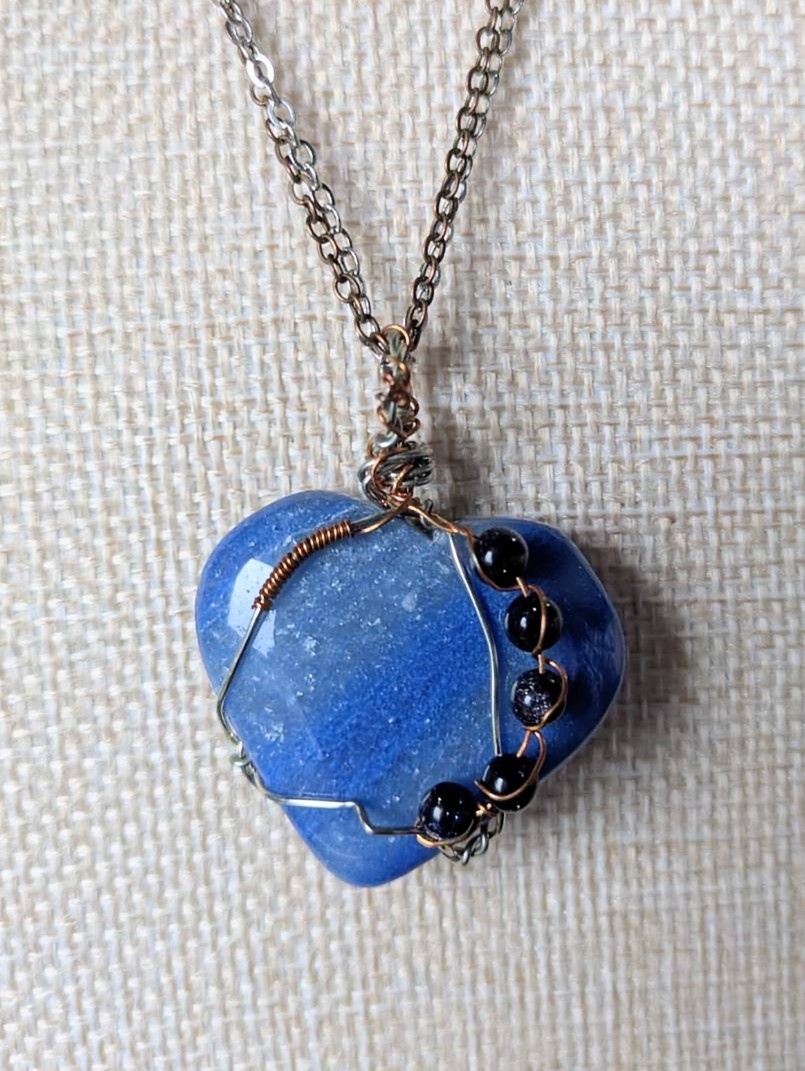 There are eight (4mm) Blue Goldstone beads which have an understated sparkle. Five on the front of the heart and three at the clasp. Double 2 mm chains, are approximately 17" in length with a 2" extender. One in copper and one in silver plate, to finish this versatile piece.