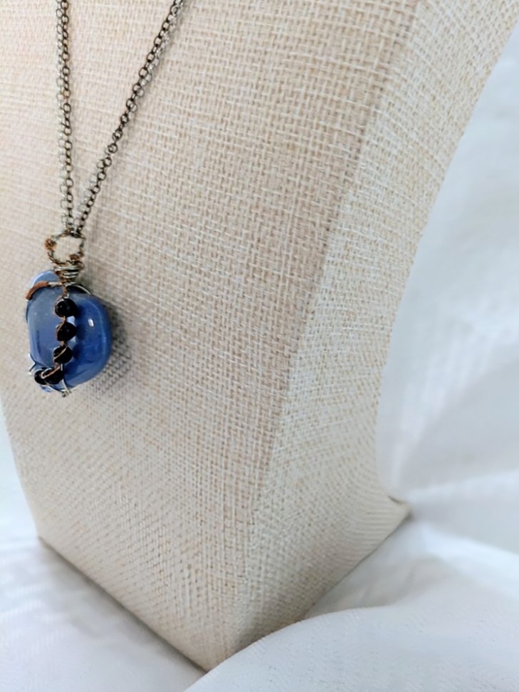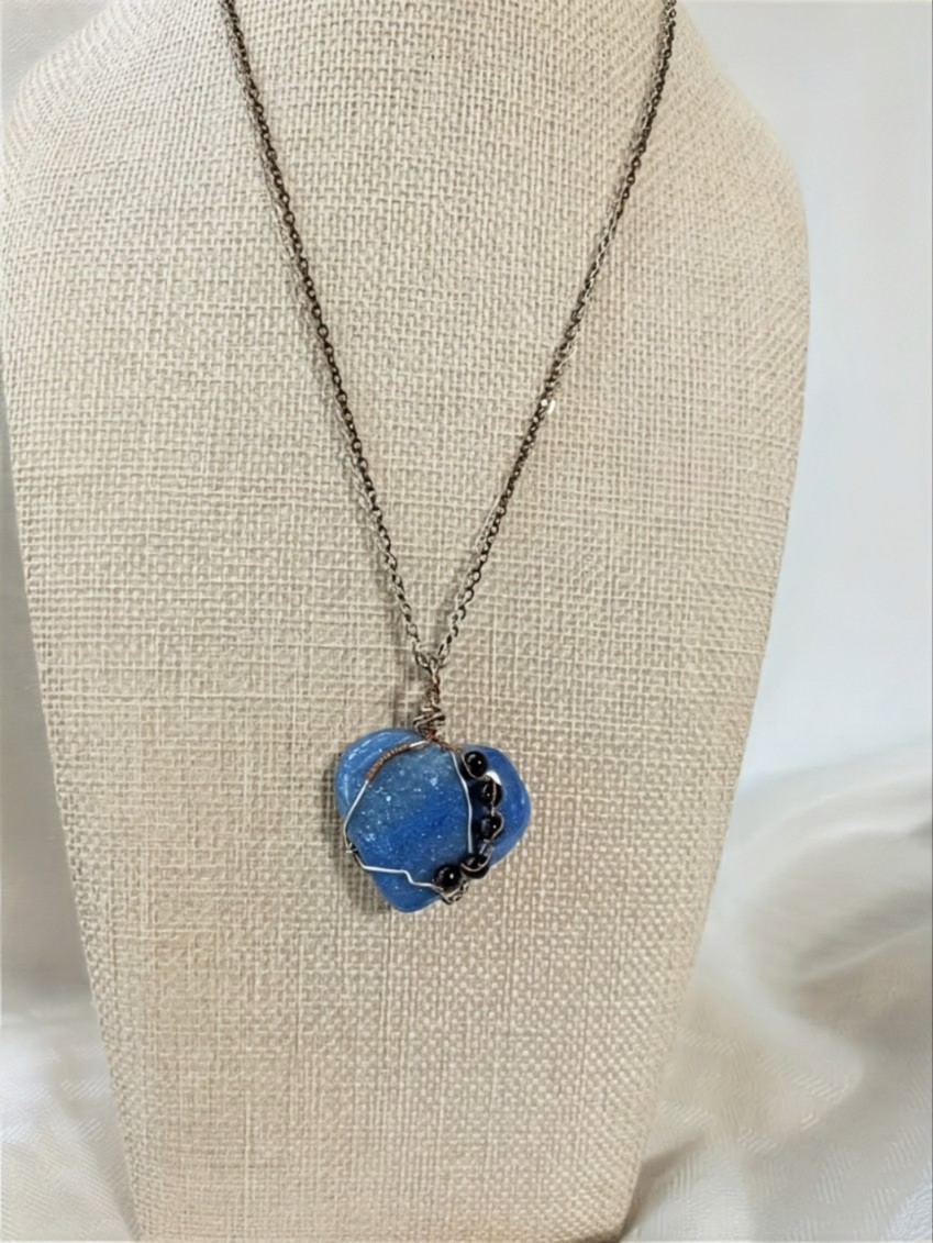 The wire wrapping makes this piece unique with copper wire in true copper color and silver plated. Two-tone wire on the bail and throughout the design.