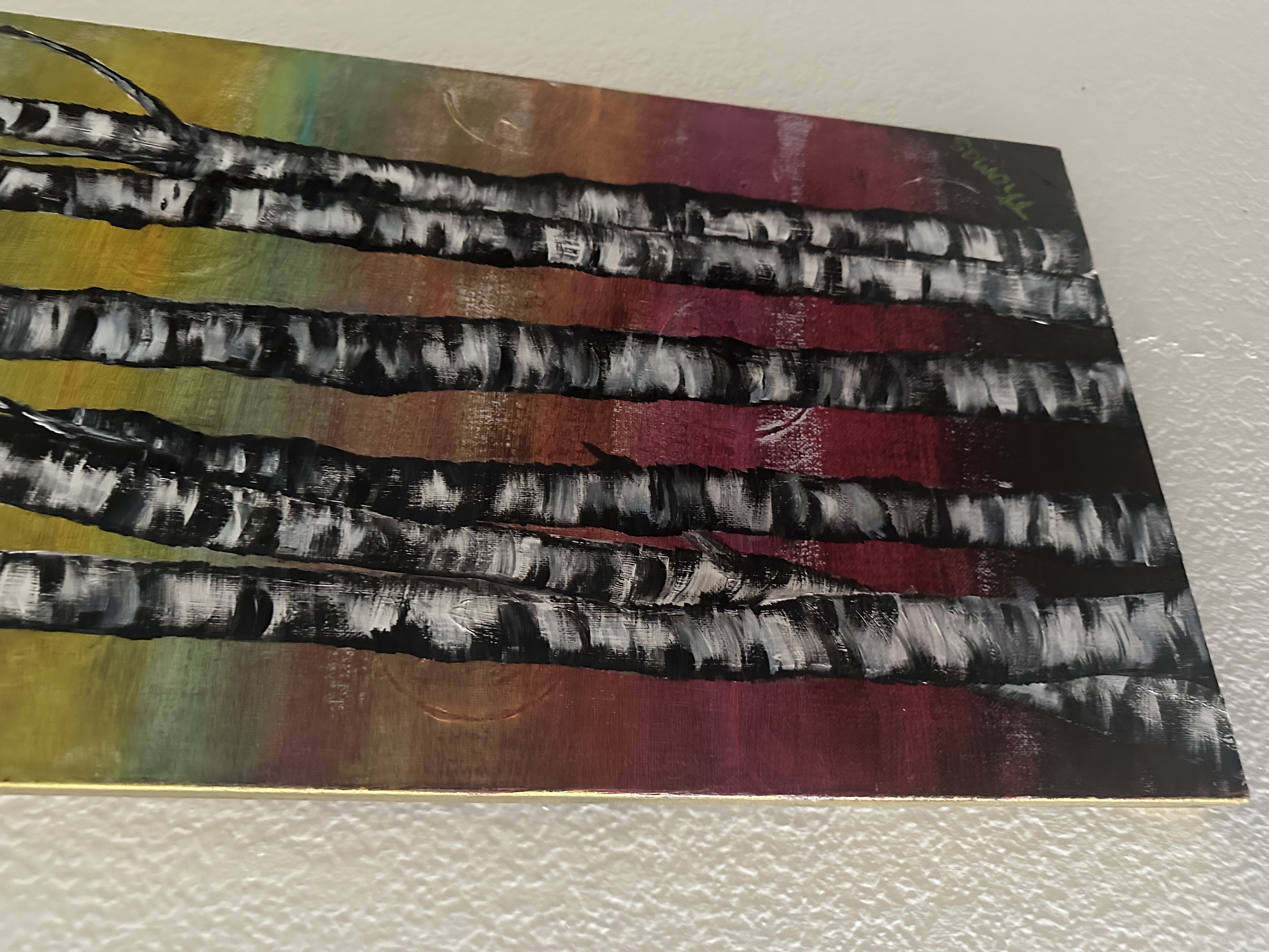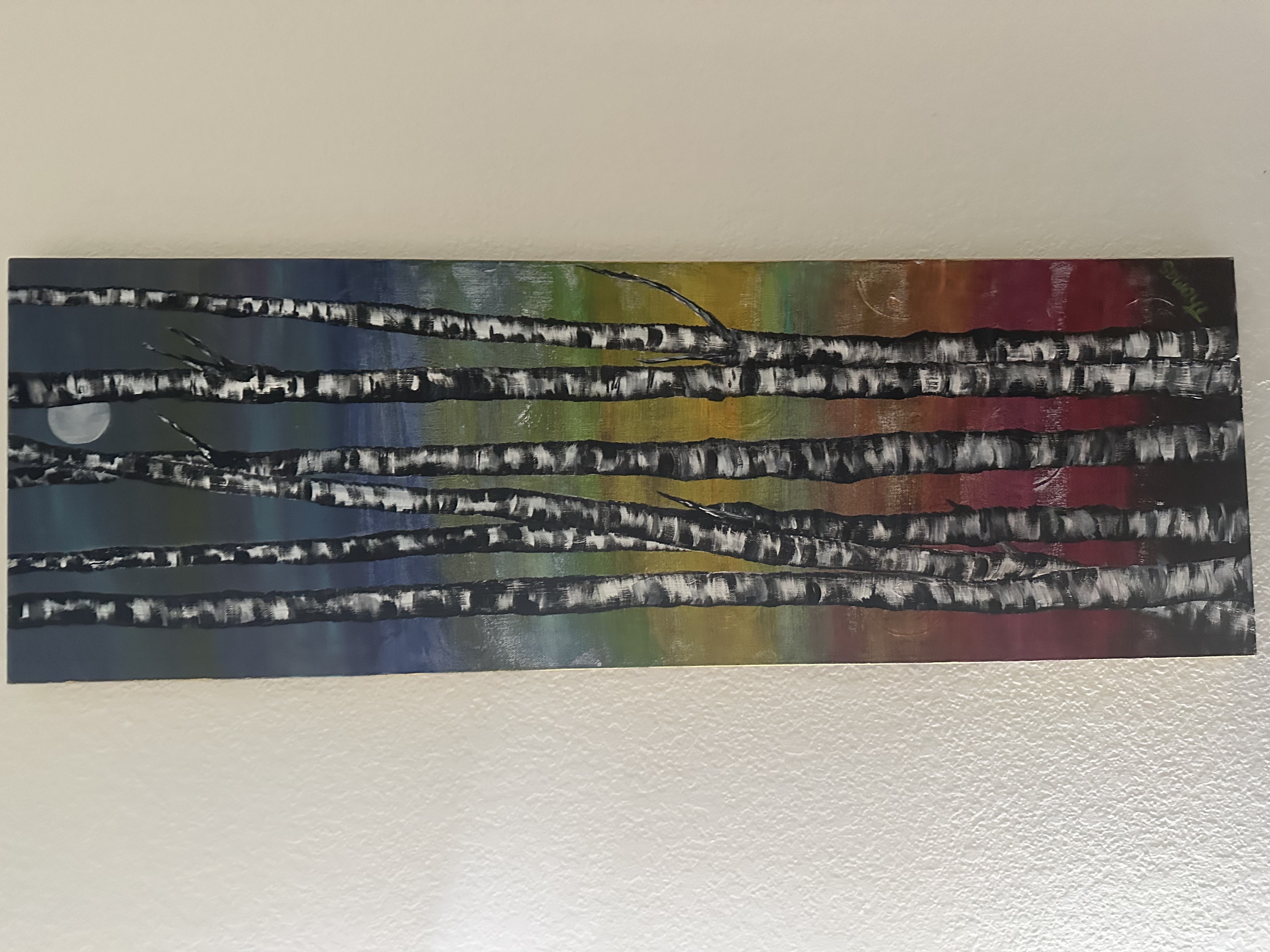12x36 inch canvas features Aspen standing tall with a colorful autumn background. Acrylic paint and many layers of deep, colorful tones. This piece is painted on the side of the canvas and covered to protect from water and dirt. Ready to hang and what a colorful pop this would create in a hallway or entry way. Enjoy!!!!