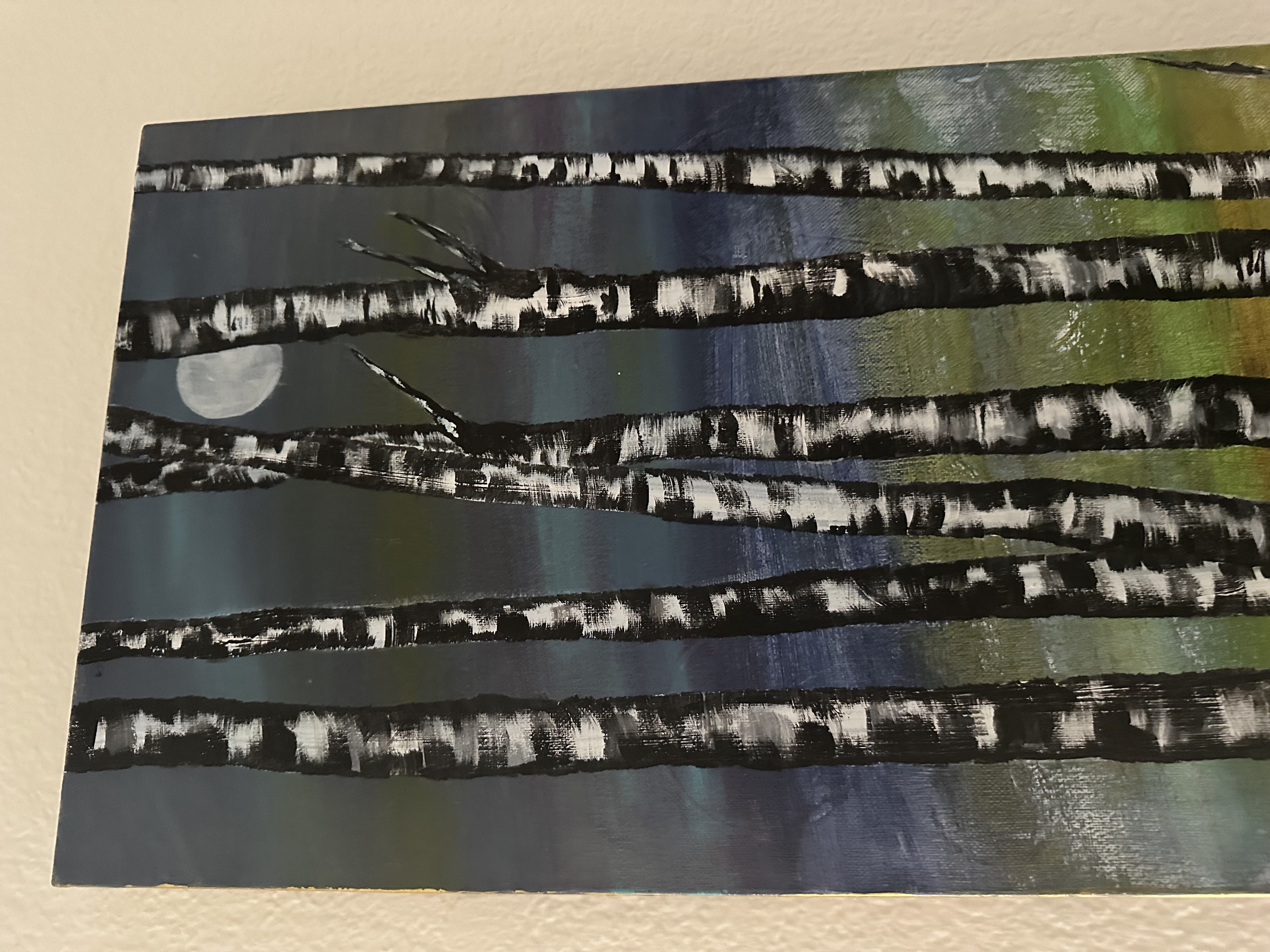 Canvas prepped and acrylic paint applied in many layers. Background is bold and colorful. Aspen are painted with acrylic pain and some marker/ink. Protective coating applied and sides are painted as well so that you can purchase this piece and hang it without a frame.