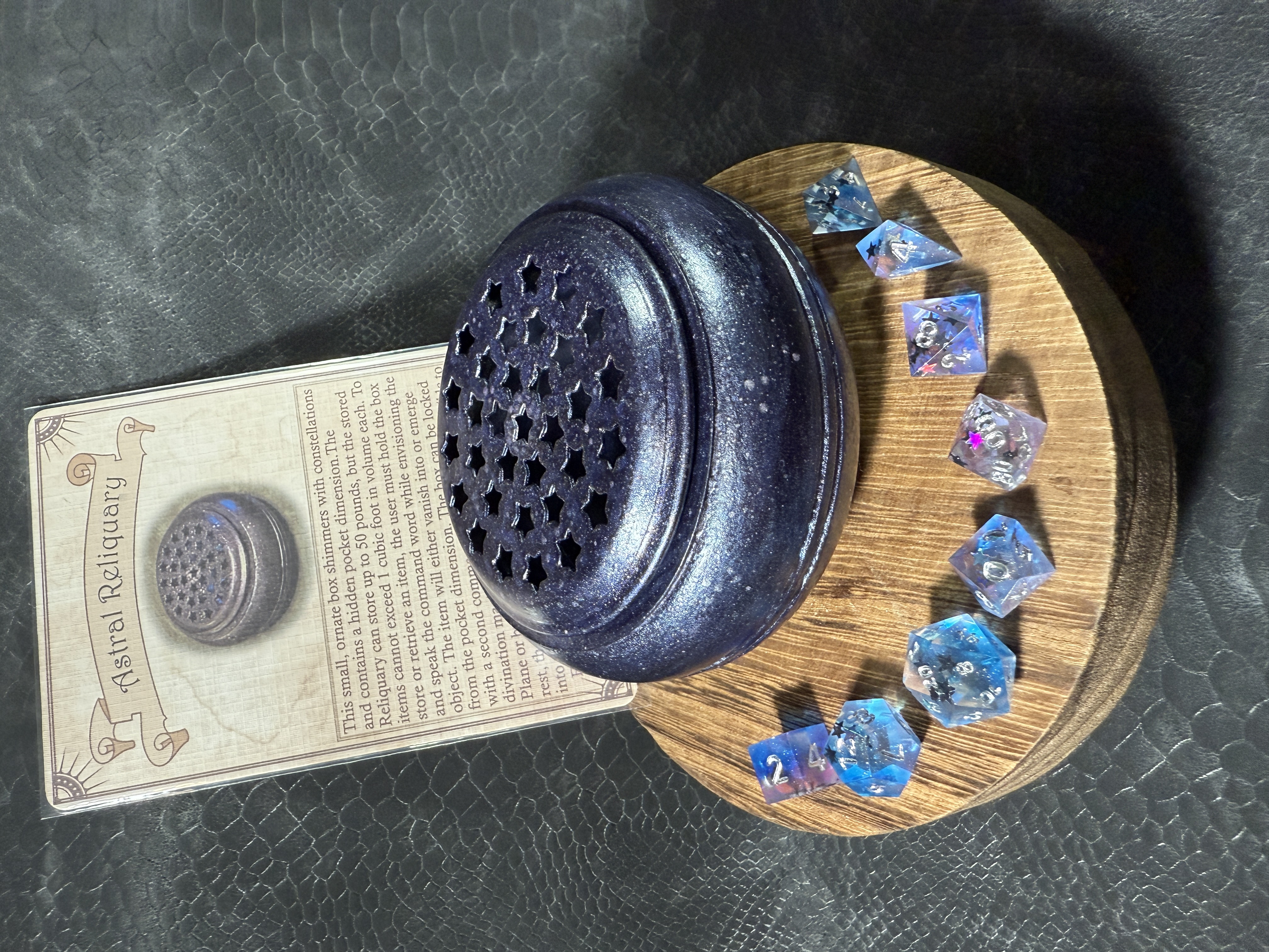 The Astral Reliquary comes with a celestial-themed mini sharp edge dice set, a magic item card (also accessible on D&D Beyond), and a galaxy painted wooden box adorned with shimmering constellations and star-shaped cutouts. The box’s deep indigo finish sparkles like a pocket of the night sky, capturing the wonder of the Astral Plane itself.