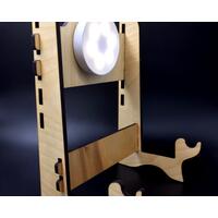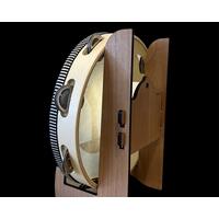 The Drum^Dock® DISPLAY STAND * Drum^Dock® the Exclusive Back-Lit Frame Drum Display Stand. Use as Table Lamp or wall Sconce. * Wireless Installation! *No electrical work required. *Full range dimming * The versatile Drum^Dock® works as an attractive, safe, and durable holder for your new Frame Drum. * The Drum^Dock® sits on a flat surface for use as a Table Lamp or mounts on the wall as a wall Sconce light . * The Drum^Dock® Back-lit Display Stand provides a cradle to hold and display your drum and beater stick. * The Drum^Dock® is made from durable Stylish laminated Birch Hardwood and finished with two coats of lacquer. * The cradle, where your drum meets and sits on the stand, is cushioned. (some assembly required no hardware or tools needed). * Assembles in a minute.