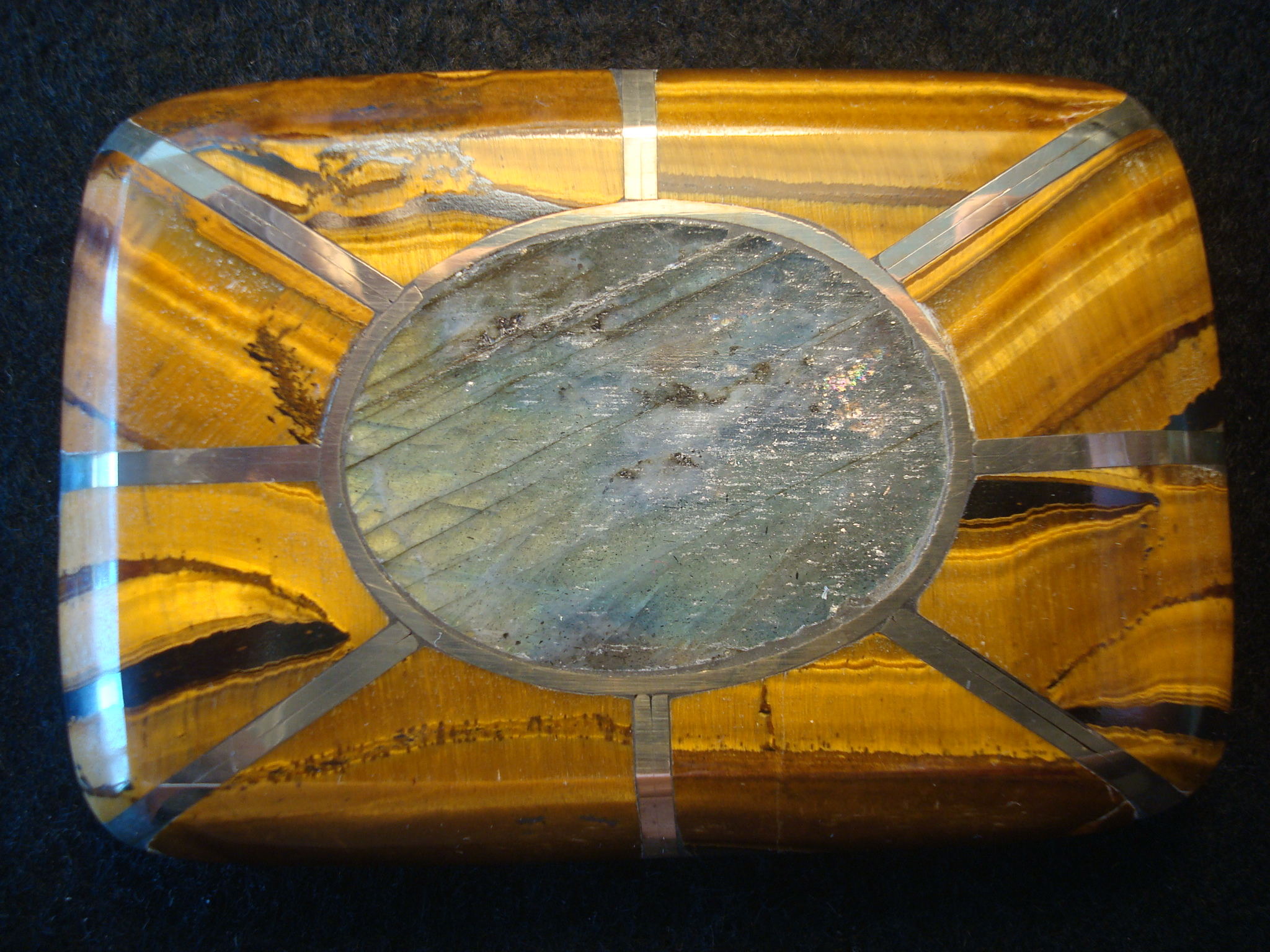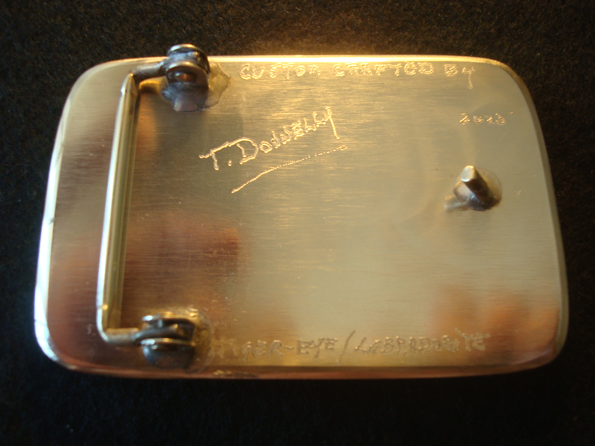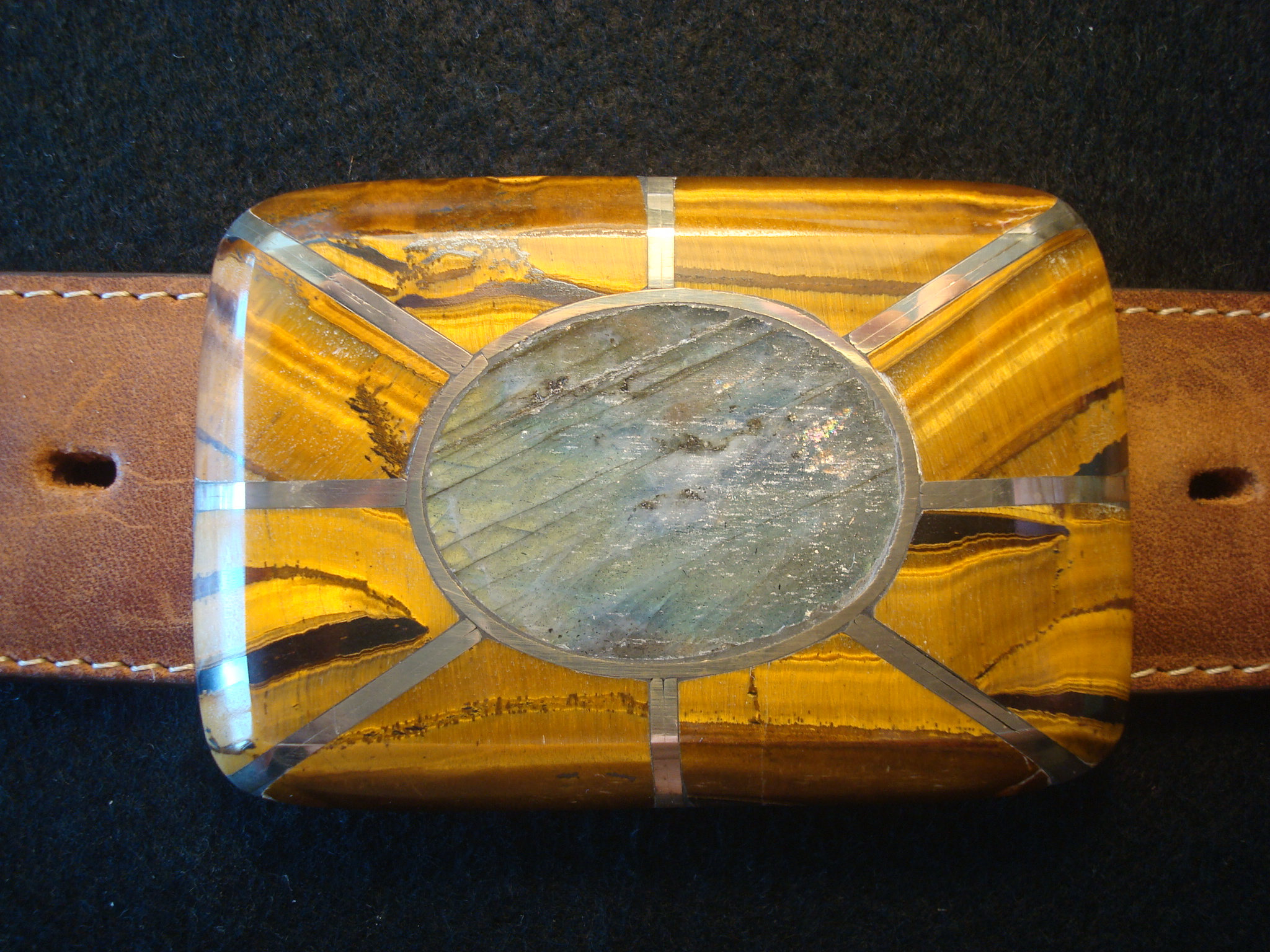 With this buckle I have surrounded an oval of Labradorite with eight pieces of Australian tiger-Eye and separated and set the pieces off by insetting silver between the different pieces. This buckle is formed in my beveled edge design and is supported with my handmade silver backing, The backing is signed and dated along with the stones names .This buckle will accept a belt up to 1 1/2" in width and it measures 2 1/16" by 3 1/16""and is approx. 1/4" in thickness. Note that German silver is not silver but an alloy comprised of nickle,brass and zinc. The reasons that I use it is because it is stronger, less expensive and it doesn't tarnish as does silver.