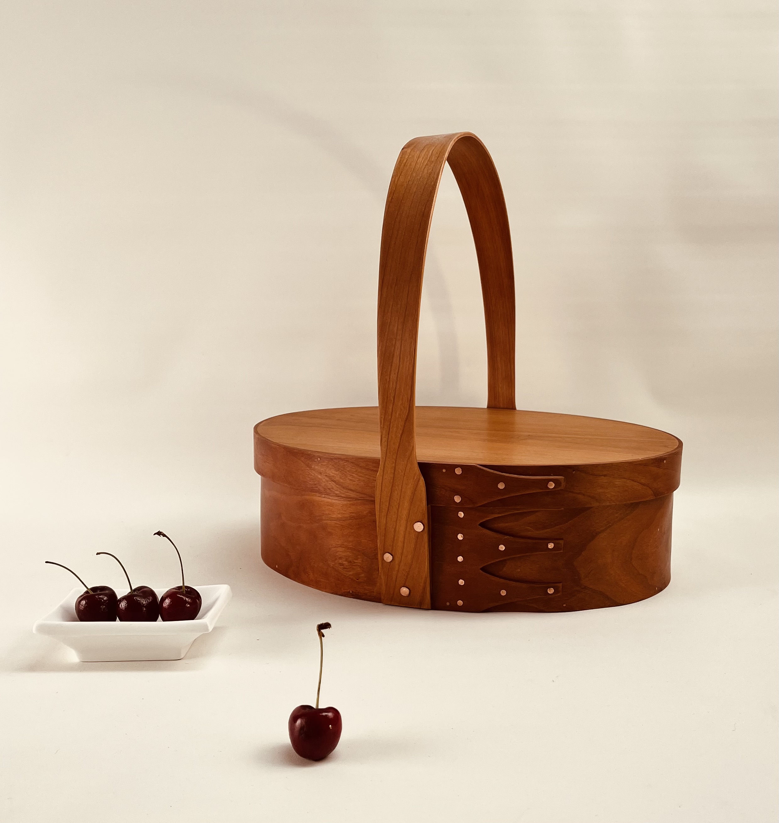 Each Shaker Carrier is carefully handcrafted from solid cherry wood, honoring the traditional Shaker design that emphasizes simplicity, durability, and function. The sides and handle are joined with copper tacks, creating a sturdy construction that reflects authentic Shaker woodworking techniques.