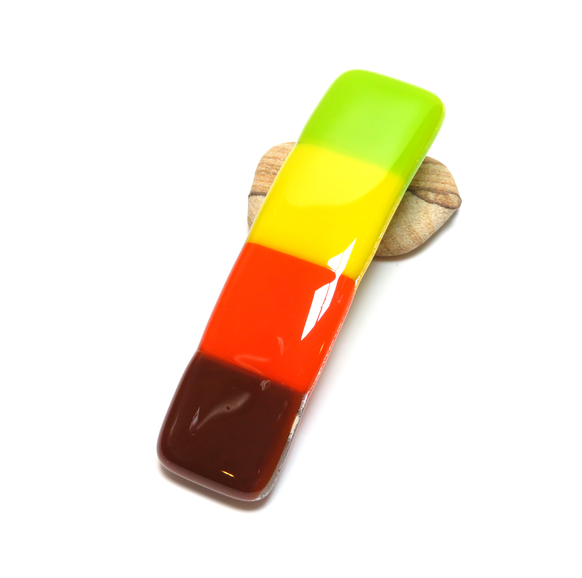 This autumn-inspired fused glass barrette from Partners in Glass captures the rich colors of the season — golden yellow, pumpkin orange, cocoa brown, and a touch of fresh green. Each piece is individually kiln-fired for over 8 hours, creating a smooth, glossy finish that reflects the glow of fall leaves and cozy gatherings.