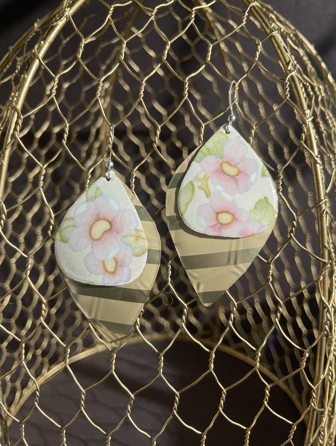 Tins are very light making them ideal for earrings as they don't weigh down your ears as the day goes on. Did you know the proper term for working with tin is "tinkering"? That made me really happy. I literally tinker in my art studio! I use old cookie tins, tea tins, and the like, break them down, and hand cut them into shapes and hand-hammer them into the 3-D shape I want them to be, finish and polish them, before putting them together like any other jewelry.