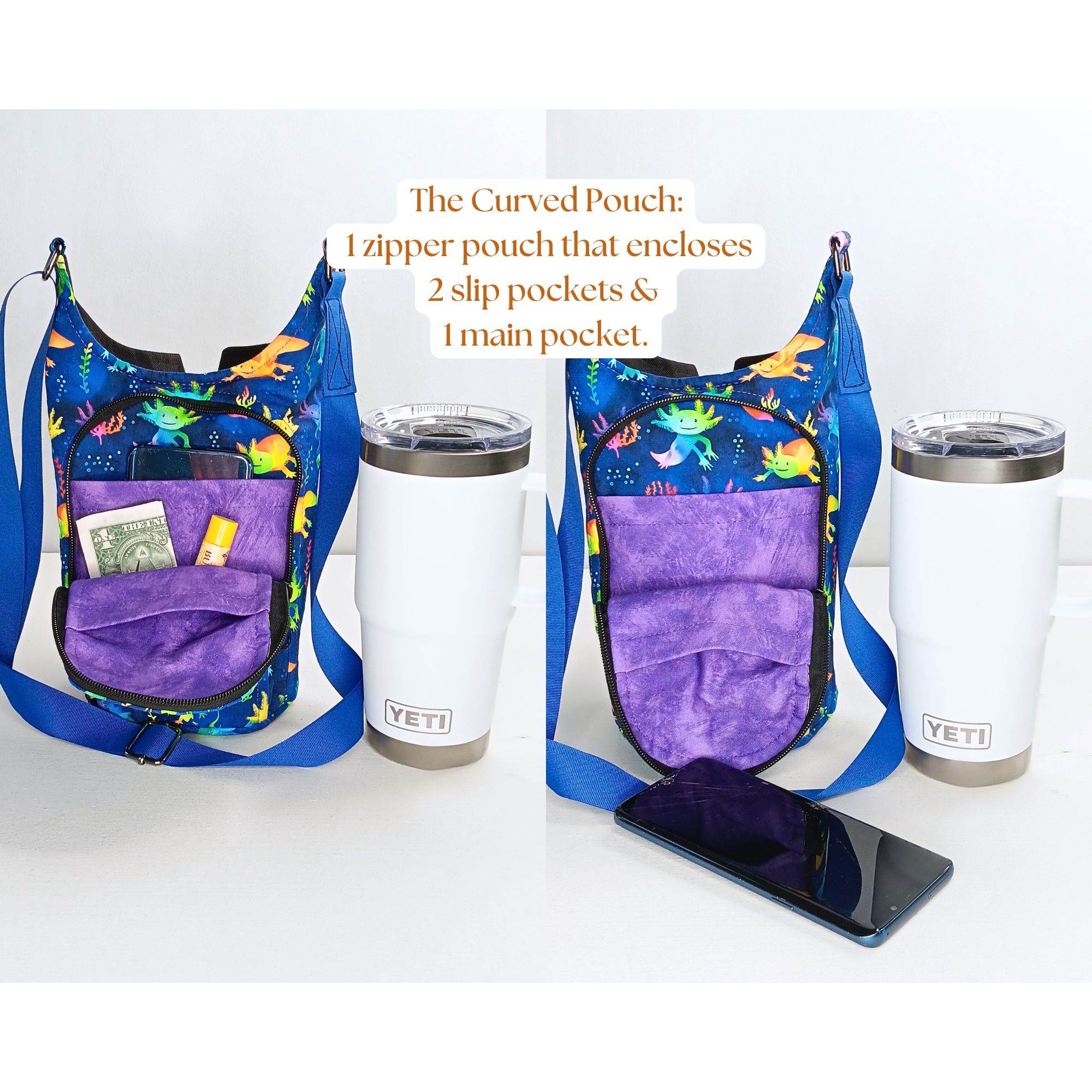 Easily carry your tumbler and essentials in this thoughtfully designed crossbody bag! Perfect for errands, walks, travel, or everyday use. Works with both handled and non-handled tumblers up to 40 oz.