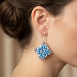 These Azure Star Earrings feature a striking geometric pattern inspired by the quiet precision of starlight. Handwoven from Czech glass and seed beads in cool blue, pearl, and iridescent finishes, they balance structure with shimmer. Their lightweight design makes them easy to wear all day, while the crisp color contrast adds modern polish to any outfit — from denim to date night.