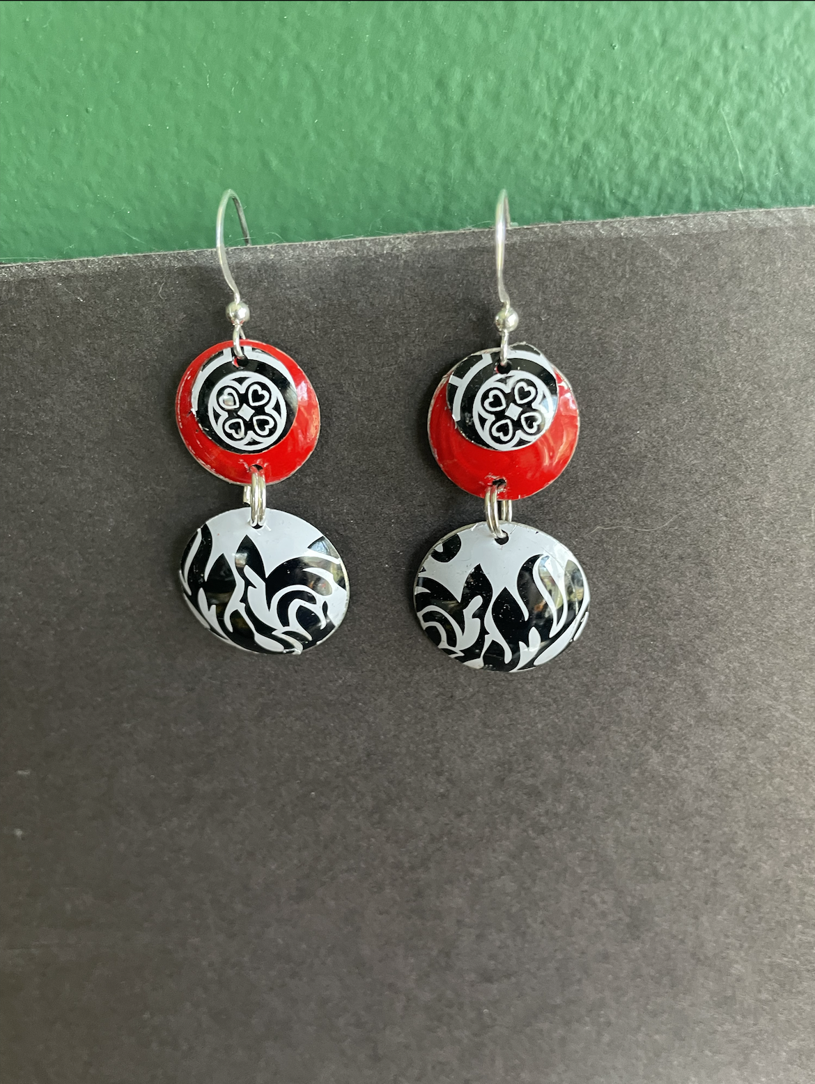 Tins are very light making them ideal for earrings as they don't weigh down your ears as the day goes on. Did you know the proper term for working with tin is "tinkering"? That made me really happy. I literally tinker in my art studio! I use old cookie tins, tea tins, and the like, break them down, and hand cut them into shapes and hand-hammer them into the 3-D shape I want them to be, finish and polish them, before putting them together like any other jewelry.