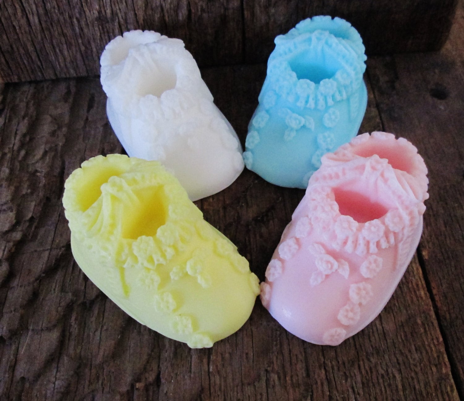 Celebrate a sweet new arrival with this adorable baby girl bootie shea butter soap, beautifully detailed with decorative flowers and a delicate ribbon tie. This charming handmade soap makes a thoughtful favor or gift for baby showers, new moms, prize giveaways, and nursery-themed celebrations.