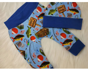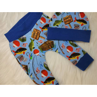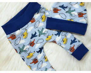 Super fun and cute Whale Sea Life Cotton/spandex knit pants, and knotted baby hat with co-ordinating fabric at the waistband and legs in size 0-3 months.