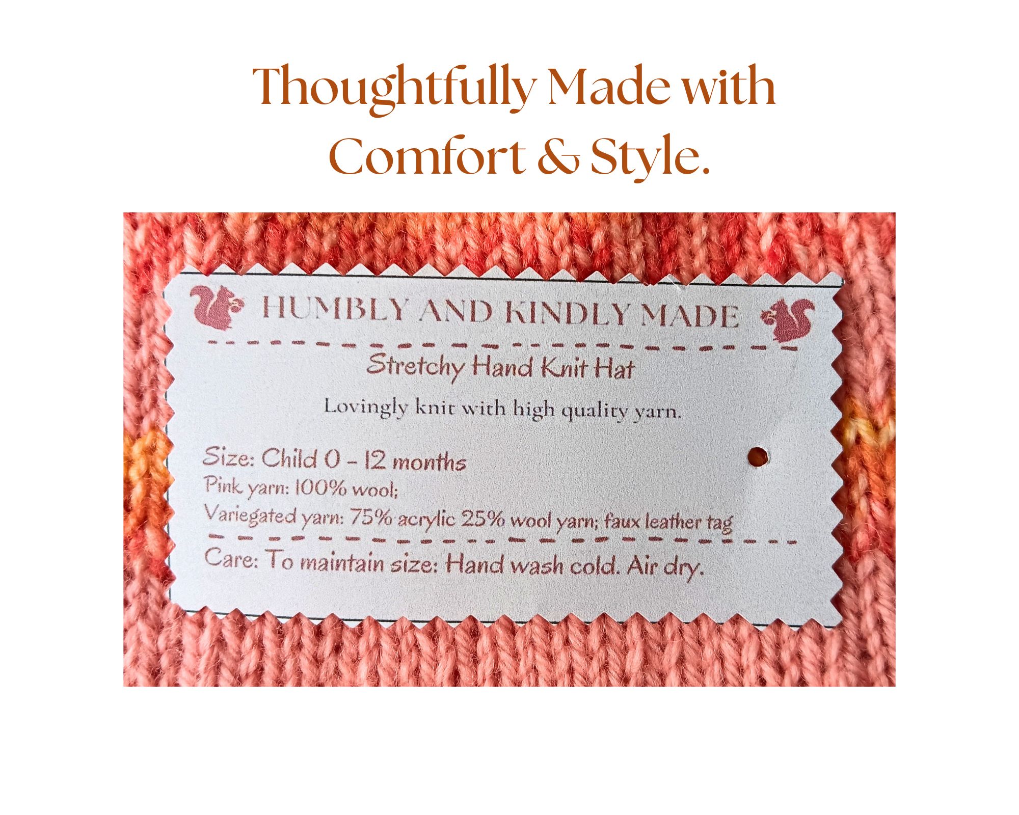 Soft, cozy, and handmade for babies to 12 months, this rustic pink and speckled yellow wool and acrylic hat brings cheerful warmth to chilly days.