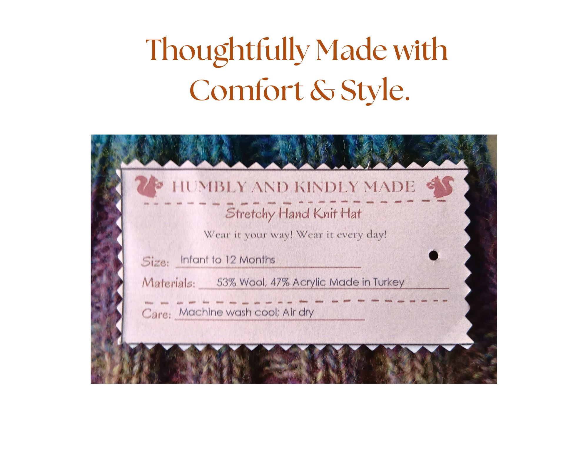 Soft, cozy, and handmade for babies to 12 months, this rustic purple and blue wool blend hat brings cheerful warmth to chilly days.