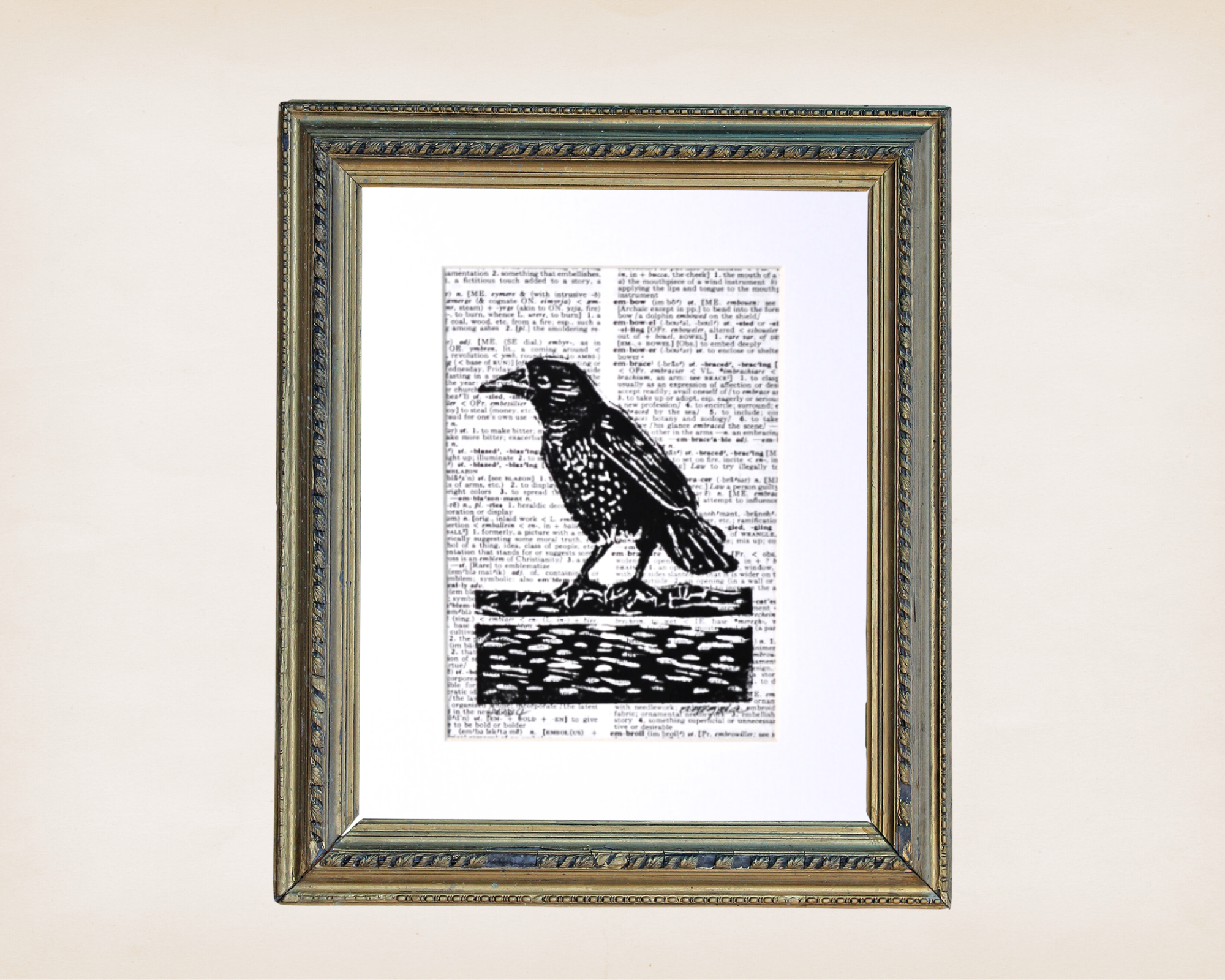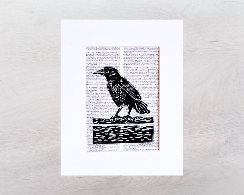 This backyard crow linocut is printed on an old dictionary page and comes in an 8 x 10-inch white mat ready for your frame, frame not included.