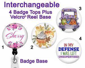 Badge reel with a Velcro badge top that can be placed on a reel and changed for a different top when desired.