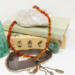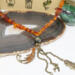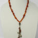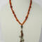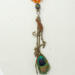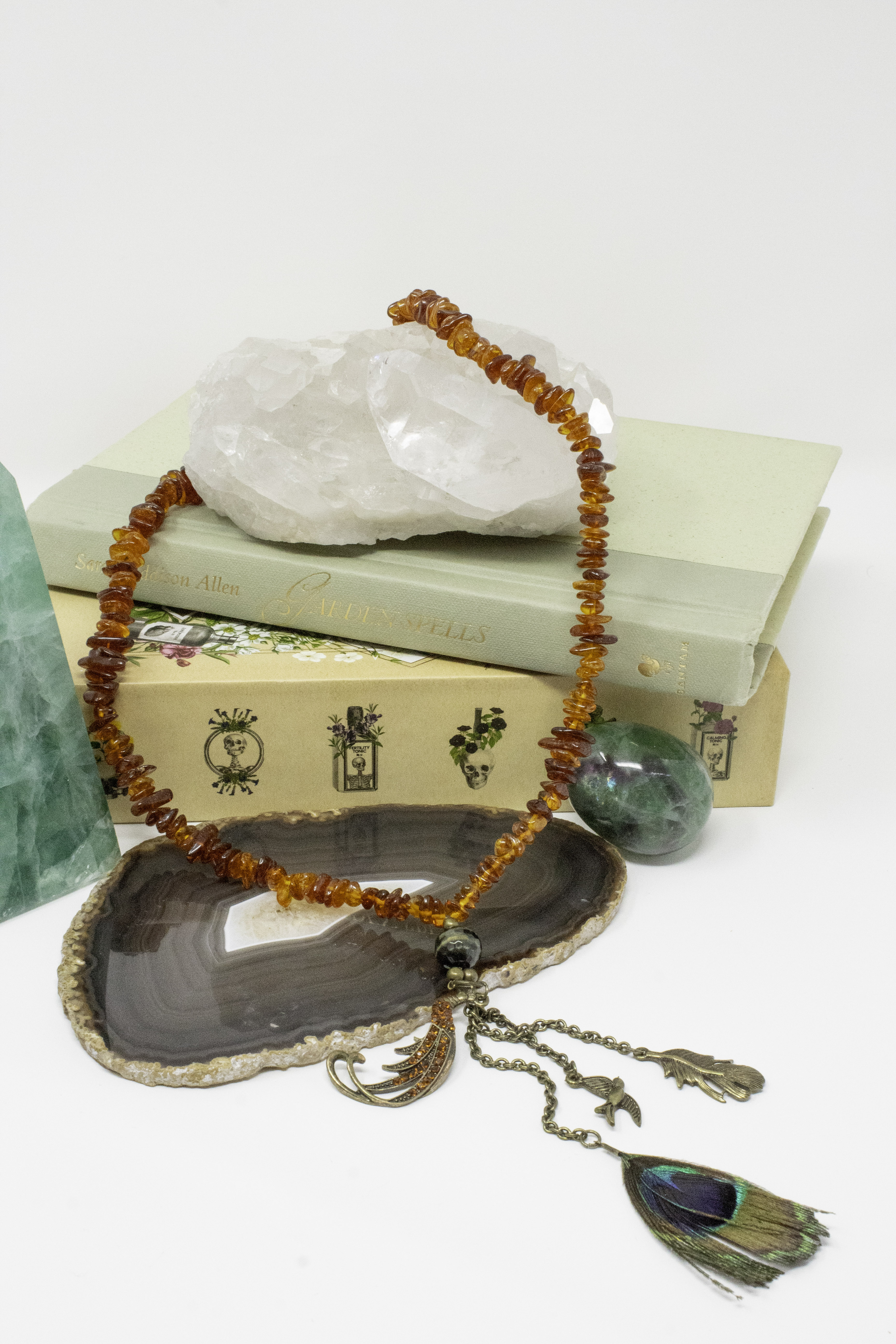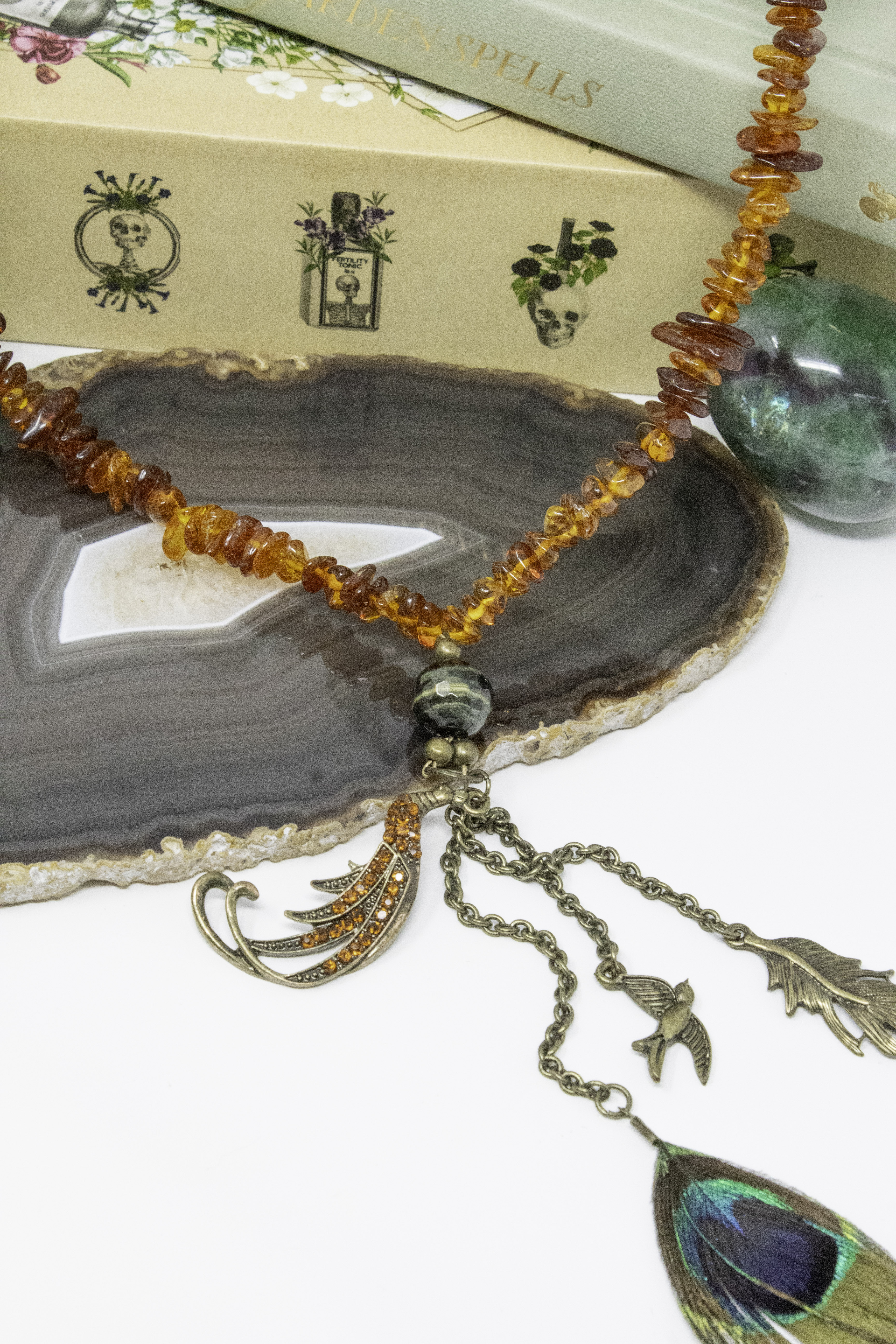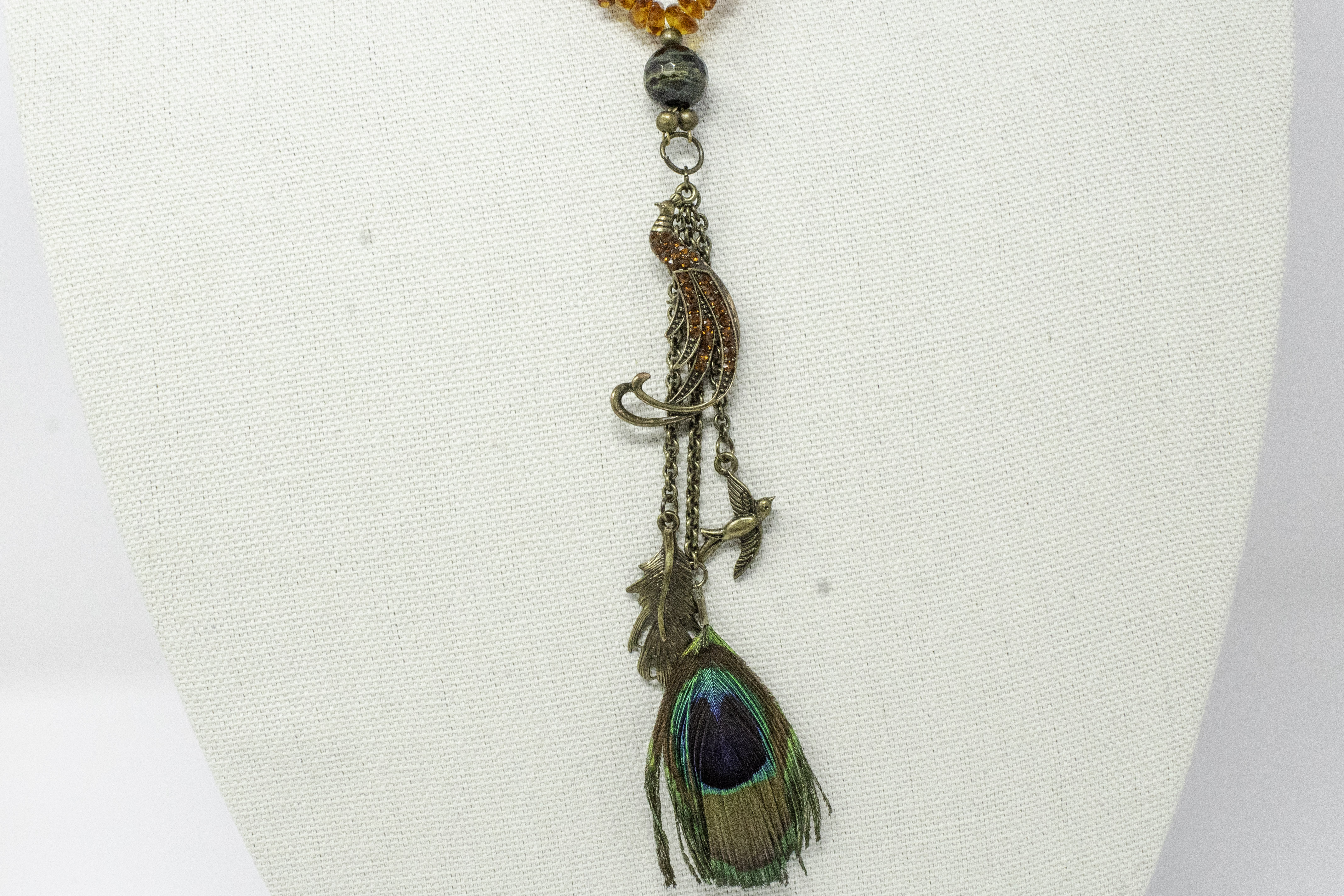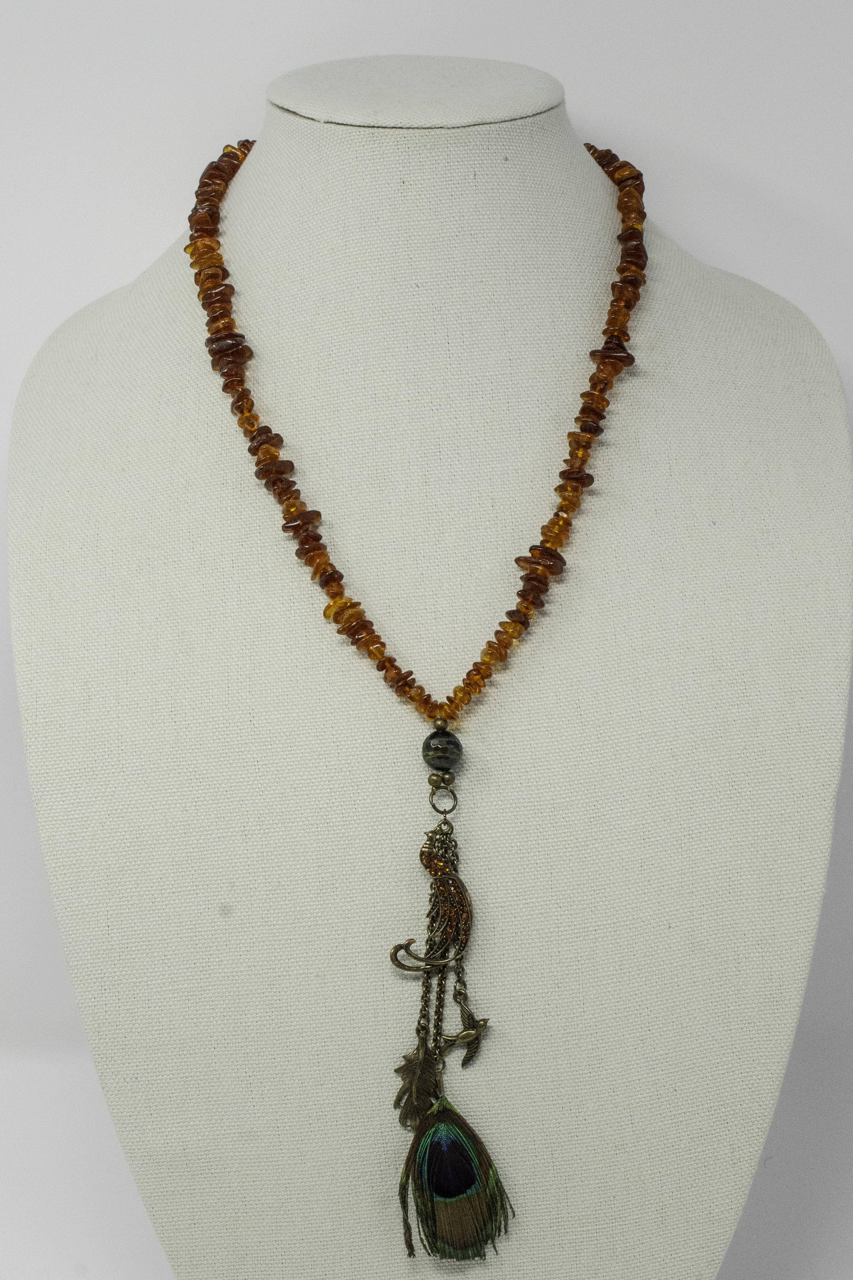 Glowing Baltic amber chips lead to a unique peacock pendant that features a real peacock feather accented with a faceted blue tige eye bead.