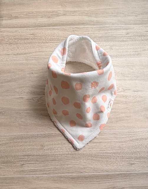 These adorable trendy little bandana bibs ae made with 100% cotton on the front and 100% cotton terrycloth on the back. They are very soft and super absorbent for all the little drools. Approx 17"X 8.5" from side to side and top to bottom. I used double Kam Snaps for adjustable sizing. These bibs can be machine washed and low heat also can be pressed if needed. Always wash baby items before using. Caregivers assumes all responsibility for use of any of these baby products.