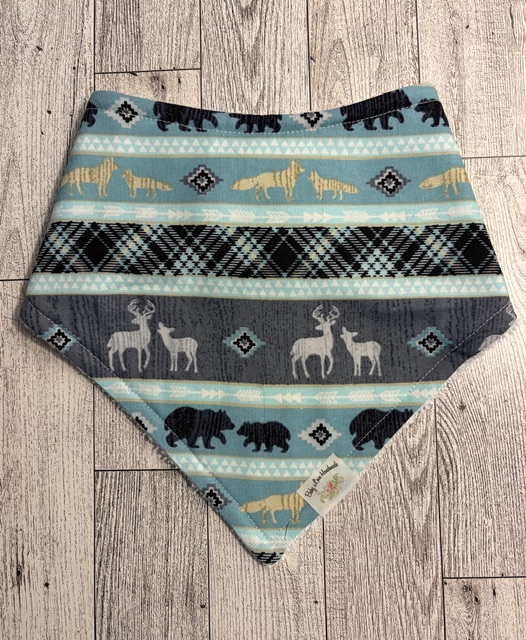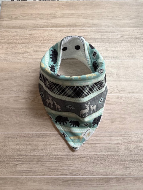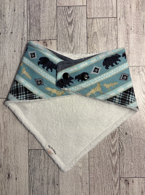 These adorable trendy little bandana bibs ae made with 100% cotton on the front and 100% cotton terrycloth on the back. They are very soft and super absorbent for all the little drools. Approx 17"X 8.5" from side to side and top to bottom. I used double Kam Snaps for adjustable sizing. These bibs can be machine washed and low heat also can be pressed if needed. Always wash baby items before using. Caregivers assumes all responsibility for use of any of these baby products.