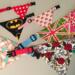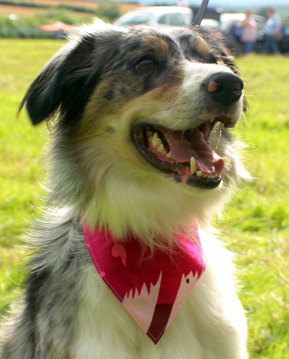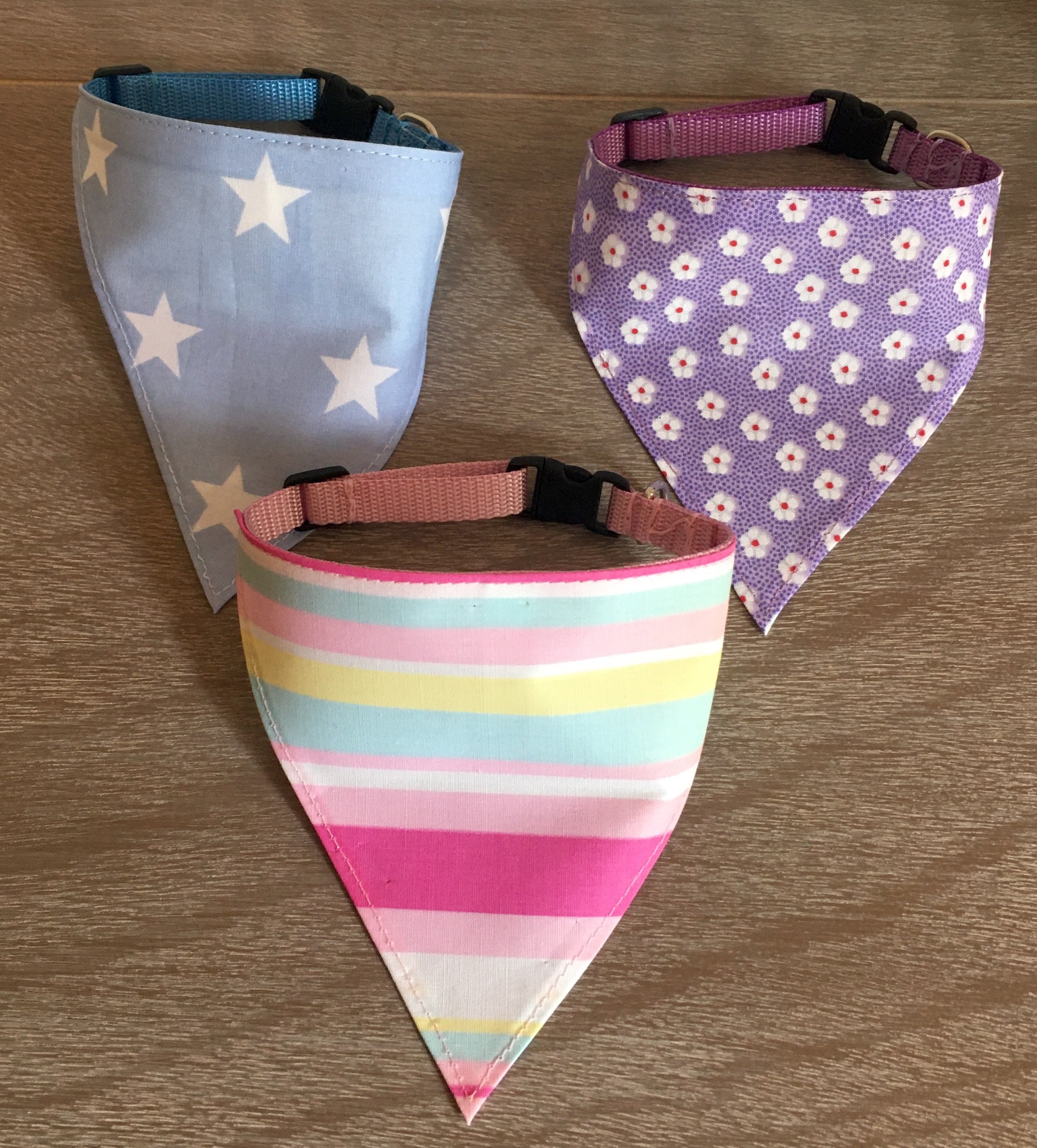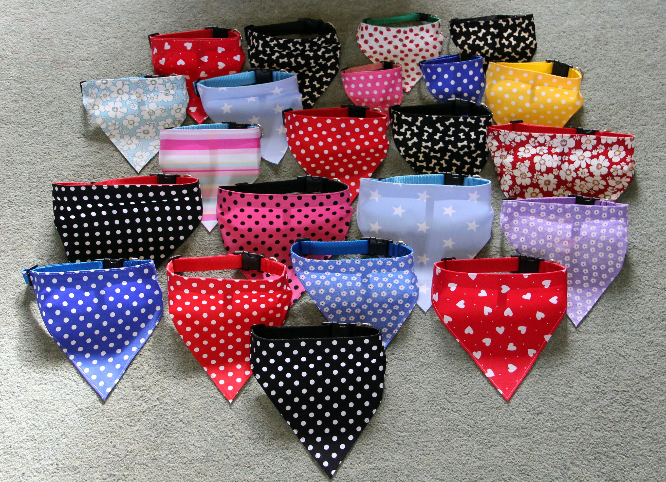 The last photo shows 10mm width bandanas. Made to measure for your dog - bandana size will scale up or down, according to the length of the collar - choose neck size from drop-down menu when buying.
