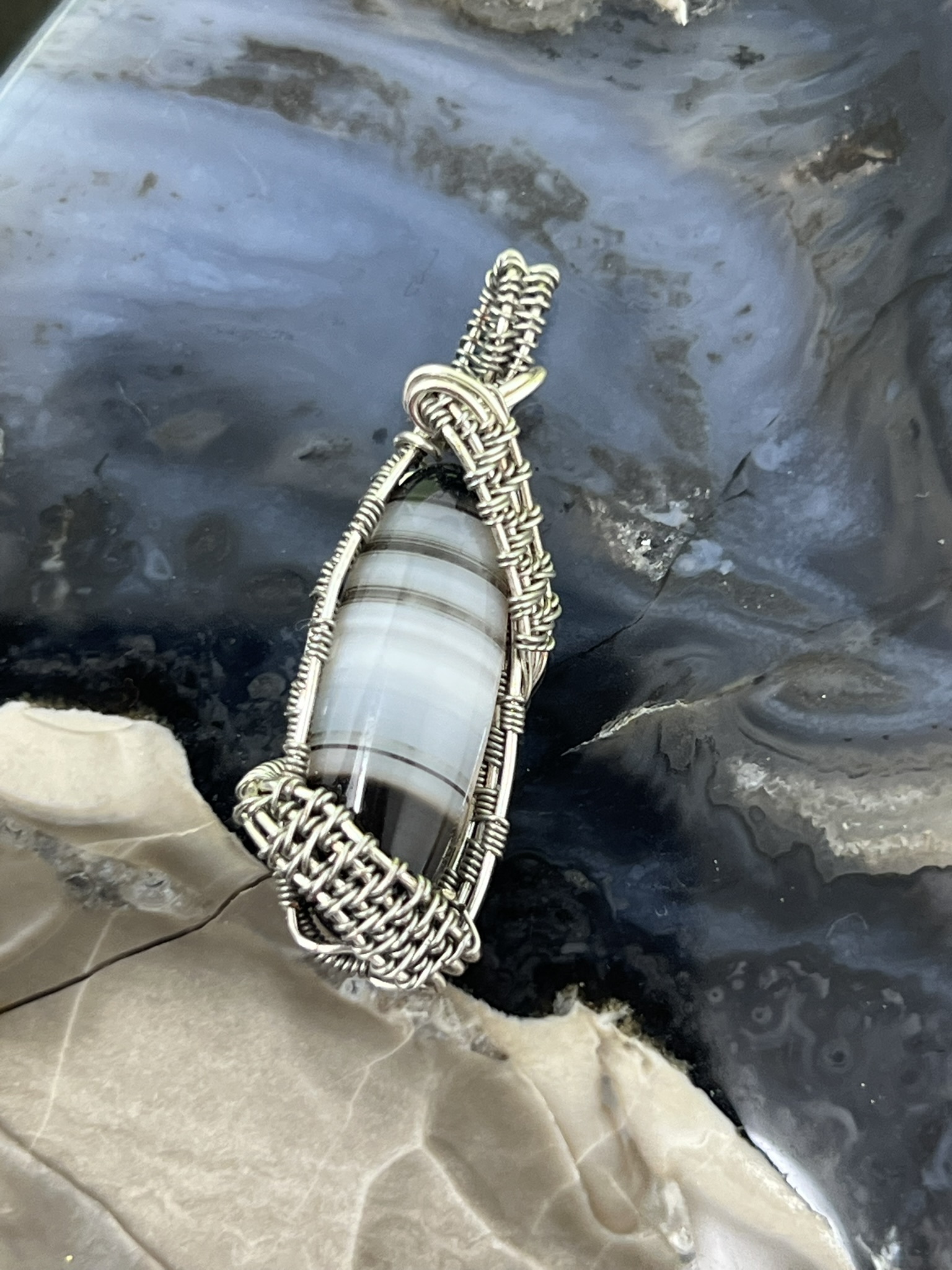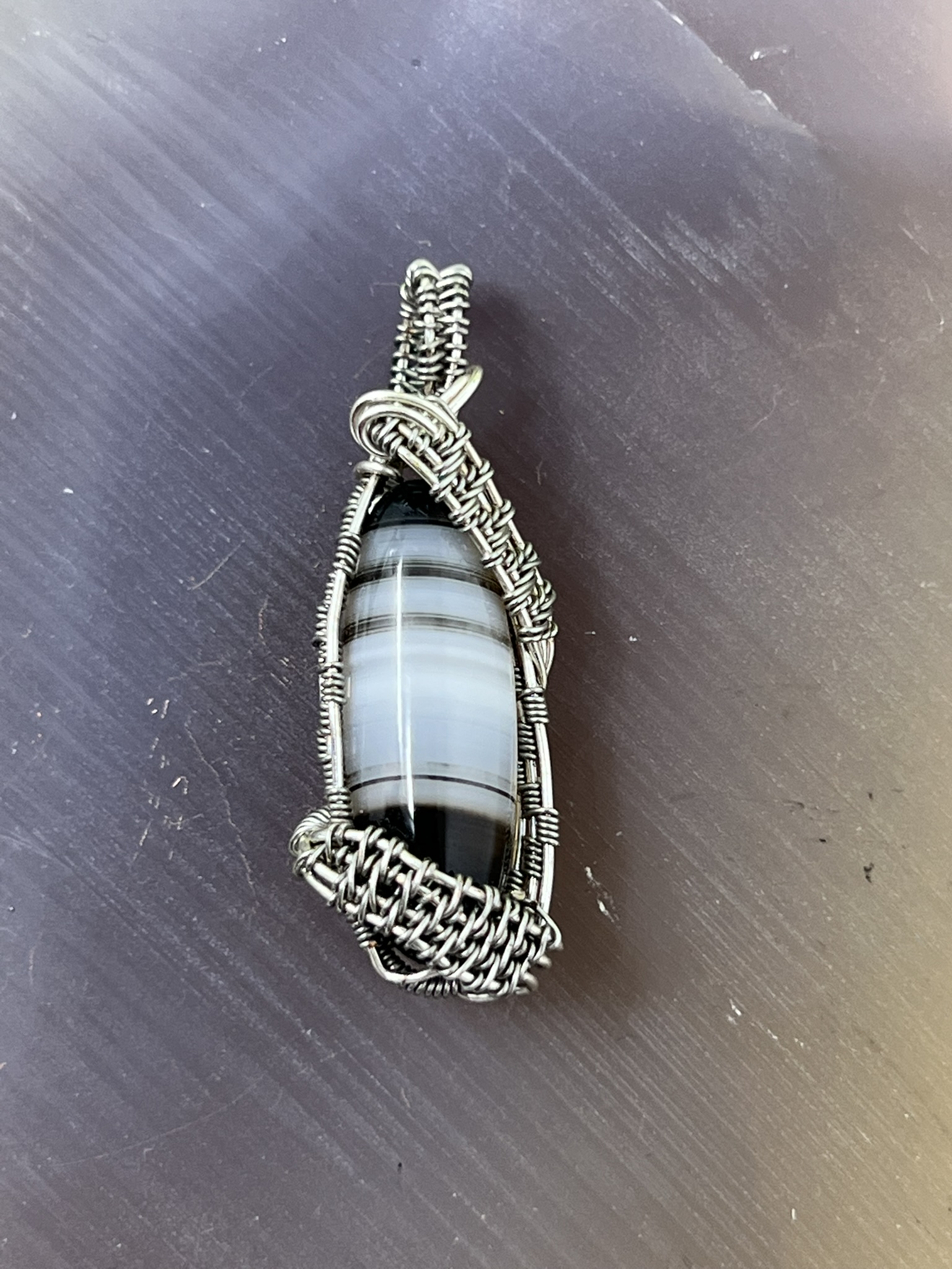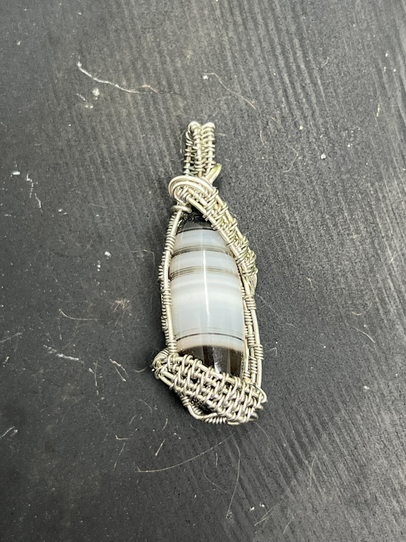 This unique pendant features a gorgeous piece of banded black onyx. I have elegantly wrapped this piece in 4 pieces of 22 gauge round silver colored, copper based wire. The wires are all connected together by weaving 26 gauge silver colored, copper wire around the 4 pieces of 22 gauge wire to make the frame and the scroll-like design on the front. The bail is made by weaving the 26 gauge wire around 2 pieces of the 22 gauge wire. This piece is handmade in Minnesota.