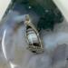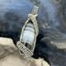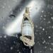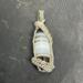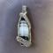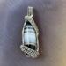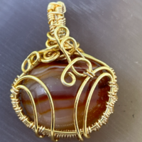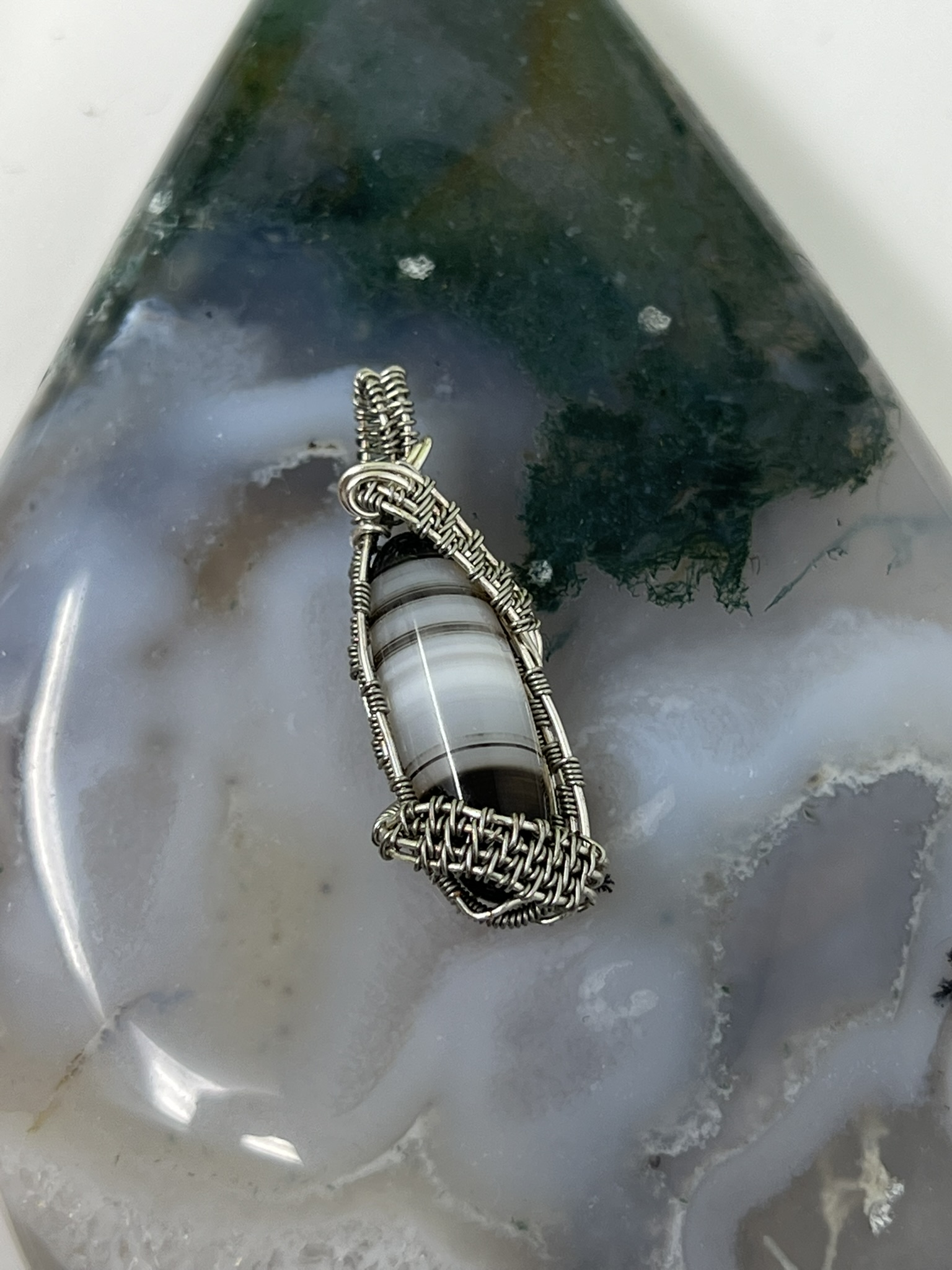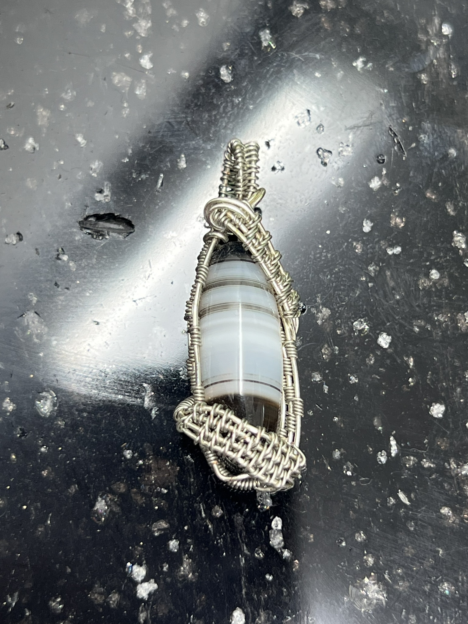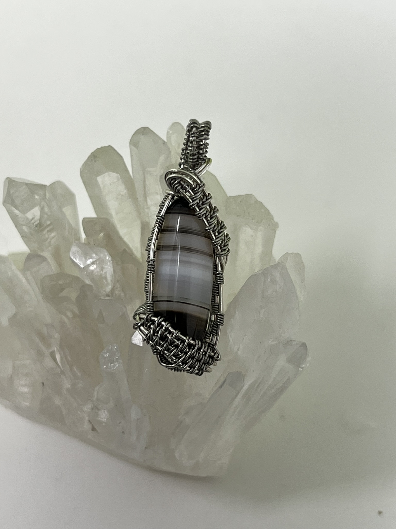 This unique pendant features a gorgeous piece of banded black onyx. I have elegantly wrapped this piece in 4 pieces of 22 gauge round silver colored, copper based wire. The wires are all connected together by weaving 26 gauge silver colored, copper wire around the 4 pieces of 22 gauge wire to make the frame and the scroll-like design on the front. The bail is made by weaving the 26 gauge wire around 2 pieces of the 22 gauge wire. This piece is handmade in Minnesota.