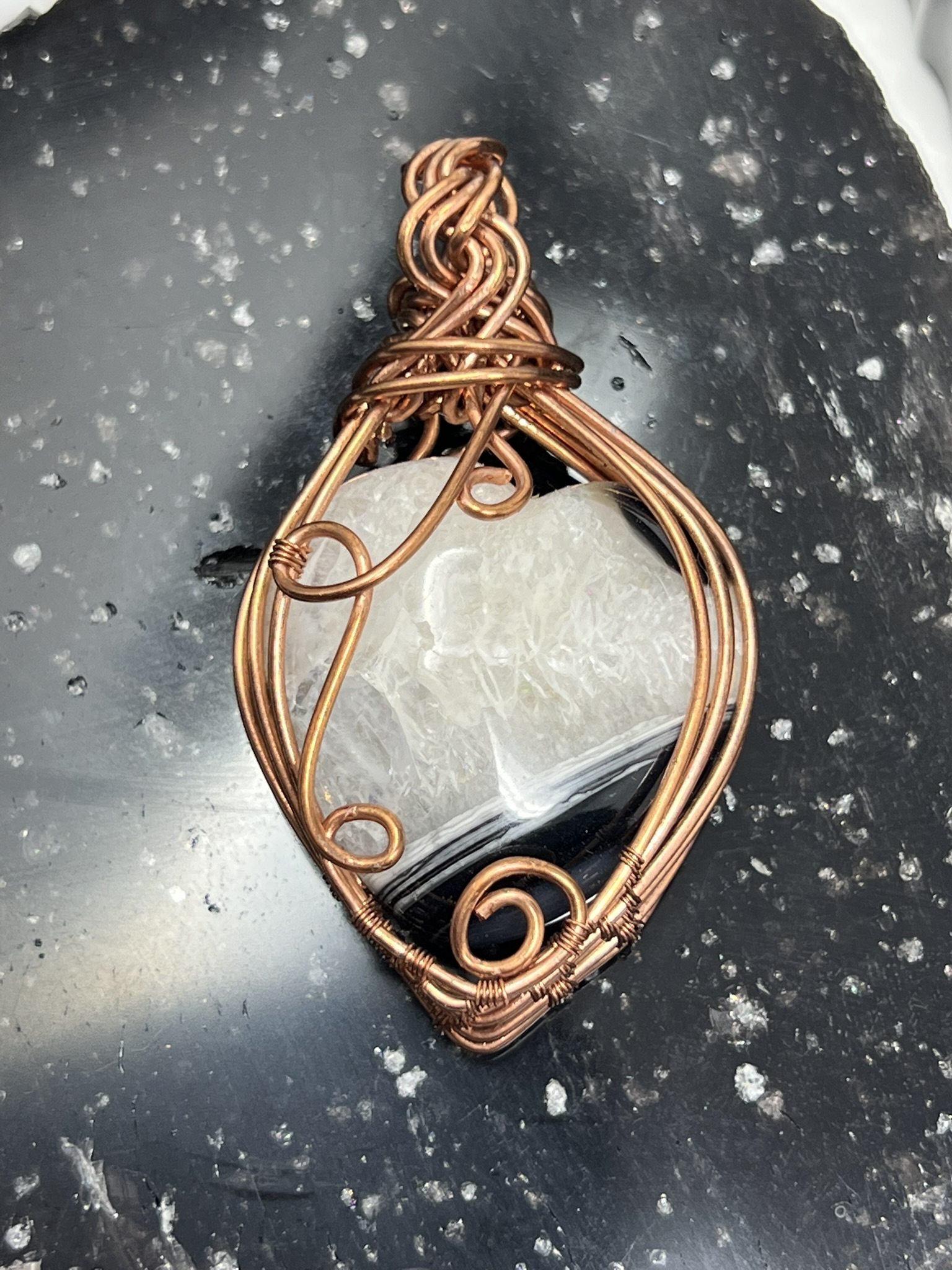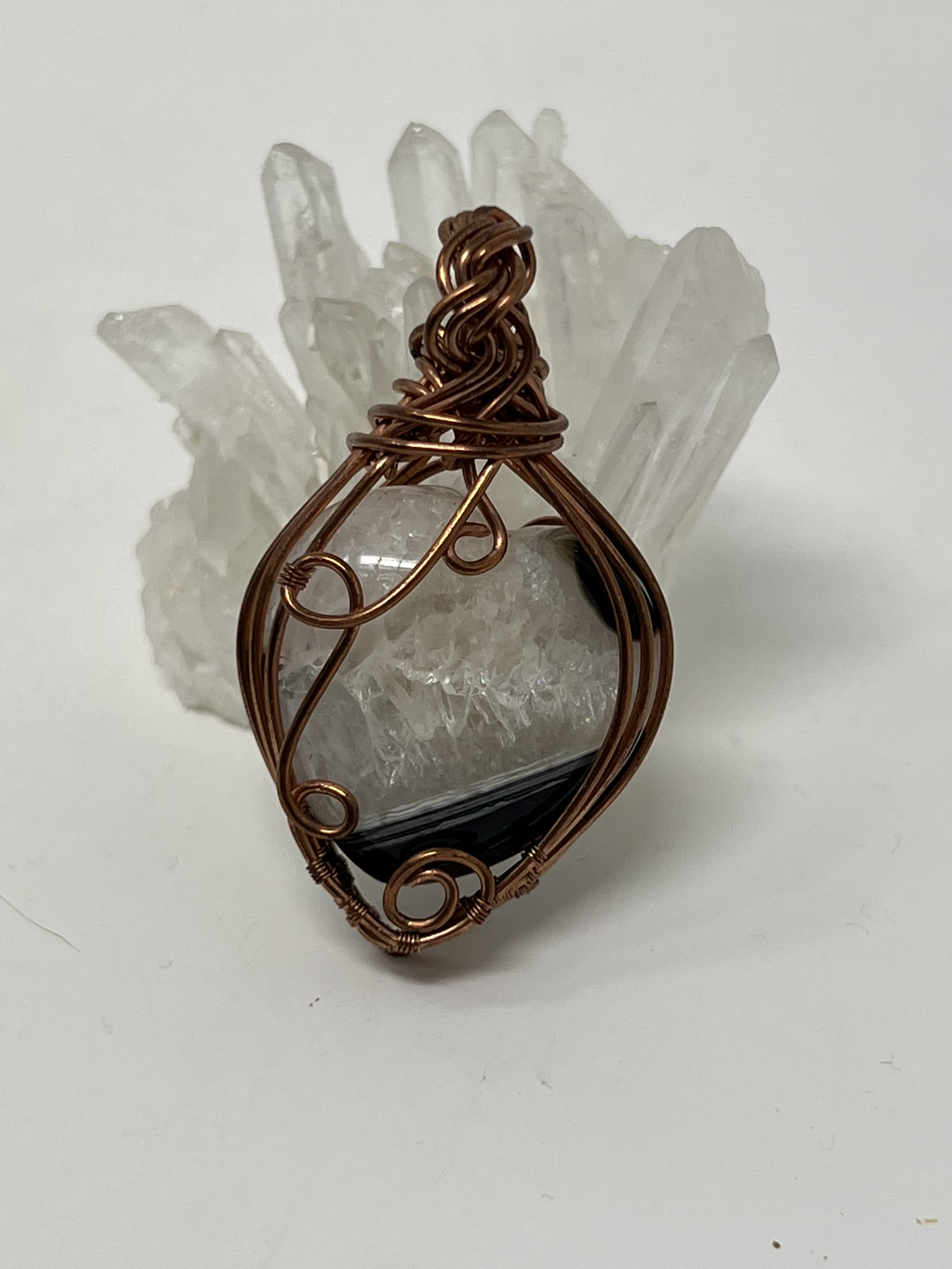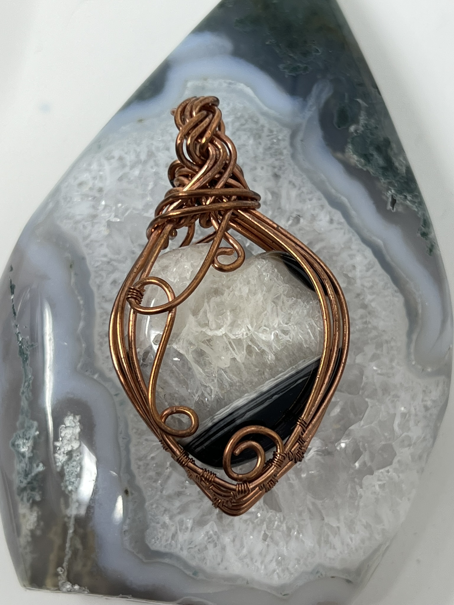 This stunning pendant features a black onyx heart that has been wrapped in copper wire. To create this piece, I took 6 pieces of 18 gauge round copper wire and connected them at the bottom by weaving a piece of 28 gauge round copper wire around them. The bail is made by braiding 6 pieces of the 18 gauge round copper wire together. I have added a cute little tight swirl at the bottom with one of the pieces of 18 gauge round copper wire and added a cute, swirly vine on the side with another piece of the 18 gauge round copper wire. This piece is handmade in Minnesota.