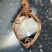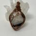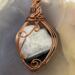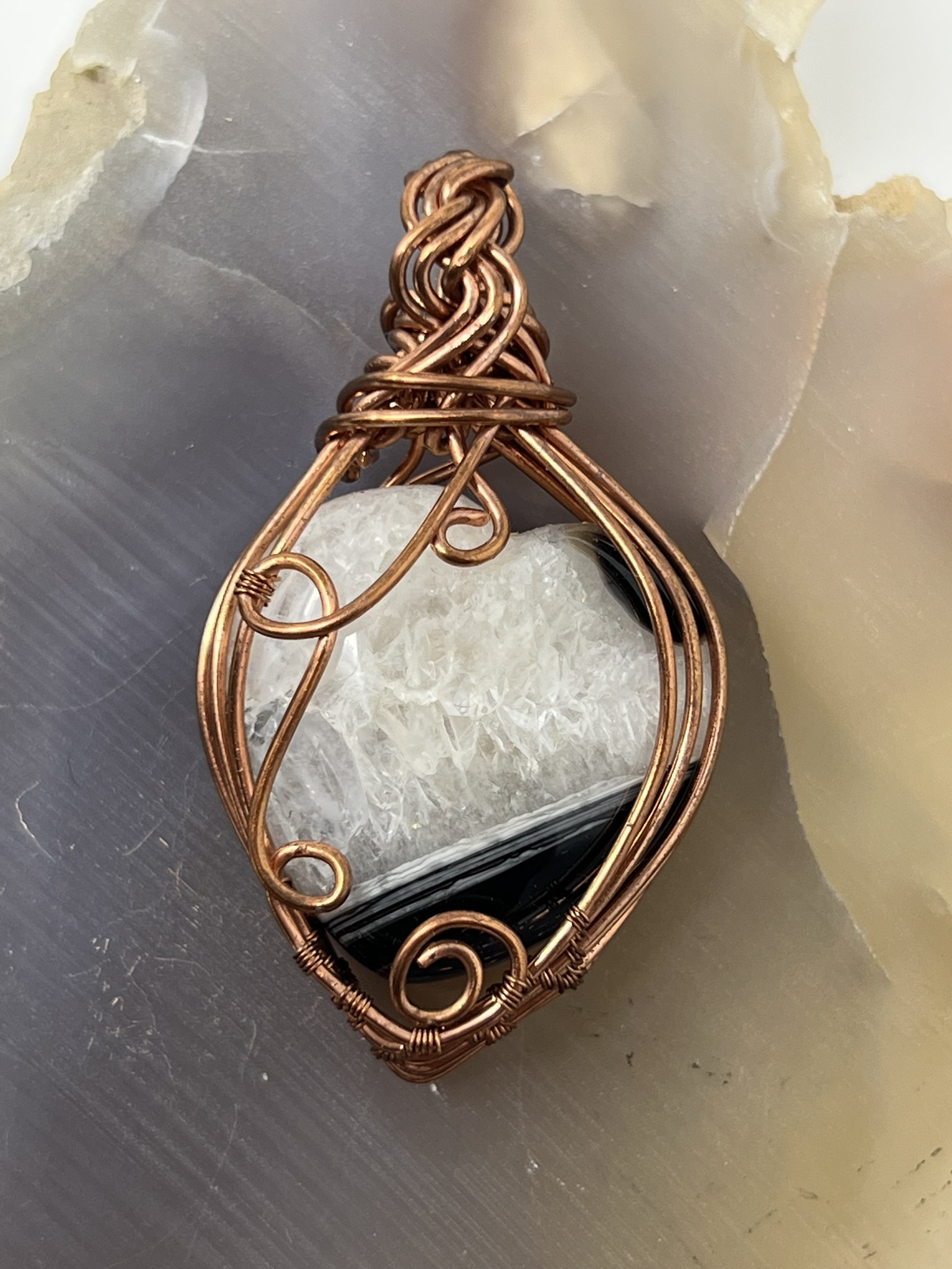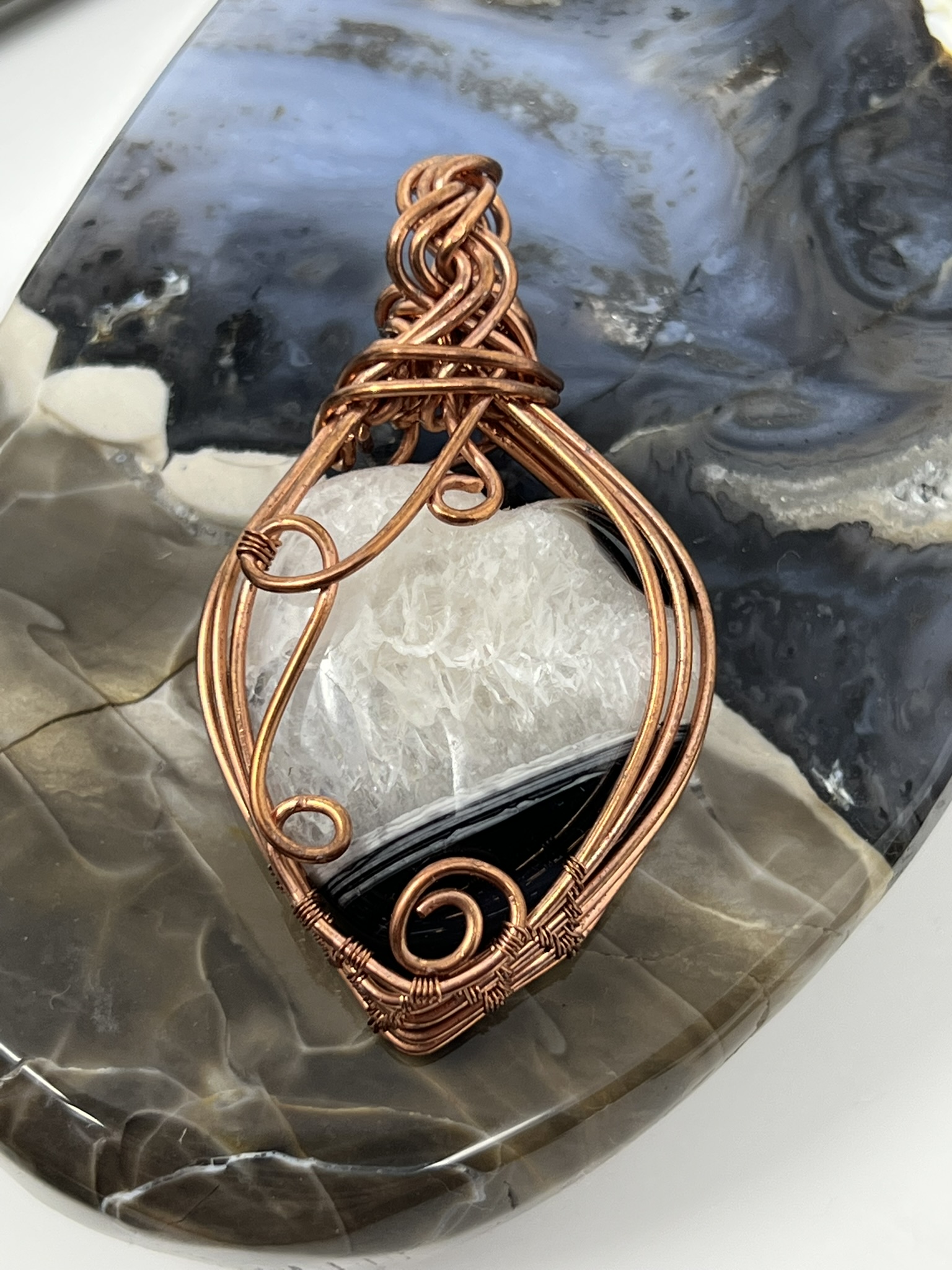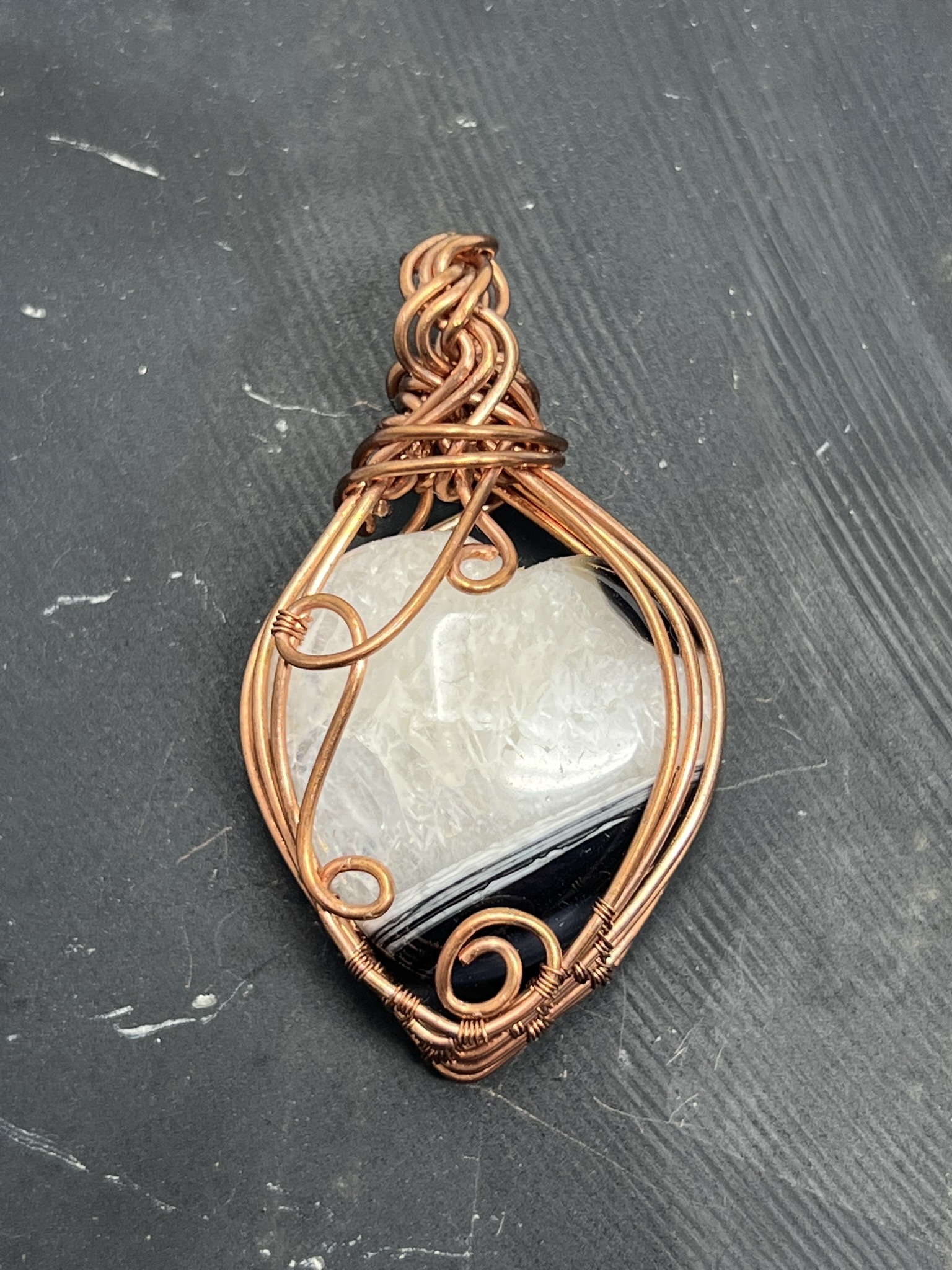 This stunning pendant features a black onyx heart that has been wrapped in copper wire. To create this piece, I took 6 pieces of 18 gauge round copper wire and connected them at the bottom by weaving a piece of 28 gauge round copper wire around them. The bail is made by braiding 6 pieces of the 18 gauge round copper wire together. I have added a cute little tight swirl at the bottom with one of the pieces of 18 gauge round copper wire and added a cute, swirly vine on the side with another piece of the 18 gauge round copper wire. This piece is handmade in Minnesota.