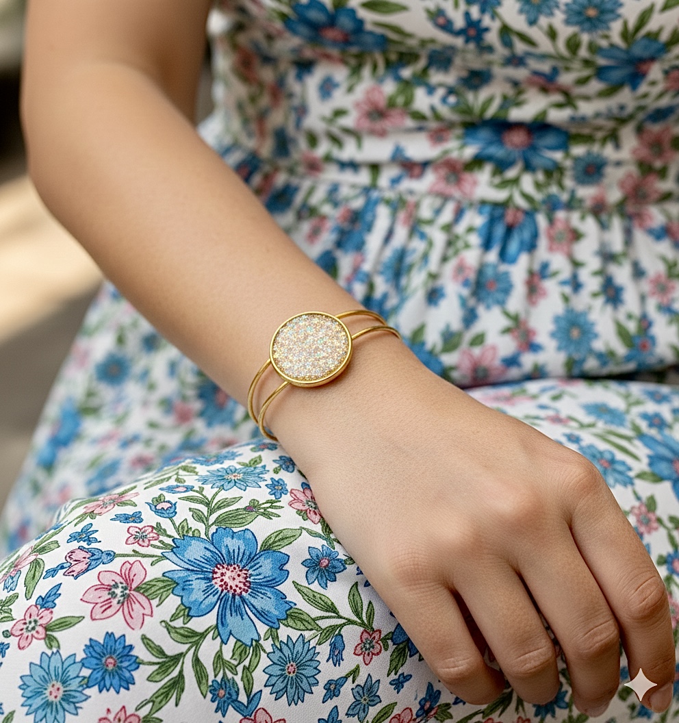 Crafted with a sleek double-wire gold-toned band, this bracelet offers a modern, minimalist silhouette while remaining incredibly comfortable for all-day wear. Whether you're dressing up for a garden party or adding a bit of magic to your everyday outfit, this cuff is the perfect statement piece.