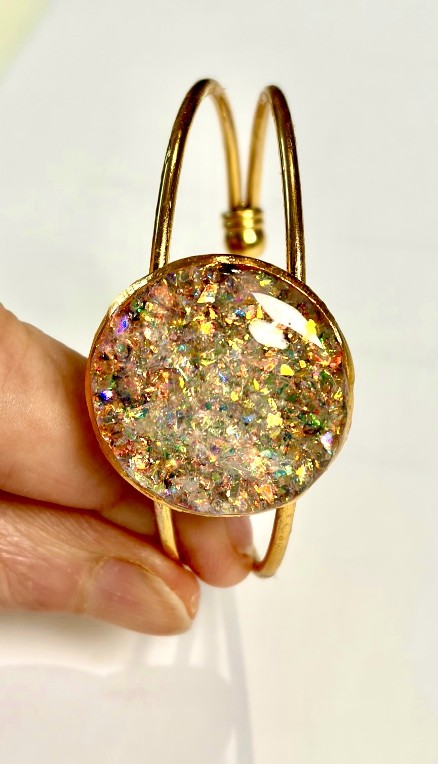 Elevate your style with this stunning handmade gold cuff featuring a shimmering iridescent center. Lightweight, elegant, and perfect for stacking or solo wear.