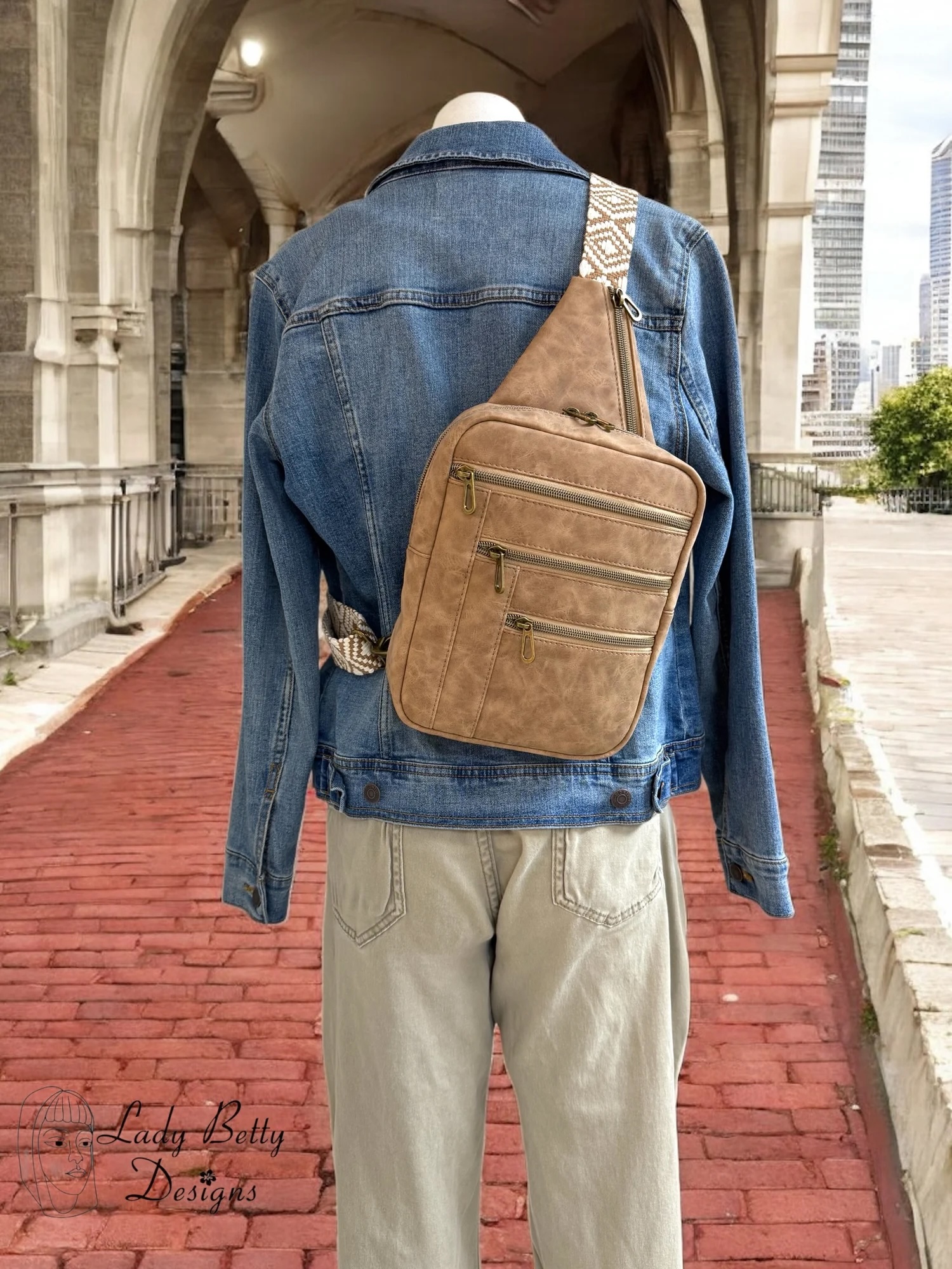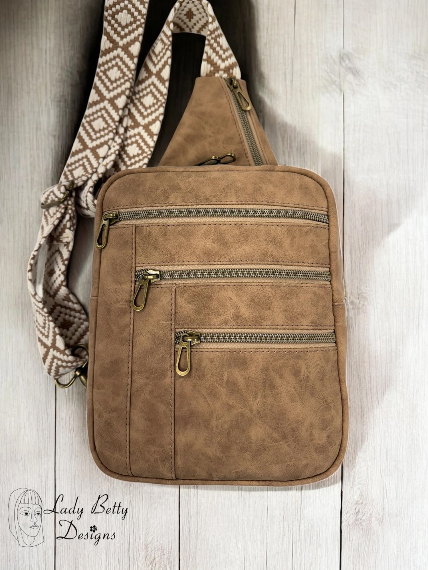 This sling is built for effortless organization. The front features three zippered pockets: