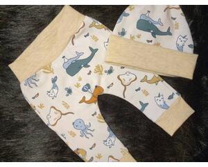 Such a fun sports themed baby set! This baseball Cotton/spandex knit pants, and knotted baby hat set, has coordinating fabric at the waistband and legs in size 0-3 months.