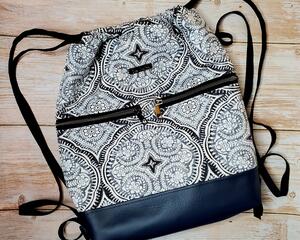 Black White and Gray Medallion Print Backpack with Black Faux...