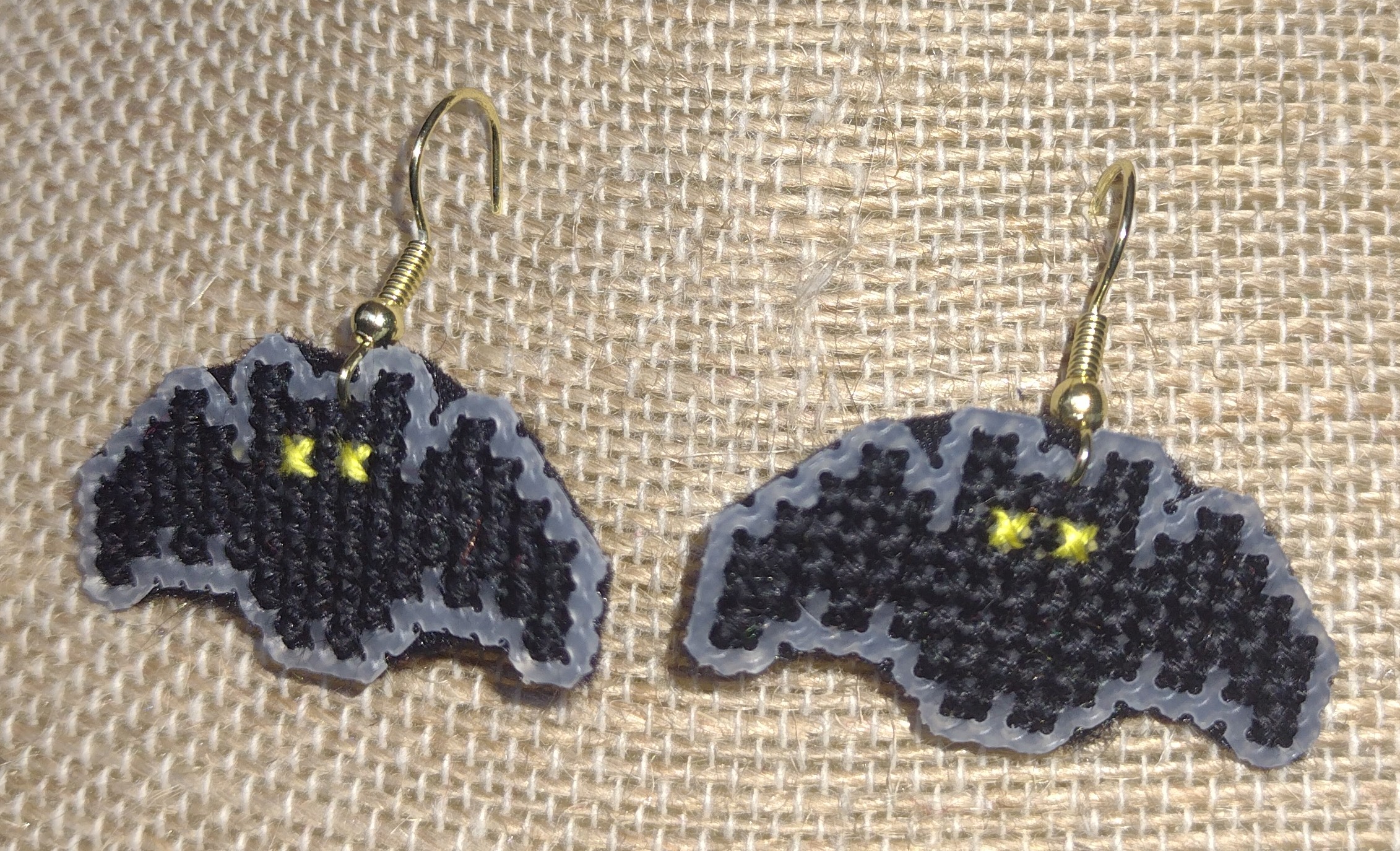 Get into the Spooky Season spirit with these little friends. These earrings are of black bats with yellow eyes. They are hand-stitched on plastic canvas, so they are very light weight. The backing is black felt.