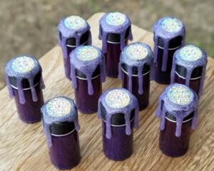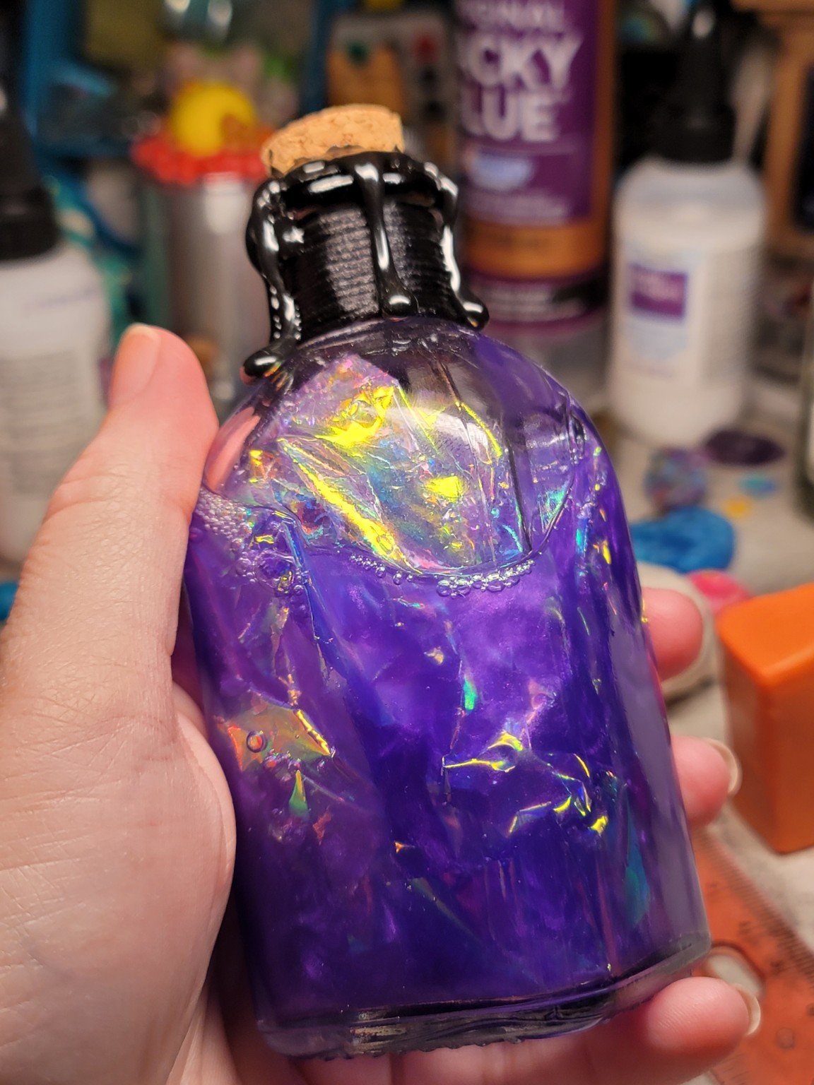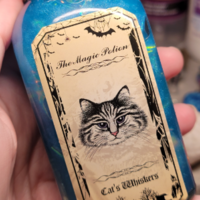 Every potion begins with a spark of imagination and a swirl of shimmering liquid. I blend glycerin and water to create a glowing, ethereal base, then tuck it inside a glass bottle where it dances with iridescent light. The vessel is sealed with hand-dripped black wax and crowned with a cork to guard its mysteries. Finally, the vintage-inspired label is applied, giving it the look of a true artifact plucked from a witch’s apothecary.