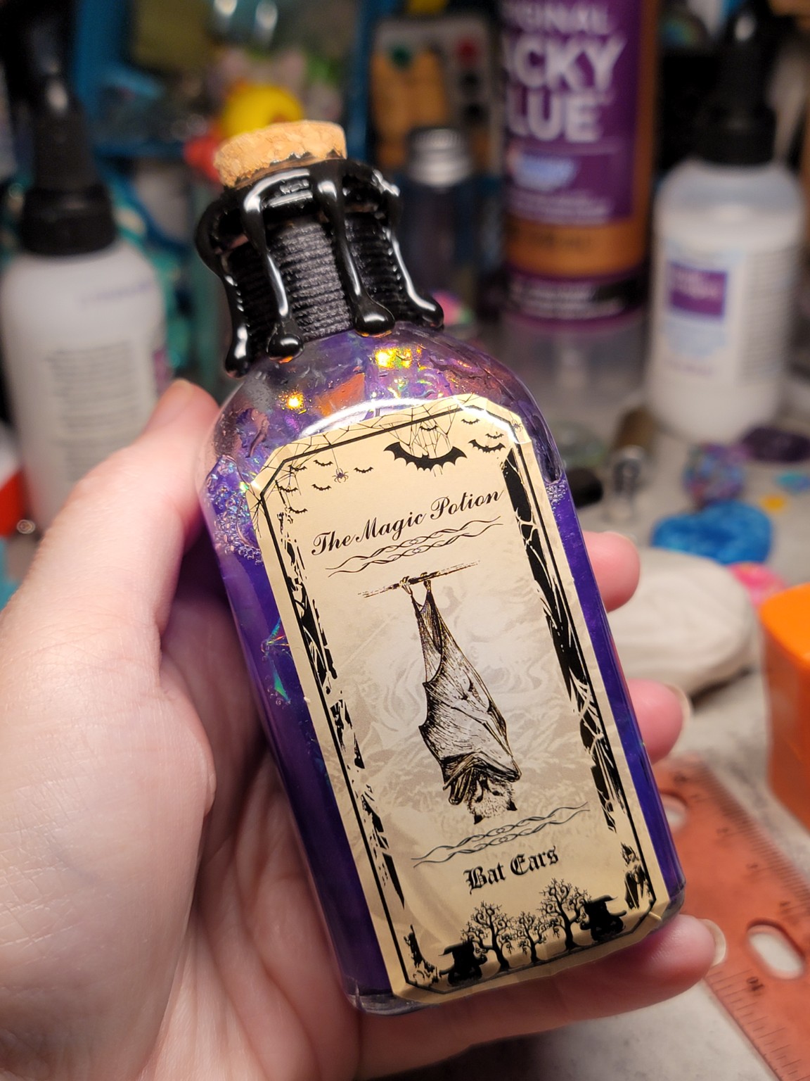 From the shadowy rafters of old cottages and moonlit caves, comes a potion said to capture the mystery of the night itself. This Bat Ears Elixir shimmers in shades of violet and flickering iridescence, as though twilight has been bottled for safekeeping. Standing 4.75" tall by 2" wide and deep, it is crowned with a cork stopper and sealed in drips of inky black wax, protecting the enchantment within.