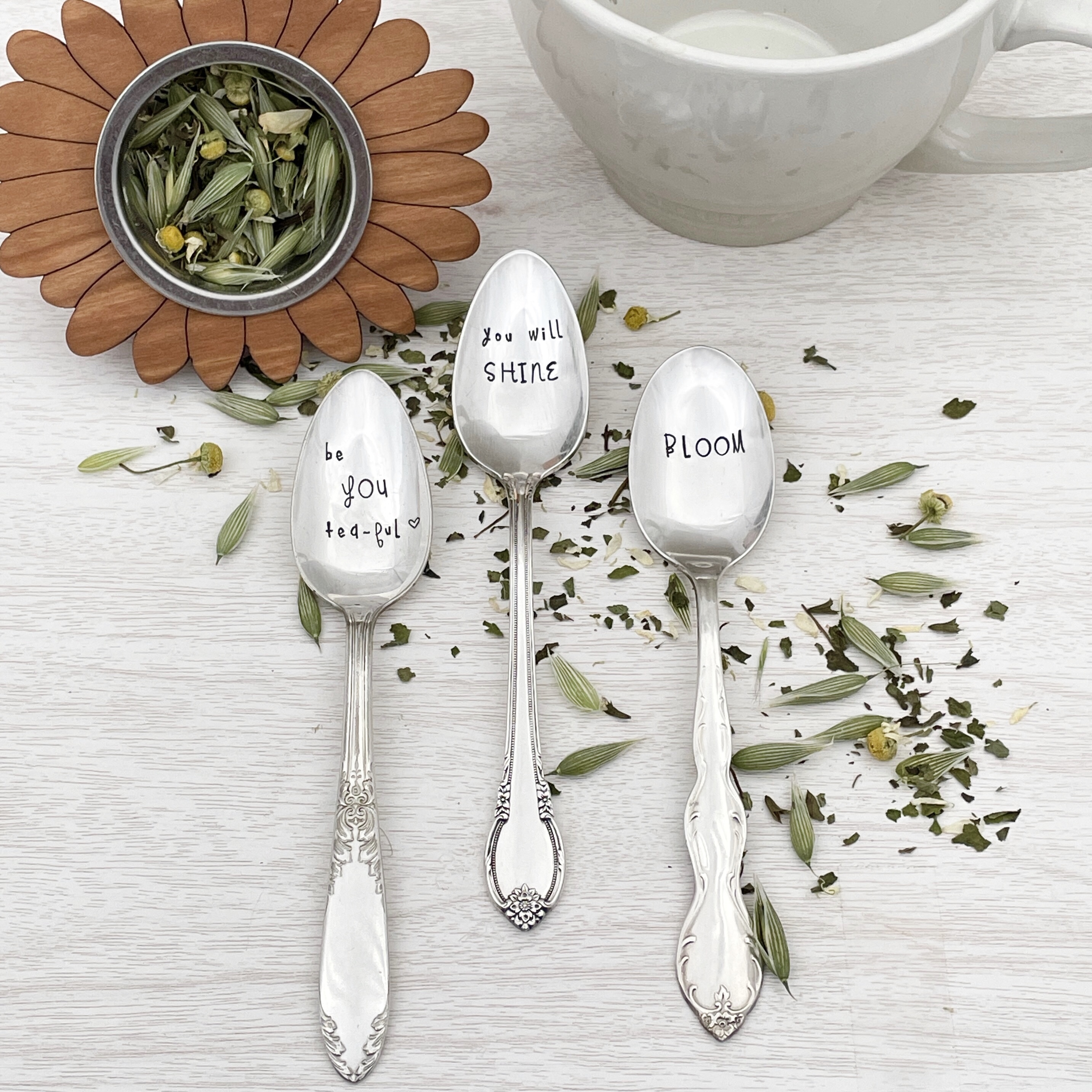 This listing is for one “Be YOU tea ful” teaspoon. Coordinating tableware is available in the shop, please stop by and take a peek - ** ProseAndPolish **