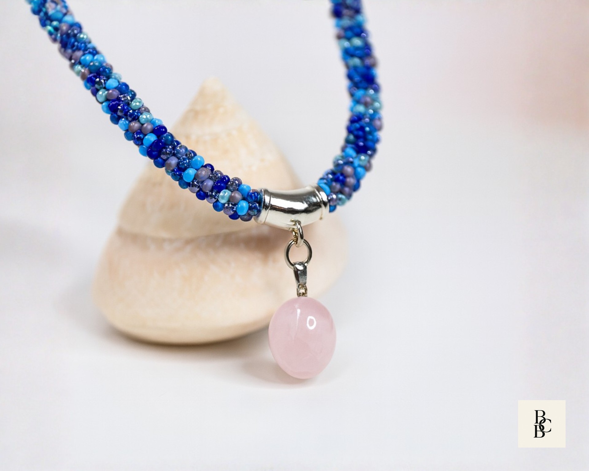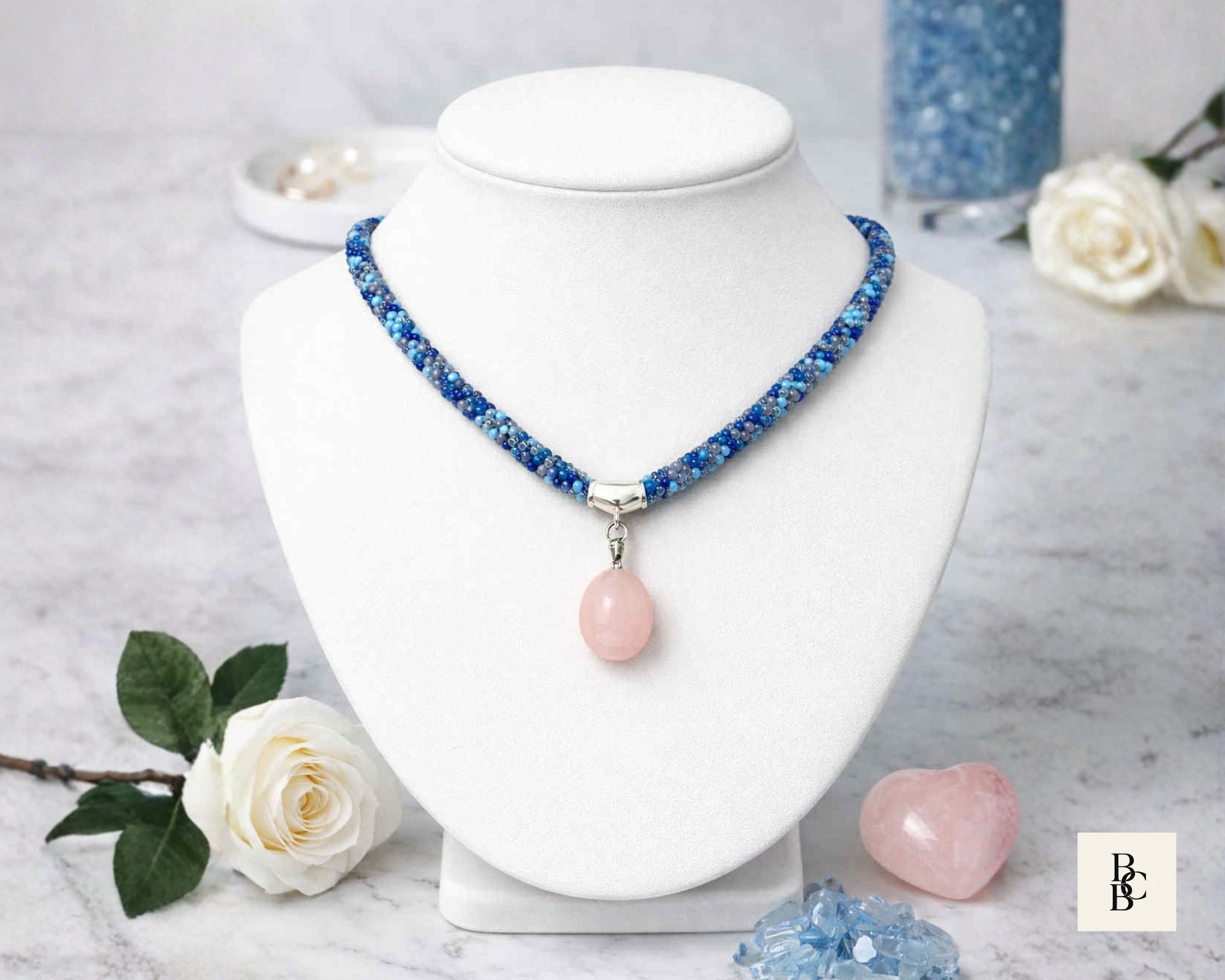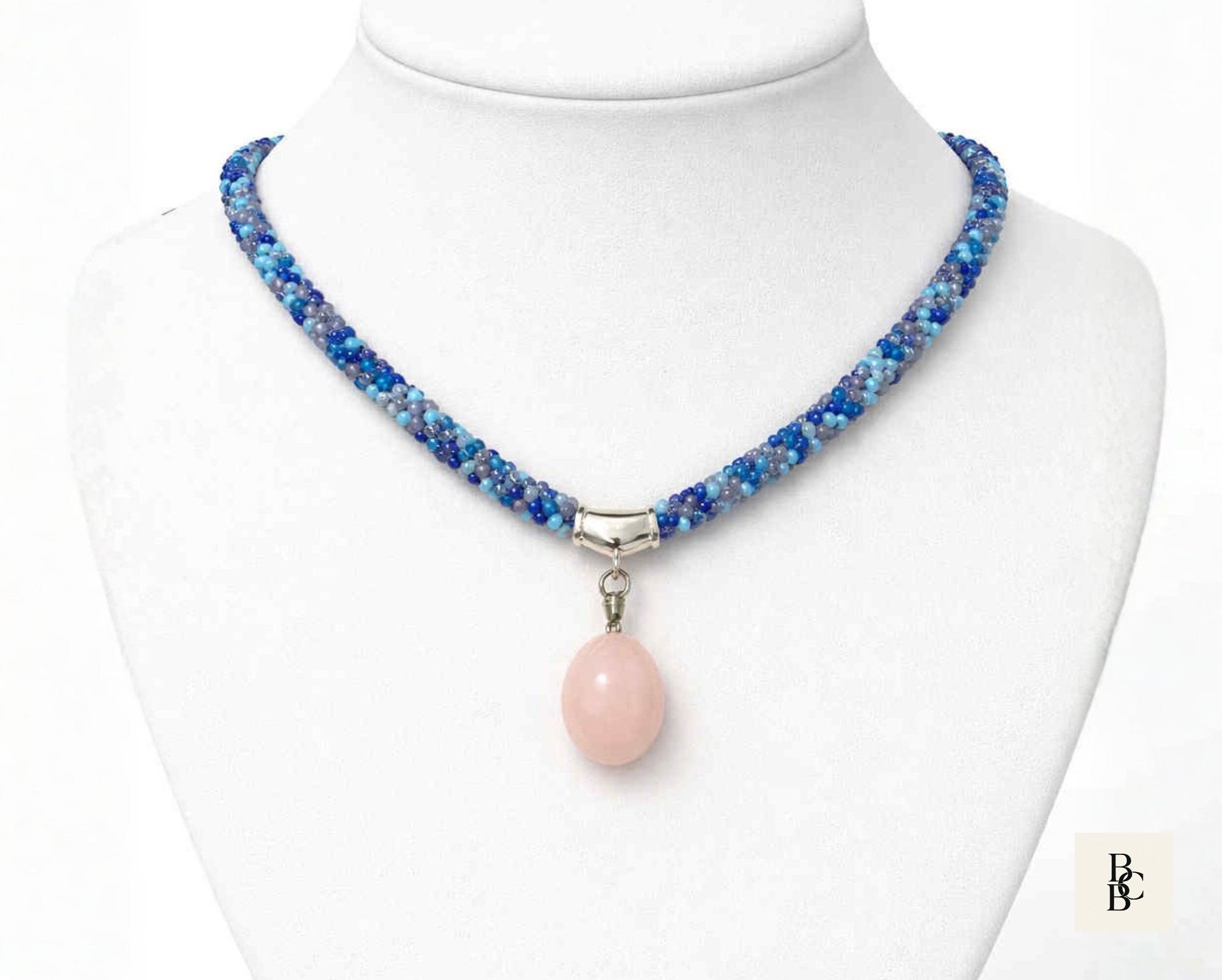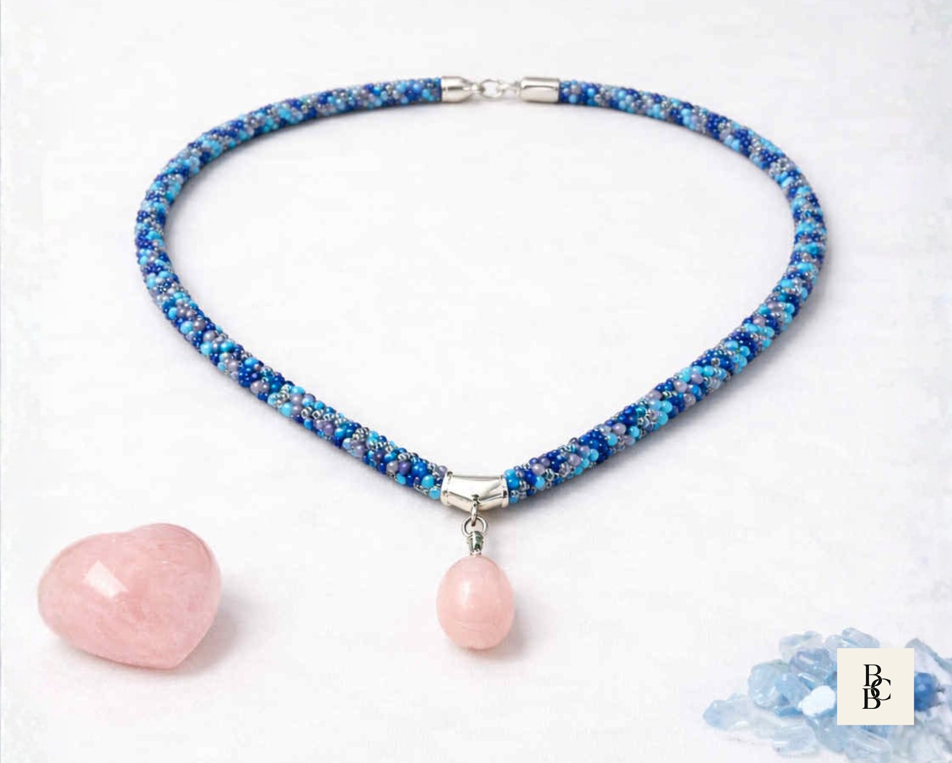 At the center hangs a softly polished rose quartz pendant, adding a gentle blush tone that pairs effortlessly with the cool blues and subtle neutrals woven throughout the braid. Rose quartz is often associated with calm, compassion, and emotional balance, making this necklace as meaningful as it is wearable.