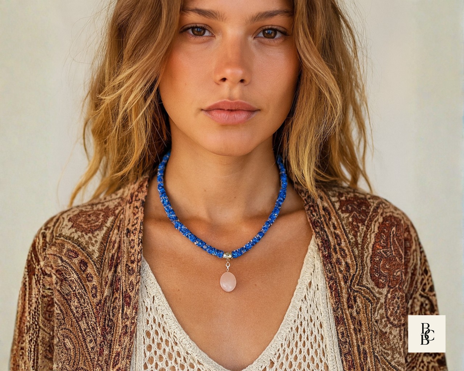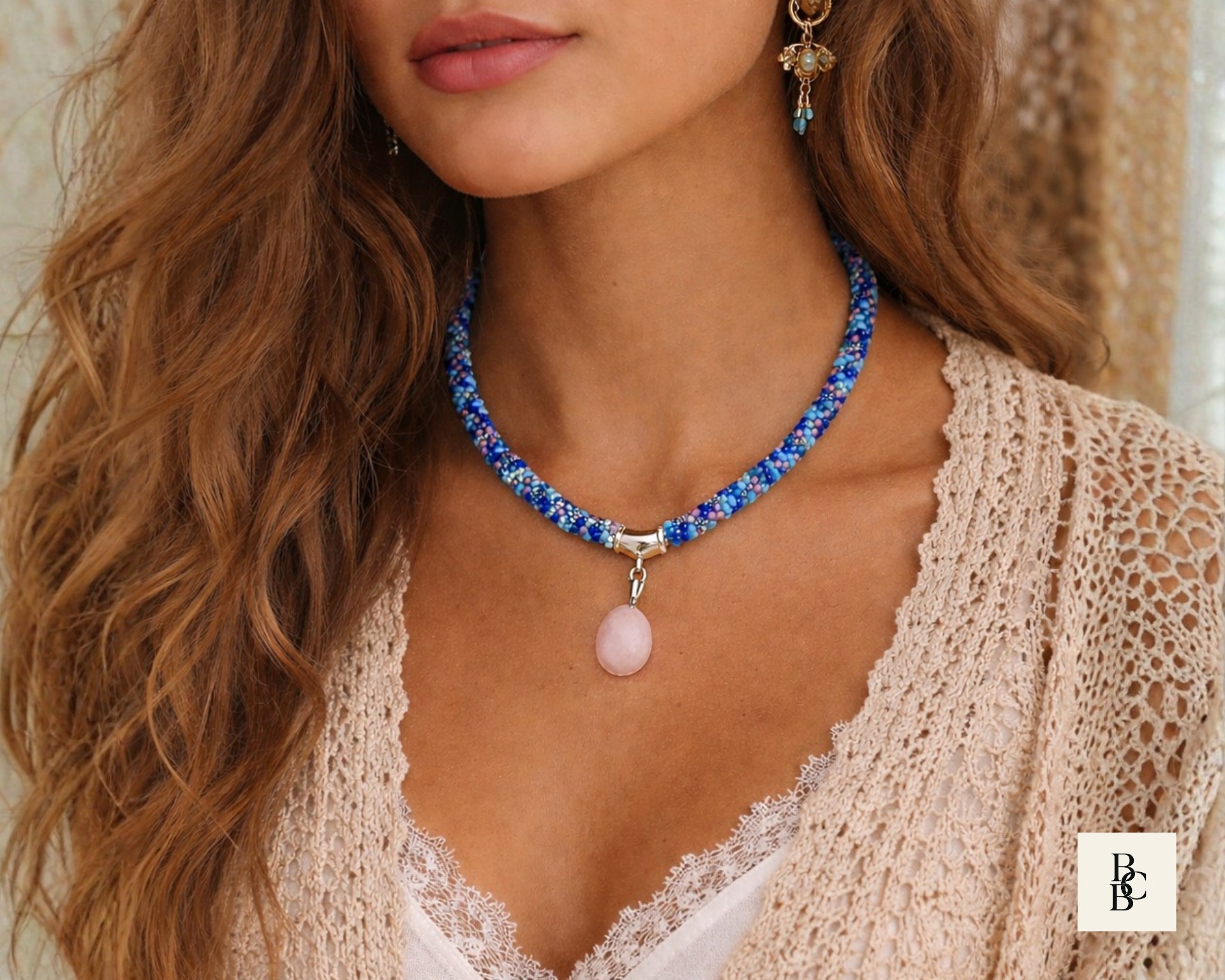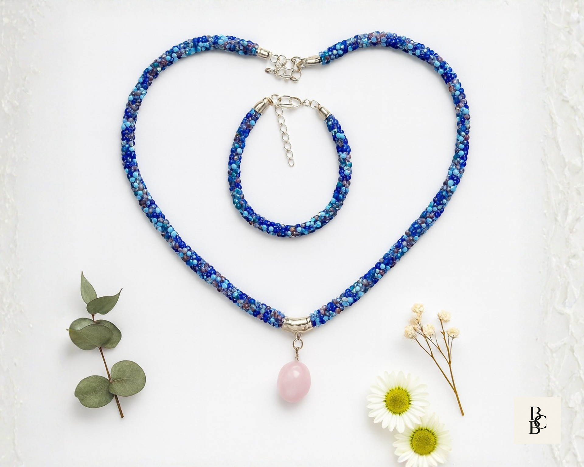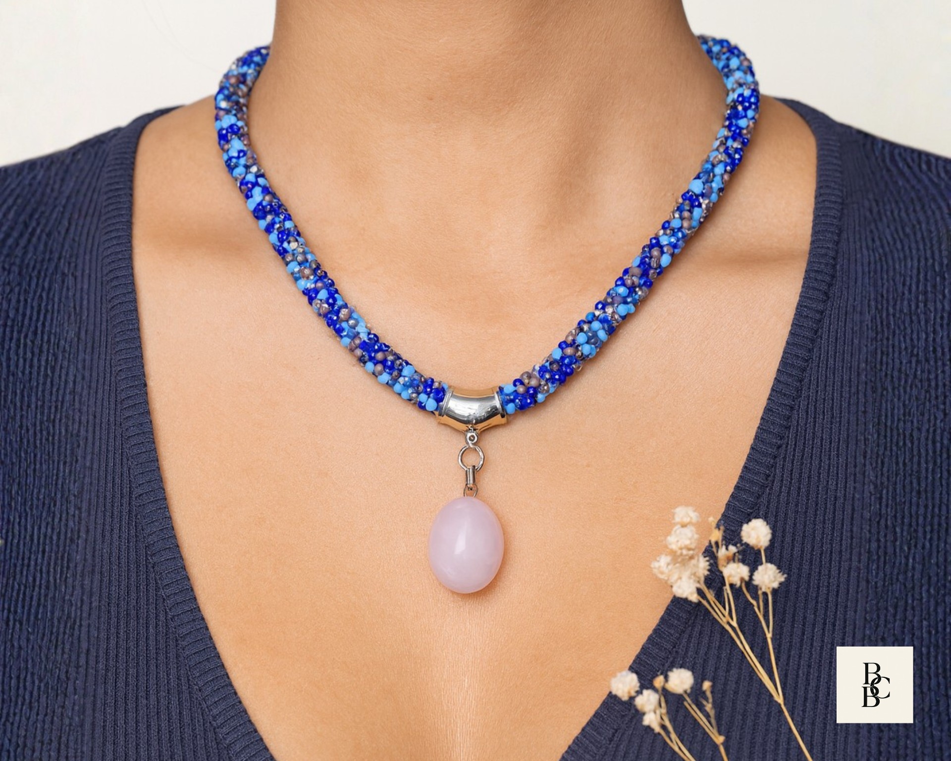 At the center hangs a softly polished rose quartz pendant, adding a gentle blush tone that pairs effortlessly with the cool blues and subtle neutrals woven throughout the braid. Rose quartz is often associated with calm, compassion, and emotional balance, making this necklace as meaningful as it is wearable.