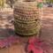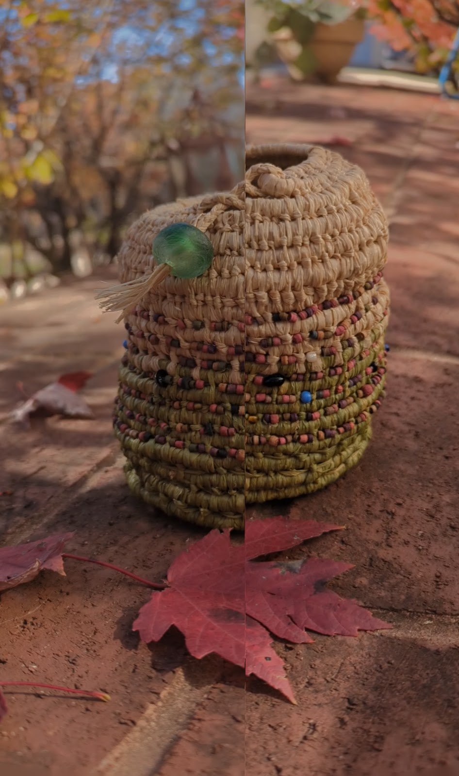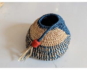 I use a coiling technique to build the form of each basket and add color and embellishments to suit my vision. Raffia is naturally water repellent, but I coat each piece with a light finish of beeswax to make it easy to dust and maintain.