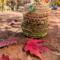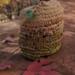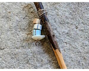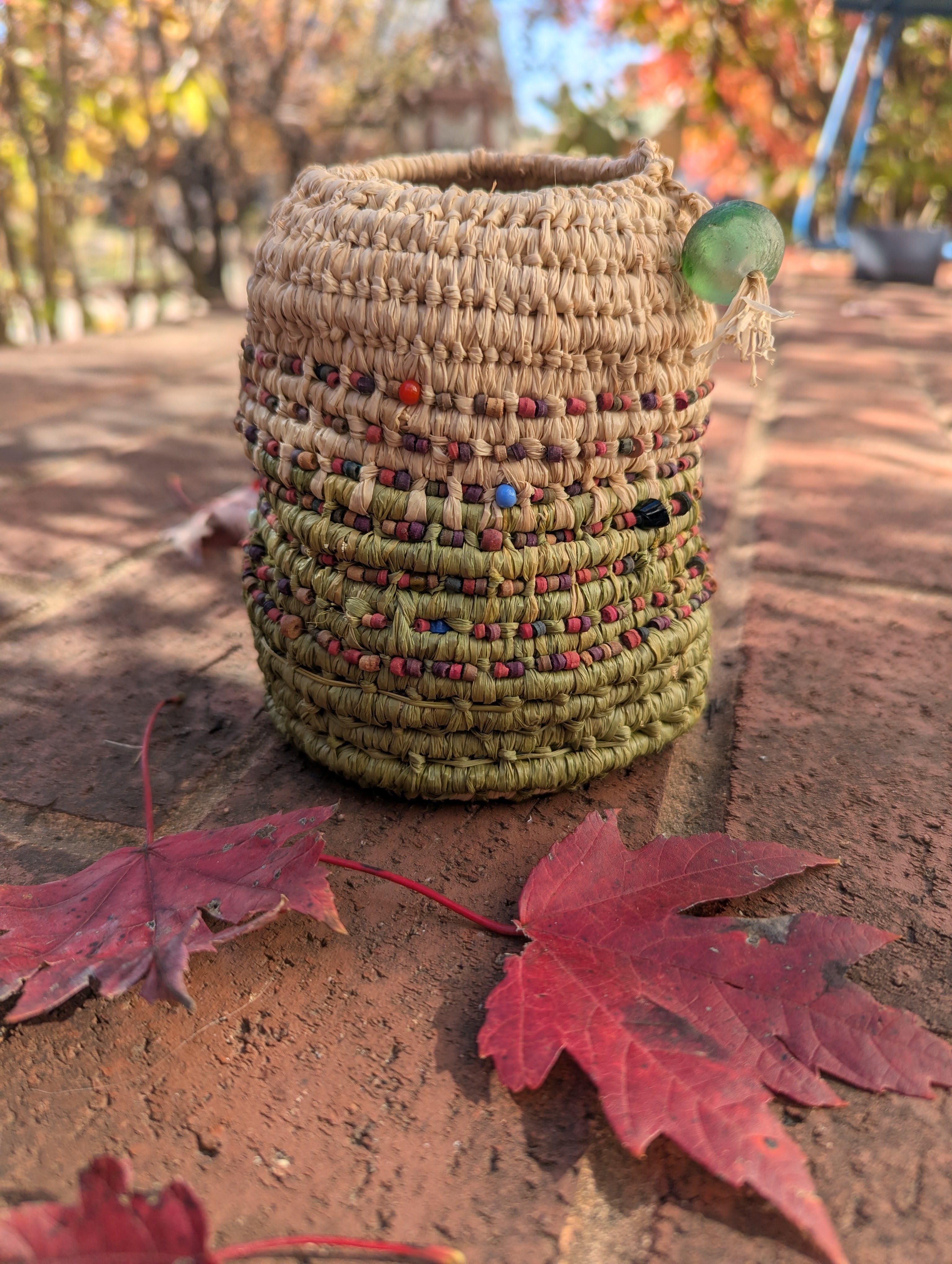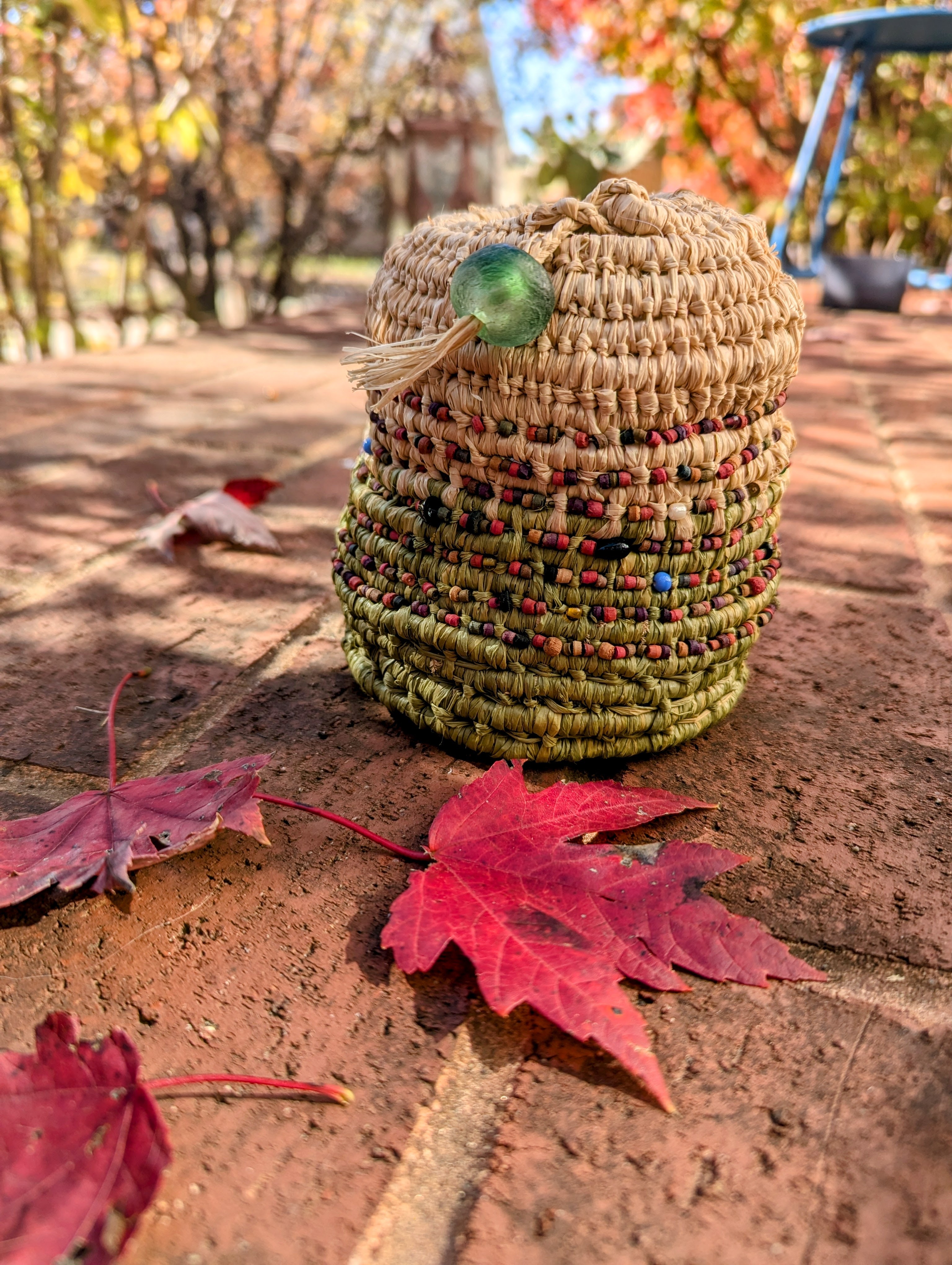 I source and prepare my basket-weaving materials from sustainable manufacturers or from my own property. The embellishments I use are gathered during my forest rambles, city walks, or travels. I am drawn to the old, the intricate, the unusual items I find on the street or in nature. I often hand-dye my materials and fabrics. My weaving techniques are traditional, but I strive to include a mark of my own personality rather than simply copying another tradition exactly. This basket features beads made from a hollow reed, and beads of glass. It is finished with a large green glass bead found on a beach.