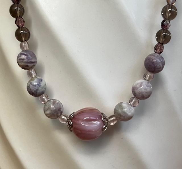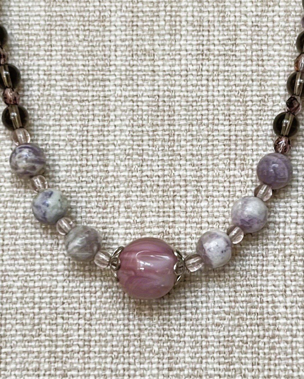 A necklace made with semiprecious stones and beads. A bead, made from a seashell, becomes the center focal point. Colors are a mix of purple, lavender, and smoky quartz. Sterling silver chain and a lobster claw closure meet at the at the nape of the neck.